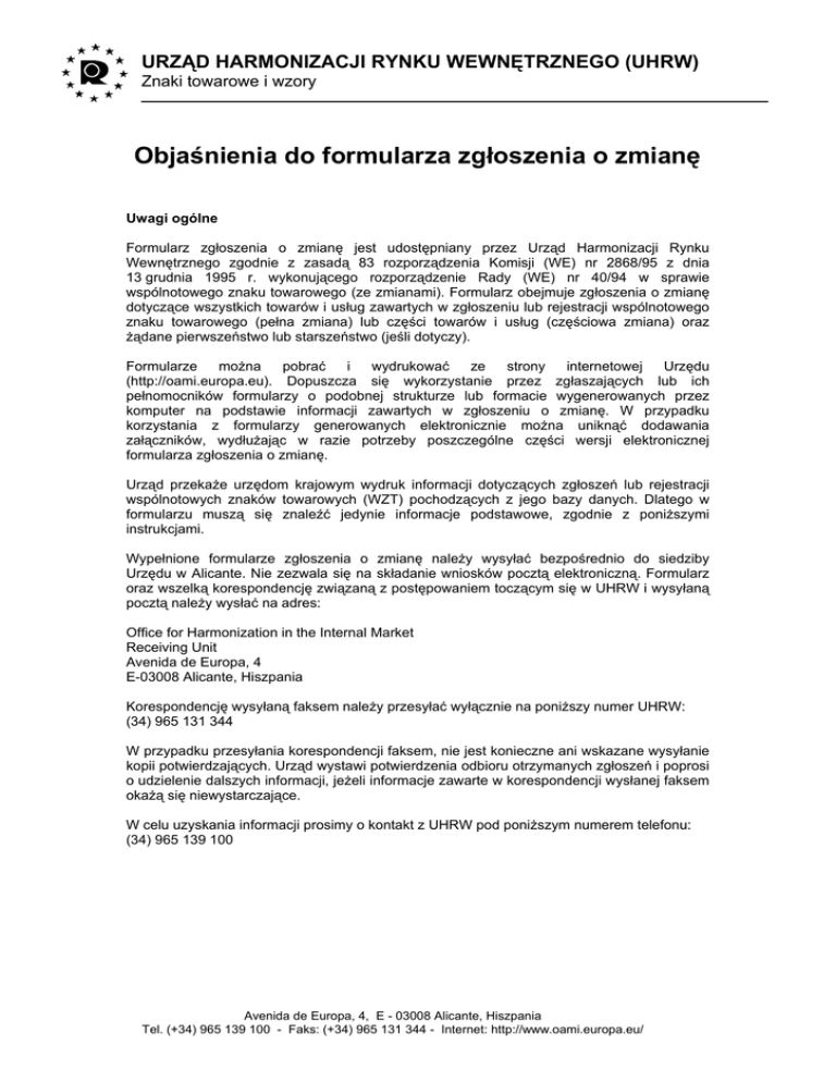 URZĄD HARMONIZACJI RYNKU WEWNĘTRZNEGO (UHRW) Znaki towarowe i wzory Objaśnienia do formularza zgłoszenia o zmianę Uwagi ogólne Formularz zgłoszenia o zmianę jest udostępniany przez Urząd Harmonizacji Rynku Wewnętrznego zgodnie z zasadą 83 rozporządzenia Komisji (WE) nr 2868/95 z dnia 13 grudnia 1995 r. wykonującego rozporządzenie Rady (WE) nr 40/94 w sprawie wspólnotowego znaku towarowego (ze zmianami). Formularz obejmuje zgłoszenia o zmianę dotyczące wszystkich towarów i usług zawartych w zgłoszeniu lub rejestracji wspólnotowego znaku towarowego (pełna zmiana) lub części towarów i usług (częściowa zmiana) oraz żądane pierwszeństwo lub starszeństwo (jeśli dotyczy). Formularze można pobrać i wydrukować ze strony internetowej Urzędu (http://oami.europa.eu). Dopuszcza się wykorzystanie przez zgłaszających lub ich pełnomocników formularzy o podobnej strukturze lub formacie wygenerowanych przez komputer na podstawie informacji zawartych w zgłoszeniu o zmianę. W przypadku korzystania z formularzy generowanych elektronicznie można uniknąć dodawania załączników, wydłużając w razie potrzeby poszczególne części wersji elektronicznej formularza zgłoszenia o zmianę. Urząd przekaże urzędom krajowym wydruk informacji dotyczących zgłoszeń lub rejestracji wspólnotowych znaków towarowych (WZT) pochodzących z jego bazy danych. Dlatego w formularzu muszą się znaleźć jedynie informacje podstawowe, zgodnie z poniższymi instrukcjami. Wypełnione formularze zgłoszenia o zmianę należy wysyłać bezpośrednio do siedziby Urzędu w Alicante. Nie zezwala się na składanie wniosków pocztą elektroniczną. Formularz oraz wszelką korespondencję związaną z postępowaniem toczącym się w UHRW i wysyłaną pocztą należy wysłać na adres: Office for Harmonization in the Internal Market Receiving Unit Avenida de Europa, 4 E-03008 Alicante, Hiszpania Korespondencję wysyłaną faksem należy przesyłać wyłącznie na poniższy numer UHRW: (34) 965 131 344 W przypadku przesyłania korespondencji faksem, nie jest konieczne ani wskazane wysyłanie kopii potwierdzających. Urząd wystawi potwierdzenia odbioru otrzymanych zgłoszeń i poprosi o udzielenie dalszych informacji, jeżeli informacje zawarte w korespondencji wysłanej faksem okażą się niewystarczające. W celu uzyskania informacji prosimy o kontakt z UHRW pod poniższym numerem telefonu: (34) 965 139 100 Avenida de Europa, 4, E - 03008 Alicante, Hiszpania Tel. (+34) 965 139 100 - Faks: (+34) 965 131 344 - Internet: http://www.oami.europa.eu/ Objaśnienia do formularza zgłoszenia o zmianę Liczba stron Należy określić liczbę wszystkich wysłanych stron. Oznaczenie zgłaszającego lub pełnomocnika Zgłaszający lub jego pełnomocnik może podać oznaczenie własne, które nie powinno zawierać więcej niż 20 znaków, na górze strony 1. Urząd będzie korzystał z tego oznaczenia w całej wysyłanej przez siebie korespondencji. Pole 1: Numer WZT zgłoszenia lub rejestracji Należy podać wyłączny numer WZT. Pole 2: Język Zgodnie z zasadą 95 RWWZT, zgłaszający musi wybrać język postępowania w sprawie zmiany. W przypadku gdy wniosek o zmianę odnosi się do zgłoszenia wspólnotowego znaku towarowego, zgłaszający może wybrać albo pierwszy, albo drugi język wskazany w zgłoszeniu. W przypadku gdy wniosek o zmianę odnosi się do rejestracji wspólnotowego znaku towarowego, zgłaszający może wybrać dowolny z pięciu języków Urzędu (ES, DE, EN, FR, IT). Niniejszy formularz można wypełniać w którymkolwiek z języków urzędowych WE, z zastrzeżeniem, iż zostanie on wypełniony w języku, w którym występuje „część tekstowa” postępowania w sprawie zmiany. Pole 3: Słowna część znaku Jeżeli znak zawiera element słowny, element ten należy umieścić w tym polu. Jeżeli znak nie ma charakteru słownego, Urząd dostarczy kopię znaku urzędom krajowym. Pole 4: Zgłaszający Należy wskazać imię i nazwisko lub nazwę zgłaszającego. Nazwy osób prawnych oraz organów uwzględnionych w art. 3 rozporządzenia Rady (WE) nr 207/2009 z dnia 26 lutego 2009 r. w sprawie wspólnotowego znaku towarowego (ze zmianami) („RWZT”) należy podać zgodnie z ich oficjalnym brzmieniem, a także podać formę prawną podmiotu, która może być skrócona w zwyczajowy sposób. Inne informacje, takie jak numer telefonu itp., zostaną pobrane z bazy danych Urzędu. Dlatego umieszczanie takich dodatkowych danych w formularzu zgłoszenia o zmianę nie jest konieczne. Jeżeli Urząd już wcześniej przydzielił zgłaszającemu numer identyfikacyjny i nie nastąpiła żadna zmiana nazwy ani adresu, wówczas należy podać ten numer identyfikacyjny. Rubryka dotycząca formy prawnej jest obowiązkowa dla osób prawnych. W przypadku zmiany adresu, należy skierować do Urzędu oddzielny wniosek o zarejestrowanie zmiany danych dla istniejącego (-ych) numeru (-ów) identyfikacyjnego (-ych). Pole 5: Pełnomocnik zawodowy Pełnomocnictwo pełnione przez pełnomocnika zawodowego jest obowiązkowe w przypadku wszystkich zgłaszających, którzy nie posiadają ani miejsca zamieszkania, ani siedziby, ani faktycznej placówki przemysłowej lub handlowej we Wspólnocie Europejskiej. Wszyscy inni zgłaszający mają wolny wybór w zakresie powoływania pełnomocnika. Pełnomocnictwo przed Urzędem mogą pełnić wyłącznie pełnomocnicy zawodowi należący do jednej z dwóch następujących kategorii (art. 93 ust. 1 lit. a) i b) RWZT): - wszelkie osoby wykonujące zawód prawnika, mające odpowiednie kwalifikacje w jednym z państw członkowskich, uprawnione do działania w państwie członkowskim jako pełnomocnicy w sprawach dotyczących znaków towarowych, i które posiadają miejsce prowadzenia działalności we Wspólnocie Europejskiej; lub 2 Objaśnienia do formularza zgłoszenia o zmianę - zawodowi pełnomocnicy, których nazwiska znajdują się w wykazie prowadzonym 