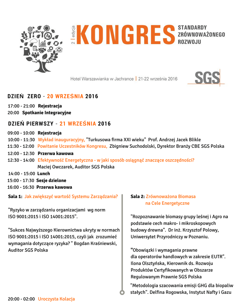 DANIEL KENNEDY Senior Community Manager DZIEŃ ZERO - 20 WRZEŚNIA 2016 17:00 - 21:00 Rejestracja 20:00 Spotkanie Integracyjne DZIEŃ PIERWSZY - 21 WRZEŚNIA 2016 09:00 - 10:00 Rejestracja 10:00 - 11:30 Wykład inauguracyjny, "Turkusowa firma XXI wieku" Prof. Andrzej Jacek Blikle 11:30 - 12:00 Powitanie Uczestników Kongresu, Zbigniew Suchodolski, Dyrektor Branży CBE SGS Polska 12:00 - 12:30 Przerwa kawowa 12:30 - 14:00 Efektywność Energetyczna - w jaki sposób osiągnąć znaczące oszczędności? Maciej Owczarek, Auditor SGS Polska 14:00 - 15:00 Lunch 15:00 - 17:30 Sesje dzielone 16:00 - 16:30 Przerwa kawowa Sala 1: Jak zwiększyć wartość Systemu Zarządzania? "Ryzyko w zarządzaniu organizacjami wg norm ISO 9001:2015 i ISO 14001:2015". "Sukces Najwyższego Kierownictwa ukryty w normach ISO 9001:2015 i ISO 14001:2015, czyli jak zrozumieć wymagania dotyczące ryzyka? " Bogdan Kraśniewski, Auditor SGS Polska Sala 2: Zrównoważona Biomasa na Cele Energetyczne "Rozpoznawanie biomasy grupy leśnej i Agro na podstawie cech makro- i mikroskopowych budowy drewna". Dr inż. Krzysztof Polowy, Uniwersytet Przyrodniczy w Poznaniu. "Obowiązki i wymagania prawne dla operatorów handlowych w zakresie EUTR". Ilona Olsztyńska, Kierownik ds. Rozwoju Produktów Certyfikowanych w Obszarze Regulowanym Prawnie SGS Polska "Metodologia szacowania emisji GHG dla biopaliw stałych". Delfina Rogowska, Instytut Nafty i Gazu 20:00 - 02:00 Uroczysta Kolacja DZIEŃ DRUGI - 22 WRZEŚNIA 2016 08:00 - 10:00 Śniadanie 10:00 - 11:45 Sesje dzielone Sala 1: Najlepsze Praktyki BHP Sala 2: Nowe Standardy FSC "Jak dzięki certyfikatom podnieść standardy w miejscu pracy?" Małgorzata Góra, Coca-Cola HBC Polska Sp. z o.o. "Nowelizacja standardu Certyfikacji kontroli pochodzenia produktu - FSC-STD-40-004 V3-0 oraz Wymogów dla zaopatrywania się w Drewno kontrolowane FSC® - FSCSTD-40-005 V3-0 - przegląd zmian". Ewa Pieczyrak, Specjalista ds. certyfikacji FSC CoC SGS Polska; Sebastian Drzewiecki, Kierownik ds. Rozwoju Branży Leśnej i Przemysłu Drzewnego SGS Polska "Nowa norma ISO 45001. Wymagania systemu zarządzania bezpieczeństwem i higieną pracy”. Andrzej Kufel, Auditor SGS Polska 11:45 - 12:15 Przerwa kawowa 12:15 - 14:00 Sesje dzielone Sala 1: Zrównoważony Rozwój w Branży Motoryzacyjnej Sala 2: Zapewnienie Ciągłości Działania w Organizacjach Sala 3: Zarządzanie Bezpieczeństwem Żywności "Zrównoważony rozwój w branży motoryzacyjnej". Dominik Wawrzyniak, Faurecia "Zabezpieczenie ciągłości prowadzenia biznesu w dzisiejszych realiach praktyczne korzyści z wdrożenia standardów ISO 22301 i 27001". Krzysztof Gawecki, Auditor SGS Polska " Co nowego w IFS Food wyzwania dla branżny spożywczej". Marek Marzec, Przedstawiciel ds. Standardu IFS na Europę Środkową i Wschodnią "Strategia rozwoju systemu zarządzania ISO/TS 16494 wg światowego zrzeszenia przemysłu motoryzacyjnego IATF - " Raising the Bar" w praktyce". Maciej Nowiński, Auditor SGS Polska "BCMS - poznaj swój bank i bądź niezniszczalny". Paweł Wąsik, Krakowski Bank Spółdzielczy "Food defense, czyli jak chronić żywność przed intencjonalnym zanieczyszczeniem". Małgorzata Galczak, Manger sektora żywnościowego SGS Polska "Elementy Lean w zarządzaniu jakością; wizualizacja standardów na liniach produkcyjnych". Sławomir Wasilewski, BNA Nutrition Animale 14:15 - 14:45 Uroczyste podsumowanie Kongresu Wręczenie certyfikatów oraz losowanie nagród 14:45 - 16:00 Lunch