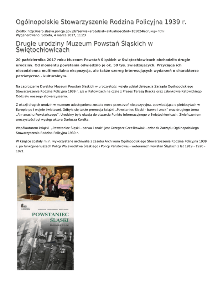 Ogólnopolskie Stowarzyszenie Rodzina Policyjna 1939 r. Źródło: http://osrp.slaska.policja.gov.pl/?serwis=srp&dzial=aktualnosci&id=185024&drukuj=html Wygenerowano: Sobota, 4 marca 2017, 11:23 Drugie urodziny Muzeum Powstań Śląskich w Świętochłowicach 20 października 2017 roku Muzeum Powstań Śląskich w Świętochłowicach obchodziło drugie urodziny. Od momentu powstania odwiedziło je ok. 50 tys. zwiedzających. Przyciąga ich niecodzienna multimedialna ekspozycja, ale także szereg interesujących wydarzeń o charakterze patriotyczno - kulturalnym. Na zaproszenie Dyrektor Muzeum Powstań Śląskich w uroczystości wzięła udział delegacja Zarządu Ogólnopolskiego Stowarzyszenia Rodzina Policyjna 1939 r. z/s w Katowicach na czele z Prezes Teresą Bracką oraz członkowie Katowickiego Oddziału naszego stowarzyszenia. Z okazji drugich urodzin w muzeum udostępniona została nowa przestrzeń ekspozycyjna, opowiadająca o plebiscytach w Europie po I wojnie światowej. Odbyła się także promocja książki „Powstaniec Śląski – barwa i znak” oraz drugiego tomu „Almanachu Powstańczego”. Urodziny były okazją do otwarcia Punktu Informacyjnego o Świętochłowicach. Zwieńczeniem uroczystości był występ aktora Dariusza Kordka. Współautorem książki „Powstaniec Śląski - barwa i znak” jest Grzegorz Grześkowiak - członek Zarządu Ogólnopolskiego Stowarzyszenia Rodzina Policyjna 1939 r. W książce zostały m.in. wykorzystane archiwalia z zasobu Archiwum Ogólnopolskiego Stowarzyszenia Rodzina Policyjna 1939 r. po funkcjonariuszach Policji Województwa Śląskiego i Policji Państwowej - weteranach Powstań Śląskich z lat 1919 - 1920 1921. Ocena: 0/5 (0) Tweetnij