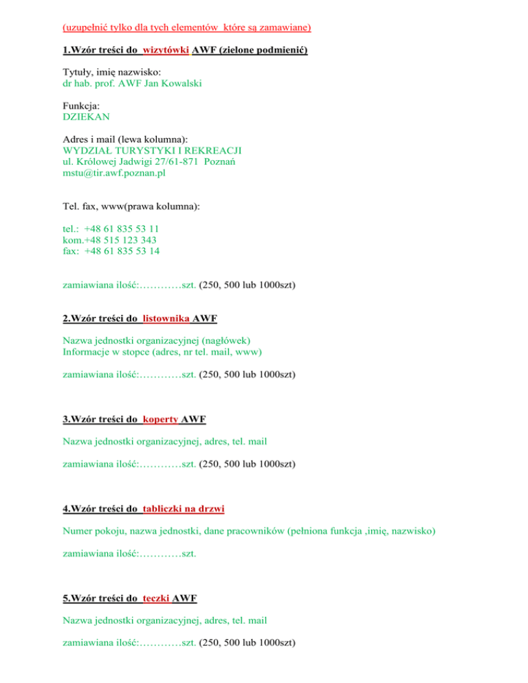 (uzupełnić tylko dla tych elementów które są zamawiane) 1.Wzór treści do wizytówki AWF (zielone podmienić) Tytuły, imię nazwisko: dr hab. prof. AWF Jan Kowalski Funkcja: DZIEKAN Adres i mail (lewa kolumna): WYDZIAŁ TURYSTYKI I REKREACJI ul. Królowej Jadwigi 27/61-871 Poznań [email protected] Tel. fax, www(prawa kolumna): tel.: +48 61 835 53 11 kom.+48 515 123 343 fax: +48 61 835 53 14 zamiawiana ilość:…………szt. (250, 500 lub 1000szt) 2.Wzór treści do listownika AWF Nazwa jednostki organizacyjnej (nagłówek) Informacje w stopce (adres, nr tel. mail, www) zamiawiana ilość:…………szt. (250, 500 lub 1000szt) 3.Wzór treści do koperty AWF Nazwa jednostki organizacyjnej, adres, tel. mail zamiawiana ilość:…………szt. (250, 500 lub 1000szt) 4.Wzór treści do tabliczki na drzwi Numer pokoju, nazwa jednostki, dane pracowników (pełniona funkcja ,imię, nazwisko) zamiawiana ilość:…………szt. 5.Wzór treści do teczki AWF Nazwa jednostki organizacyjnej, adres, tel. mail zamiawiana ilość:…………szt. (250, 500 lub 1000szt)