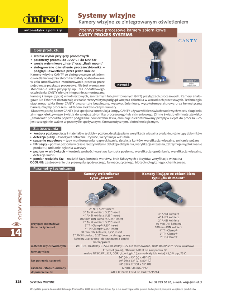 Systemy wizyjne Kamery wizyjne ze zintegrowanym oświetleniem Przemysłowe procesowe kamery zbiornikowe CANTY PROCES SYSTEMS CANTY Opis produktu • • • • szeroki wybór przyłączy procesowych parametry procesu do 1090°C i do 690 bar wersje wziernikowe „insert” oraz „flush mount” zintegrowane oświetlenie procesu/zbiornika – podgląd i oświetlenie przez jeden króciec Kamery wizyjne CANTY ze zintegrowanym układem oświetlenia wnętrza zbiornika zostały opatentowane made in w celu umożliwienia monitorowania procesu przez USA IRELAND pojedyncze przyłącze procesowe. Nie jest wymagane stosowanie kilku przyłączy np.: dla dodatkowego oświetlenia. CANTY oferuje integralnie zamontowaną kamerę i lampę (opcja) w kołnierzowych, sanitarnych lub gwintowanych (NPT) przyłączach procesowych. Kamery analogowe lub Ethernet dostarczają w czasie rzeczywistym podgląd wnętrza zbiornika w warunkach procesowych. Technologia stapianego szkła firmy CANTY gwarantuje bezpieczną, wysokociśnieniową, wysokotemperaturową oraz hermetyczną barierę między procesem i układem elektronicznym kamery. Kluczową cechą kamer CANTY jest specjalna konstrukcja lampy. CANTY używa włókien światłowodowych w celu skupiania zimnego, efektywnego światła do wnętrza zbiornika procesowego lub ciśnieniowego. Zimne światło eliminuje zjawisko „smażenia” produktu poprzez podgrzanie powierzchni szkła, eliminuje niekontrolowany przepływ ciepła do procesu – co jest szczególnie ważne w przemyśle spożywczym, farmaceutycznym, biotechnologicznym. Zastosowania • • • • kontrola poziomu cieczy i materiałów sypkich – poziom, detekcja piany, weryfikacja wizualna produktu, rożne typy zbiorników detekcja piany – tworzywa sztuczne i żywice, weryfikacja wizualna suszenie rozpyłowe – typy monitorowania rozpryskiwania, detekcja korków, weryfikacja wizualna, unikanie pożaru filtr ssący – pomiar poziomu w czasie rzeczywistym i detekcja oblepienia, weryfikacja wizualna, zatrzymuje wypłukiwanie produktu, unikanie pękania warstwy • poziom w wirówkach – kontrola grubości warstwy, kontrola poziomu, weryfikacja opróżniania, weryfikacja wizualna, detekcja koloru • pomiar rozdziału faz – rozdział fazy, kontrola warstwy, brak fałszywych odczytów, weryfikacja wizualna OGÓLNIE: zastosowanie dla przemysłu spożywczego, farmaceutycznego, biotechnologicznego, chemicznego. Parametry techniczne SYSTEMY WIZYJNE Kamery wziernikowe typu „insert” 14 przyłącza montażowe (inne na życzenie) materiał części zwilżanych formaty video kąt patrzenia soczewki zasilanie /stopień ochrony dopuszczenie Ex 328 SYSTEMY WIZYJNE Kamery licujące ze zbiornikiem typu „flush mount” 2” NPT, 5,25” insert 3” ANSI kołnierz, 5,25” insert 3” ANSI kołnierz 4” ANSI kołnierz, 5,25” insert 4” ANSI kołnierz 100 mm DIN kołnierz, 5,25” insert 2” ANSI kołnierz 2” ANSI kołnierz, 5,25” insert 80 mm DIN kołnierz 3” Tri-Clamp® 5,25” insert 100 mm DIN kołnierz 4” Tri-Clamp® 5,25” insert 4” Tri-Clamp® 80 mm DIN kołnierz, 5,25” insert 2” Tri-Clamp® 2” ANSI kołnierz, 5,25” insert + zintegrowany 3” Tri-Clamp® kołnierz „spray ring” do czyszczenia optyki cieczą/gazem stal 316L, Hastelloy C-276/ Hastelloy C-22 lub równoważne, szkło BoroPlusTM, szkło kwarcowe Ethernet (kolor), Ethernet NIR IR do komputera PC analog NTSC, PAL, EIA, CCIR, „Low Light” (czarno-biały lub kolor) / 1,0 V p-p, 75 Ω 56° (H) x 43° (V) x 69° (D) 69° (H) x 53° (V) x 80° (D) 41° (H) x 31° (V) x 50° (D) 12 VDC 500mA /IP66 ATEX II 1/2GD EEx d IIC IP6X T6/T5/T4 tel. 32 789 00 20, e-mail: [email protected] Wszystkie prawa do całości Katalogu Produktów 2014 zastrzeżone. Introl Sp. z o.o. zastrzega sobie prawo do błędów i pomyłek w opisach produktów