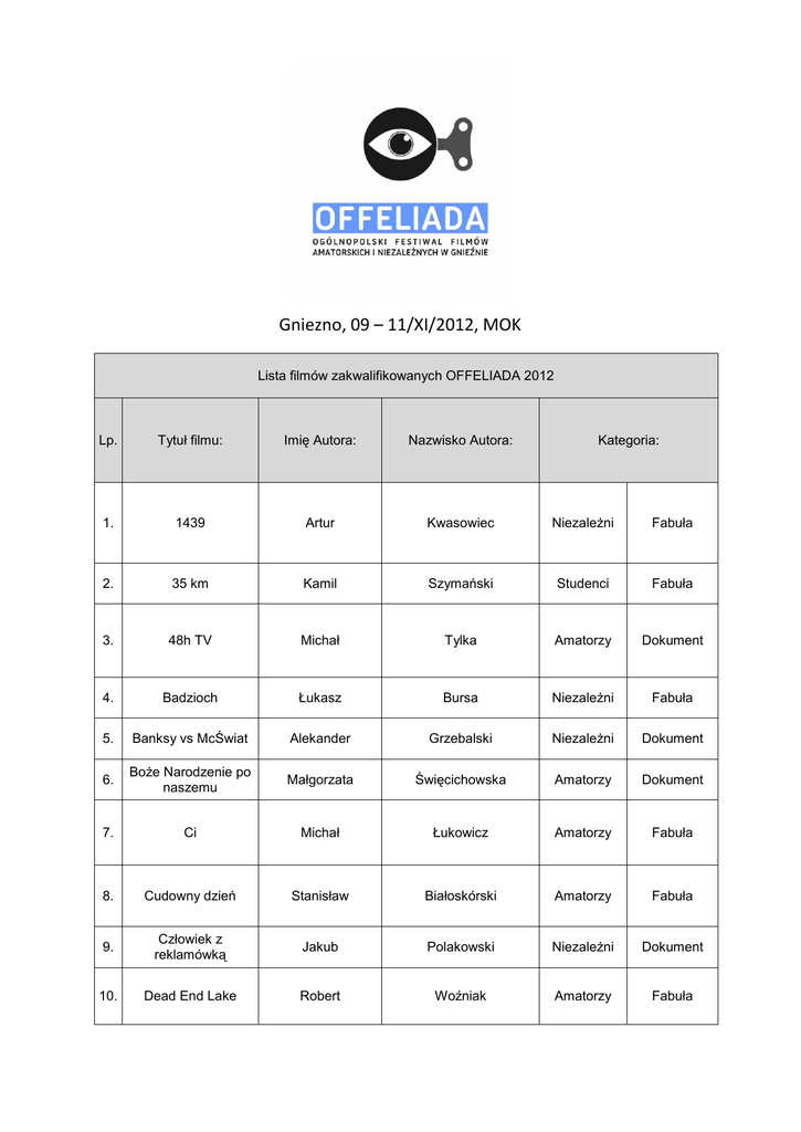 Gniezno, 09 – 11/XI/2012, MOK Lista filmów zakwalifikowanych OFFELIADA 2012 Lp. Tytuł filmu: Imię Autora: Nazwisko Autora: 1. 1439 Artur Kwasowiec Niezależni Fabuła 2. 35 km Kamil Szymański Studenci Fabuła 3. 48h TV Michał Tylka Amatorzy Dokument 4. Badzioch Łukasz Bursa Niezależni Fabuła 5. Banksy vs McŚwiat Alekander Grzebalski Niezależni Dokument 6. Boże Narodzenie po naszemu Małgorzata Święcichowska Amatorzy Dokument 7. Ci Michał Łukowicz Amatorzy Fabuła 8. Cudowny dzień Stanisław Białoskórski Amatorzy Fabuła 9. Człowiek z reklamówką Jakub Polakowski Niezależni Dokument 10. Dead End Lake Robert Woźniak Amatorzy Fabuła Kategoria: 11. Errata Arek Biedrzycki Studenci Fabuła 12. Francois Tomasz Góralczyk Amatorzy Fabuła 13. Historia z parą w tle Piotr Robakowski Niezależni Dokument 14. Itihasa Malwina Rzonca Niezależni Fabuła 15. Jak mi nie wyszło Natalia Kostenko Niezależni Fabuła 16. Jestem drzewem Dariusz Gapski Studenci Dokument 17. Karma Agnieszka/Dominik Opyt/Krawczyk Amatorzy Dokument 18. Kiedy ranne wstają zorze Mateusz Głowacki Studenci Fabuła 19. Konstruktor Tessa Moult-Milewska Studenci Animacja 20. Krok do wieczności Błażej Kujawa Niezależni Fabuła 21. Łowca Mateusz Pastewka Studenci Fabuła 22. Macica Anna Kosińska Amatorzy Animacja 23. Martwe dzieci Mateusz/Paweł Pyza/Son Ngo Niezależni Fabuła 24. Miruna Piotr Sułkowski Studenci Fabuła 25. Muka! Kordian Kądziela Studenci Fabuła 26. Niedoczekanie Łukasz Rembas Amatorzy Animacja 27. Obraz idealny Artur Zawisza Amatorzy Animacja 28. Panoptikon Anna Dubielis Studenci Dokument 29. Portret pewnego osiedla Paweł Wroński Amatorzy Dokument 30. Protokoły Mędrców Syjonu Bartosz Warwas Studenci Fabuła 31. Pryzmat Elwira Ginalska Niezaleźni Animacja 32. Przeznaczenie Łukasz/Rafał Więckowski/Wichniewicz Amatorzy Fabuła Romeo i Hanna, 33. czyli Miłość, Śmierć, Ubóstwo Paweł Cichoński Amatorzy Fabuła 34. Ruszyli! 28 Grudnia 1918 Radosław Biskupski Amatorzy Fabuła 35. Sójka Mateusz Ciompała Studenci Animacja 36. Spermbank Irex Janion Amatorzy Fabuła 37. Substytut Maciej Wiktor Amatorzy Fabuła 38. Taki typ ptactwa Małgorzata Goliszewska Amatorzy Dokument 39. Topielec Piotr Putko Studenci Fabuła 40. Twarzą w twarz Marcin Lesisz Studenci Fabuła 41. Vocuus Patryk Jurek Niezaleźni Fabuła 42. Wiesiek Bartosz Kruhlik Studenci Fabuła 43. WyręczonyZaręczony Piotr Matwiejczyk Niezaleźni Fabuła 44. Wyrwać się, by zaistnieć Tomasz Góralczyk Amatorzy Dokument 45. Zabawka Piotr Iskra Niezaleźni Fabuła 46. Zgrzyt Michał Mróz Niezaleźni Animacja 47. Życie to gra Dariusz/Bartosz Jankowski/Śmigielski Amatorzy Dokument