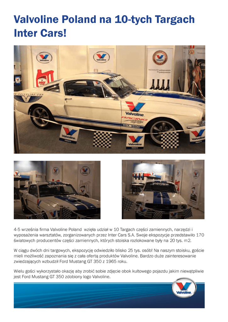 Valvoline Poland na 10-tych Targach Inter Cars! 4-5 września firma Valvoline Poland wzięła udział w 10 Targach części zamiennych, narzędzi i wyposażenia warsztatów, zorganizowanych przez Inter Cars S.A. Swoje ekspozycje przedstawiło 170 światowych producentów części zamiennych, których stoiska rozlokowane były na 20 tys. m2. W ciągu dwóch dni targowych, ekspozycję odwiedziło blisko 25 tys. osób! Na naszym stoisku, goście mieli możliwość zapoznania się z cała ofertą produktów Valvoline. Bardzo duże zainteresowanie zwiedzających wzbudził Ford Mustang GT 350 z 1965 roku. Wielu gości wykorzystało okazję aby zrobić sobie zdjęcie obok kultowego pojazdu jakim niewątpliwie jest Ford Mustang GT 350 zdobiony logo Valvoline.