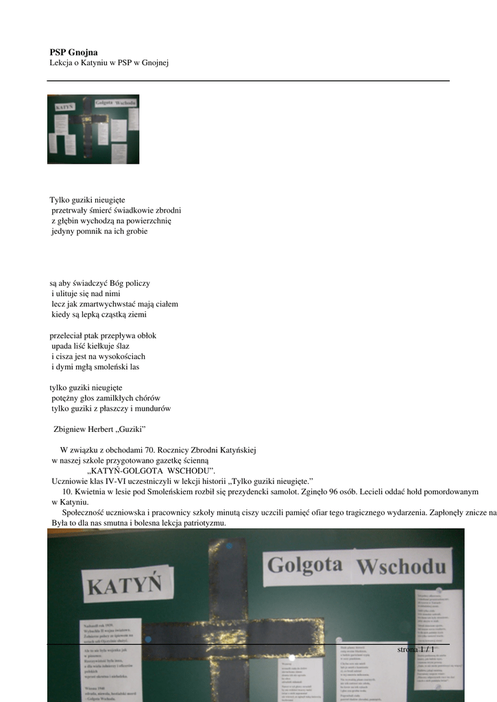 PSP Gnojna Lekcja o Katyniu w PSP w Gnojnej Tylko guziki nieugięte przetrwały śmierć świadkowie zbrodni z głębin wychodzą na powierzchnię jedyny pomnik na ich grobie są aby świadczyć Bóg policzy i ulituje się nad nimi lecz jak zmartwychwstać mają ciałem kiedy są lepką cząstką ziemi przeleciał ptak przepływa obłok upada liść kiełkuje ślaz i cisza jest na wysokościach i dymi mgłą smoleński las tylko guziki nieugięte potężny głos zamilkłych chórów tylko guziki z płaszczy i mundurów Zbigniew Herbert „Guziki” W związku z obchodami 70. Rocznicy Zbrodni Katyńskiej w naszej szkole przygotowano gazetkę ścienną „KATYŃ-GOLGOTA WSCHODU”. Uczniowie klas IV-VI uczestniczyli w lekcji historii „Tylko guziki nieugięte.” 10. Kwietnia w lesie pod Smoleńskiem rozbił się prezydencki samolot. Zginęło 96 osób. Lecieli oddać hołd pomordowanym w Katyniu. Społeczność uczniowska i pracownicy szkoły minutą ciszy uczcili pamięć ofiar tego tragicznego wydarzenia. Zapłonęły znicze na Była to dla nas smutna i bolesna lekcja patriotyzmu. strona 1 / 1