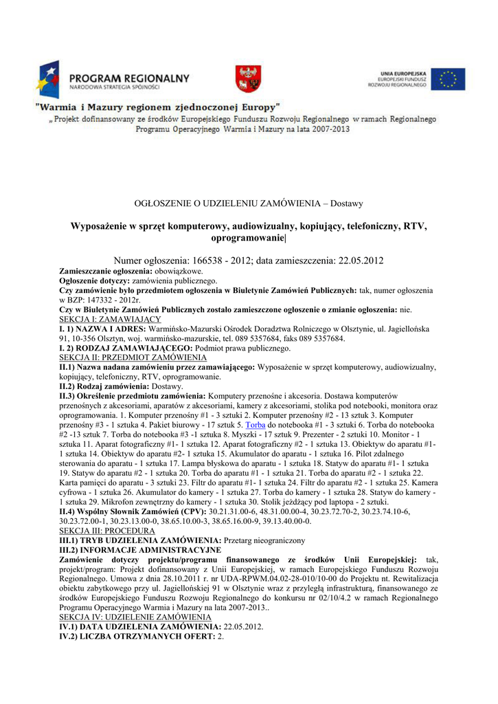 OGŁOSZENIE O UDZIELENIU ZAMÓWIENIA – Dostawy Wyposażenie w sprzęt komputerowy, audiowizualny, kopiujący, telefoniczny, RTV, oprogramowanie| Numer ogłoszenia: 166538 - 2012; data zamieszczenia: 22.05.2012 Zamieszczanie ogłoszenia: obowiązkowe. Ogłoszenie dotyczy: zamówienia publicznego. Czy zamówienie było przedmiotem ogłoszenia w Biuletynie Zamówień Publicznych: tak, numer ogłoszenia w BZP: 147332 - 2012r. Czy w Biuletynie Zamówień Publicznych zostało zamieszczone ogłoszenie o zmianie ogłoszenia: nie. SEKCJA I: ZAMAWIAJĄCY I. 1) NAZWA I ADRES: Warmińsko-Mazurski Ośrodek Doradztwa Rolniczego w Olsztynie, ul. Jagiellońska 91, 10-356 Olsztyn, woj. warmińsko-mazurskie, tel. 089 5357684, faks 089 5357684. I. 2) RODZAJ ZAMAWIAJĄCEGO: Podmiot prawa publicznego. SEKCJA II: PRZEDMIOT ZAMÓWIENIA II.1) Nazwa nadana zamówieniu przez zamawiającego: Wyposażenie w sprzęt komputerowy, audiowizualny, kopiujący, telefoniczny, RTV, oprogramowanie. II.2) Rodzaj zamówienia: Dostawy. II.3) Określenie przedmiotu zamówienia: Komputery przenośne i akcesoria. Dostawa komputerów przenośnych z akcesoriami, aparatów z akcesoriami, kamery z akcesoriami, stolika pod notebooki, monitora oraz oprogramowania. 1. Komputer przenośny #1 - 3 sztuki 2. Komputer przenośny #2 - 13 sztuk 3. Komputer przenośny #3 - 1 sztuka 4. Pakiet biurowy - 17 sztuk 5. Torba do notebooka #1 - 3 sztuki 6. Torba do notebooka #2 -13 sztuk 7. Torba do notebooka #3 -1 sztuka 8. Myszki - 17 sztuk 9. Prezenter - 2 sztuki 10. Monitor - 1 sztuka 11. Aparat fotograficzny #1- 1 sztuka 12. Aparat fotograficzny #2 - 1 sztuka 13. Obiektyw do aparatu #11 sztuka 14. Obiektyw do aparatu #2- 1 sztuka 15. Akumulator do aparatu - 1 sztuka 16. Pilot zdalnego sterowania do aparatu - 1 sztuka 17. Lampa błyskowa do aparatu - 1 sztuka 18. Statyw do aparatu #1- 1 sztuka 19. Statyw do aparatu #2 - 1 sztuka 20. Torba do aparatu #1 - 1 sztuka 21. Torba do aparatu #2 - 1 sztuka 22. Karta pamięci do aparatu - 3 sztuki 23. Filtr do aparatu #1- 1 sztuka 24. Filtr do aparatu #2 - 1 sztuka 25. Kamera cyfrowa - 1 sztuka 26. Akumulator do kamery - 1 sztuka 27. Torba do kamery - 1 sztuka 28. Statyw do kamery 1 sztuka 29. Mikrofon zewnętrzny do kamery - 1 sztuka 30. Stolik jeżdżący pod laptopa - 2 sztuki. II.4) Wspólny Słownik Zamówień (CPV): 30.21.31.00-6, 48.31.00.00-4, 30.23.72.70-2, 30.23.74.10-6, 30.23.72.00-1, 30.23.13.00-0, 38.65.10.00-3, 38.65.16.00-9, 39.13.40.00-0. SEKCJA III: PROCEDURA III.1) TRYB UDZIELENIA ZAMÓWIENIA: Przetarg nieograniczony III.2) INFORMACJE ADMINISTRACYJNE Zamówienie dotyczy projektu/programu finansowanego ze środków Unii Europejskiej: tak, projekt/program: Projekt dofinansowany z Unii Europejskiej, w ramach Europejskiego Funduszu Rozwoju Regionalnego. Umowa z dnia 28.10.2011 r. nr UDA-RPWM.04.02-28-010/10-00 do Projektu nt. Rewitalizacja obiektu zabytkowego przy ul. Jagiellońskiej 91 w Olsztynie wraz z przyległą infrastrukturą, finansowanego ze środków Europejskiego Funduszu Rozwoju Regionalnego do konkursu nr 02/10/4.2 w ramach Regionalnego Programu Operacyjnego Warmia i Mazury na lata 2007-2013.. SEKCJA IV: UDZIELENIE ZAMÓWIENIA IV.1) DATA UDZIELENIA ZAMÓWIENIA: 22.05.2012. IV.2) LICZBA OTRZYMANYCH OFERT: 2. IV.3) LICZBA ODRZUCONYCH OFERT: 0. IV.4) NAZWA I ADRES WYKONAWCY, KTÓREMU UDZIELONO ZAMÓWIENIA: K&M Radosław Mazurek, Wojciech Kluge s.j., 82-300 Elbląg, ul. Hetmańska 3K, ul. Hetmańska 3K, 82-300 Elbląg, kraj/woj. warmińsko-mazurskie. IV.5) Szacunkowa wartość zamówienia (bez VAT): 83690,85 PLN. IV.6) INFORMACJA O CENIE WYBRANEJ OFERTY ORAZ O OFERTACH Z NAJNIŻSZĄ I NAJWYŻSZĄ CENĄ Cena wybranej oferty: 106 579,00 Oferta z najniższą ceną: 106 579,00 / Oferta z najwyższą ceną: 108 990,30 Waluta: PLN.