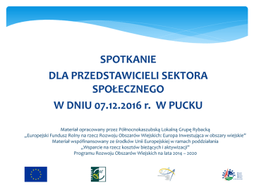 SPOTKANIE DLA PRZEDSTAWICIELI SEKTORA SPOŁECZNEGO W DNIU 07.12.2016 r. W PUCKU Materiał opracowany przez Północnokaszubską Lokalną Grupę Rybacką „Europejski Fundusz Rolny na rzecz Rozwoju Obszarów Wiejskich: Europa Inwestująca w obszary wiejskie” Materiał wspófinansowany ze środków Unii Europejskiej w ramach poddziałania „Wsparcie na rzecz kosztów bieżących i aktywizacji” Programu Rozwoju Obszarów Wiejskich na lata 2014 – 2020 Możliwości pozyskania dofinansowania w ramach konkursów ogłaszanych przez PLGR w ramach Programu Rozwoju Obszarów Wiejskich na lata 2014 – 2020 (PROW) Kto może być beneficjentem: 1. osoba fizyczna, jeżeli: a) jest obywatelem państwa członkowskiego Unii Europejskiej, b) jest pełnoletnia, c) ma miejsce zamieszkania na obszarze PLGR jeżeli nie wykonuje działalności gospodarczej, do której stosuje się przepisy ustawy z dnia 2 lipca 2004 r. o swobodzie działalności gospodarczej (Dz. U. z 2015 r. poz. 584, z późn. zm.2)), d) wykonuje działalność gospodarczą, do której stosuje się przepisy ustawy z dnia 2 lipca 2004 r. o swobodzie działalności gospodarczej, a miejsce oznaczone adresem, pod którym wykonuje działalność gospodarczą, wpisanym do Centralnej Ewidencji i Informacji o Działalności Gospodarczej, znajduje się na obszarze PLGR, Kto może być beneficjentem: 2. osoby prawne tj.: a) Organizacje pozarządowe posiadające osobowość prawną, b) Jednostki samorządu terytorialnego, w tym publiczne szkoły podstawowe, gimnazjalne i ponadgimnazjalne, b) Spółki kapitałowe, d) Podmioty ekonomii społecznej. W przypadku gdy operacja będzie realizowana w ramach wykonywania działalności gospodarczej w formie spółki cywilnej warunki określone w pkt. 1 powinny być spełnione przez wszystkich wspólników tej spółki. Operacje realizowane indywidualnie przez Beneficjentów • Maksymalna wysokość pomocy w ramach LSR ze środków PROW i PO RIM nie może przekroczyć 300 000 tys. zł na jednego beneficjenta, co dotyczy także podmiotów publicznych. • Minimalna całkowita wartość operacji wynosi nie mniej niż 50 tys. dla środków PROW. Minimalna całkowita wartość operacji dla środków PORIM nie została określona. • Maksymalna wysokość wsparcia w formie premii dla osób rozpoczynających działalność gospodarczą wynosi 100 tys. zł. • Intensywność wsparcia dla środków PROW i PORIM wynosi od 50% do 100 % w zależności od poddziałania. Projekty grantowe • Adresowane wyłącznie do organizacji pozarządowych nieprowadzących działalności gospodarczej; • Wartość grantu minimalna 5 tys. zł maksymalna 50 tys. zł Operacje własne PLGR Projekty własne powinny być inicjatywami wspólnymi dla całego obszaru PLGR. W LSR przewidziano dwa przedsięwzięcia wdrażane jako projekty własne: 1.2.1 – „edukacja ekologiczna” oraz 1.4.1 „wspieranie organizacji pozarządowych”. Lokalna Strategia Rozwoju 2014 -2020 (LSR) Cel ogólny 1 - wysoka jakość życia integrująca mieszkańców z miejscem zamieszkania oraz sprzyjająca rozwojowi turystyki. W ramach celu ogólnego wyznaczono 5 celów szczegółowych: 1. Poprawa komunikacji wewnętrznej i dostępności usług społecznych. 2. Ochrona środowiska przyrodniczego oraz udostępnienie i zrównoważone wykorzystanie walorów przyrodniczych. 3. Poprawa atrakcyjności osiedleńczej i turystycznej poprzez rozwój oferty czasu wolnego oraz rozwijanie innowacyjnej oferty turystycznej w oparciu o kulturowe bogactwo obszaru. 4. Rozwój kapitału społecznego oraz profesjonalizacja działania organizacji pozarządowych. 5. Rozwój oddolnych inicjatyw mieszkańców na rzecz innowacyjnego rozwiązywania problemów społecznych – edukacja i integracja społeczności lokalnej. Lokalna Strategia Rozwoju 2014 -2020 (LSR) Cel ogólny 2 Konkurencyjna gospodarka oferująca mieszkańcom atrakcyjne i różnorodne miejsca pracy W ramach celu ogólnego wyznaczono 4 cele szczegółowe 1. Budowa wizerunku obszaru i wzrost jego rozpoznawalności 2. Rozwój przedsiębiorczości i tworzenie miejsc pracy odpowiadających specyfice potencjałów rozwojowych 3. Maksymalizowanie i dywersyfikacja dochodów z rybołówstwa oraz promocja produktów rybołówstwa 4. Efektywna współpraca i promocja na rzecz przedłużenia sezonu turystycznego i zwiększenie dochodów z turystyki 1.2.1 Stworzenie lokalnego modelu edukacji ekologicznej na obszarze PLGR oraz promocja zachowań proekologicznych (PROW); Beneficjenci: Projekt własny PLGR / osoby prawne - organizacje pozarządowe nieprowadzące działalności gospodarczej. Przykładowe przedsięwzięcia: zajęcia edukacyjne w szkołach podstawowych, gimnazjach i ponadgimnazjalnych na obszarze w oparciu o wspólny program edukacyjny, zakup sprzętu i wyposażenia na zajęcia z edukacji ekologicznej, konkursy i warsztaty z zakresu edukacji ekologicznej. Intensywność wsparcia: 100 % 1.3.1 Rozwój ogólnodostępnej, niekomercyjnej infrastruktury rekreacyjnej i kulturalnej, w tym o funkcjach turystycznych (PROW); Beneficjenci: osoby prawne - organizacje pozarządowe Przykładowe przedsięwzięcia: infrastruktura ogólnodostępna sprzyjająca nauce i rekreacji, infrastruktura spędzania czasu wolnego przez mieszkańców na wolnym powietrzu, infrastruktura rekreacyjna i sportowa na potrzeby edukacji morskiej i żeglarskiej, zagospodarowanie centralnych obszarów w miejscowościach, edukacyjne place zabaw dla dzieci , Intensywność wsparcia: 95 % 1.3.3 Inicjatywy lokalne na rzecz zachowania i wykorzystania unikatowych zasobów kultury i dziedzictwa kulturowego oraz wzmacnianie tożsamości lokalnej (PROW) Projekt Grantowy Beneficjenci: organizacje pozarządowe nieprowadzące działalności gospodarczej Przykładowe przedsięwzięcia: organizacja festynów, pikników, jarmarków, zakup przedmiotów umożliwiających realizację działań jak np. stroje, instrumenty, sprzęty, rekwizyty, warsztaty rękodzieła i tradycy