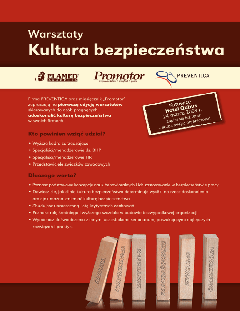Warsztaty Kultura bezpieczeństwa Firma Preventica oraz miesięcznik „Promotor” zapraszają na pierwszą edycję warsztatów skierowanych do osób pragnących udoskonalić kulturę bezpieczeństwa w swoich firmach. Kto powinien wziąć udział? ice Katow ubus Q Hotel ca 2009 r. r 24 maz się już teraz ona! Zapis sc ogranicz a miej – liczb • Wyższa kadra zarządzająca • Specjaliści/menadżerowie ds. BHP • Specjaliści/menadżerowie HR • Przedstawiciele związków zawodowych Dlaczego warto? • P oznasz podstawowe koncepcje nauk behawioralnych i ich zastosowanie w bezpieczeństwie pracy • Dowiesz się, jak silnie kultura bezpieczeństwa determinuje wysiłki na rzecz doskonalenia oraz jak można zmieniać kulturę bezpieczeństwa • Zbudujesz uproszczoną listę krytycznych zachowań • Poznasz rolę średniego i wyższego szczebla w budowie bezwypadkowej organizacji • Wymienisz doświadczenia z innymi uczestnikami seminarium, poszukującymi najlepszych rozwiązań i praktyk. Prelegenci Dave Stanley Mirosław Koźlik Antonina Polok Od 11 lat licencjonowany konsultant w zakresie bezpieczeństwa behawioralnego w globalnej korporacji motoryzacyjnej; wdraża i zarządza procesami w ponad 60 zakładach produkcyjnych w Europie, Ameryce Północnej i Południowej, Afryce, Indiach, Azji oraz Australii. Wcześniej pracował jako inżynier w działach produkcji, utrzymania ruchu, pras siłowych, miernictwie oraz na statkach marynarki wojennej, a także jako kwalifikowany tokarz i monter. Trener i konsultant w zakresie kompleksowego podejścia do bezpieczeństwa pracy. Założyciel firmy PREVENTICA. Wcześniej pracował jako menadżer oraz konsultant dla międzynarodowej firmy doradczej, specjalizującej się w zakresie bezpieczeństwa pracy, przywództwa oraz kultury, jako audytor jednostki certyfikującej w zakresie systemów zarządzania bezpieczeństwem i higieną pracy oraz jakości, menadżer firmy doradczej, menadżer ds. bezpieczeństwa, a także specjalista systemów zarządzania jakością oraz ślusarz. Trenerka i konsultantka w zakresie bezpieczeństwa pracy, współzałożycielka firmy PREVENTICA. W przeszłości: menadżer działu wdrażania systemów w międzynarodowej firmie consultingowej, specjalizującej się w systemach zarządzania jakością, bezpieczeństwem i środowiskiem. Od ponad 10 lat zdobywa doświadczenie w szkoleniach i doradztwie zarządczym. Organizatorzy „PROMOTOR“ – to jedyne polskie pismo, które w tak szerokim zakresie porusza tematy związane z szeroko rozumianą kulturą bezpieczeństwa: zarządzaniem bezpieczeństwem, audytami behawioralnymi czy ergonomią. „PROMOTOR“ stanowi doskonałe źródło informacji dla ambitnych safety managerów, chcących zapewnić pracownikom najlepsze warunki pracy. PREVENTICA – to pierwsza polska firma, która specjalizuje się w rozwiązaniach z wykorzystaniem nauk behawioralnych oraz koncepcji kompleksowego podejścia do bezpieczeństwa pracy. PREVENTICA czerpie z najlepszych praktyk prewencji wypadkowej oraz doświadczenia konsultantów na rynku i polskim i międzynarodowym. Ze względu na warsztatowy charakter liczba uczestników została ograniczona. Koszt uczestnictwa: 800 zł Cena zawiera: materiały, certyfikat, przerwę na kawę, lunch Szczegółowe informacje: PREVENTICA tel. 0 603 634 621 e-mail: [email protected] „PROMOTOR“ tel. 032 788 51 50 e-mail: [email protected] Program seminarium 800-900Rejestracja gości 900-1045 SESJA I • Trendy w nowoczesnym bezpieczeństwie pracy • Kompleksowe podejście do bezpieczeństwa pracy: bezpieczeństwo techniczne/systemowe/behawioralne • Ćwiczenie: elementy kompleksowego podejścia • Dlaczego BBS (Behaviour Based Safety)? • Kultura bezpieczeństwa, cechy „zdrowej” kultury. Zrozumienie przyczyn powstawania wypadków a szukanie winnych 1045-1100Przerwa na kawę 1100-1230 SESJA II •W pływ zachowań na bezpieczeństwo pracy •D laczego ludzie nie przestrzegają procedur? Dlaczego podejmują ryzyko? Bariery blokujące bezpieczne zachowania, typy zachowań •Ć wiczenie: bariery i odpowiedzialności •M odel zmiany kultury bezpieczeństwa: zachowania → postawy → kultura • Efektywna dyscyplina 1230-1330Lunch 1330-1500SESJA III • Z achowania jako główne przyczyny wypadków? Teoria DOMINA w wypadkach. Przyczyny główne a przyczyny bezpośrednie. • Hierarchia kontroli (ERICPD) • Identyfikacja zachowań z opisów wypadkowych •Ć wiczenie: identyfikacja zachowań z opisów • L ista krytycznych zachowań •Ć wiczenie: budowa listy krytycznych zachowań 1500-1515Przerwa na kawę 1515-1645 SESJA IV •B udowa bezwypadkowej kultury poprzez zachowania • Rola średniego szczebla kierowniczego: wzmocnienie reguł i procedur oraz przełożenie teorii w praktykę stosowania • Rola menadżerów: cele, przywództwo, zasoby, demonstrowanie wagi bezpieczeństwa •Ć wiczenie: identyfikacja zachowań menadżera wspierającego bezpieczeństwo pracy • P odsumowanie • Z akończenie seminarium, wręczenie certyfikatów Formularz zgłoszeniowy Warunki uczestnictwa Imię, nazwisko 1:.......................................................................... 1. Opłata: 800 PLN / osobę. 2.Cena obejmuje: prelekcje, materiały, przerwy kawowe, lunch, cerytifkat. 3.Cena nie obejmuje noclegu. 4. Wypełniony i podpisany formularz należy przesłać, wybierając jedną z trzech możliwych form (on-line, fax, e-mail). 5. Zgłoszenia przyjmowane są najpóźniej do 9 marca 2009 r. 6. Wpłaty należy dokonać najpóźniej do 11 marca 2009 r. na konto: BANK PEKAO S.A. O/Rybnik Rybnik, ul. 3 Maja 10 24124043571111001019062166 dla: PREVENTICA Mirosław Koźlik ul. Za torem 25b 44-203 Rybnik 7.Na podstawie otrzymanego formularza zostanie wystawiona faktura pro forma. 8.Rezygnację z udziału można zgłaszać listem poleconym do 9 marca 2009 r. 9. Brak rezygnacji oraz brak uczestnictwa skutkuje pełnym obciążeniem kosztami. 10. W warsz