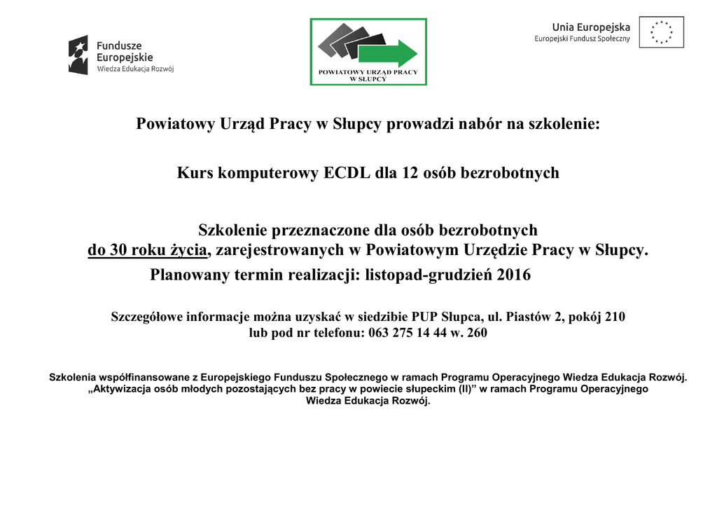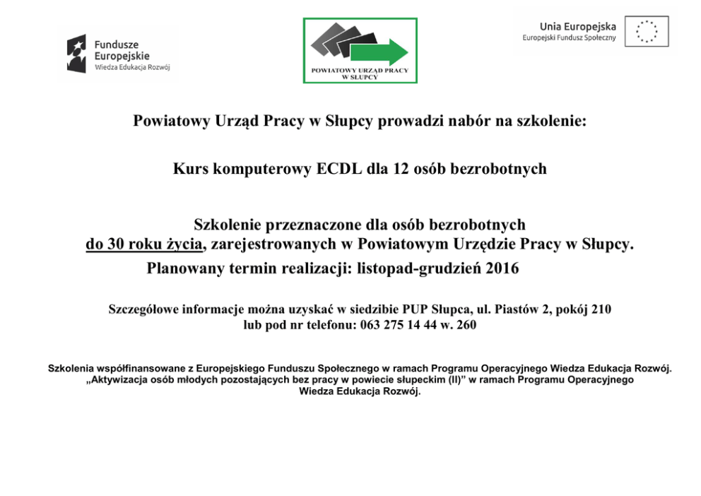 Powiatowy Urząd Pracy w Słupcy prowadzi nabór na szkolenie: Kurs komputerowy ECDL dla 12 osób bezrobotnych Szkolenie przeznaczone dla osób bezrobotnych do 30 roku życia, zarejestrowanych w Powiatowym Urzędzie Pracy w Słupcy. Planowany termin realizacji: listopad-grudzień 2016 Szczegółowe informacje można uzyskać w siedzibie PUP Słupca, ul. Piastów 2, pokój 210 lub pod nr telefonu: 063 275 14 44 w. 260 Szkolenia współfinansowane z Europejskiego Funduszu Społecznego w ramach Programu Operacyjnego Wiedza Edukacja Rozwój. „Aktywizacja osób młodych pozostających bez pracy w powiecie słupeckim (II)” w ramach Programu Operacyjnego Wiedza Edukacja Rozwój.
