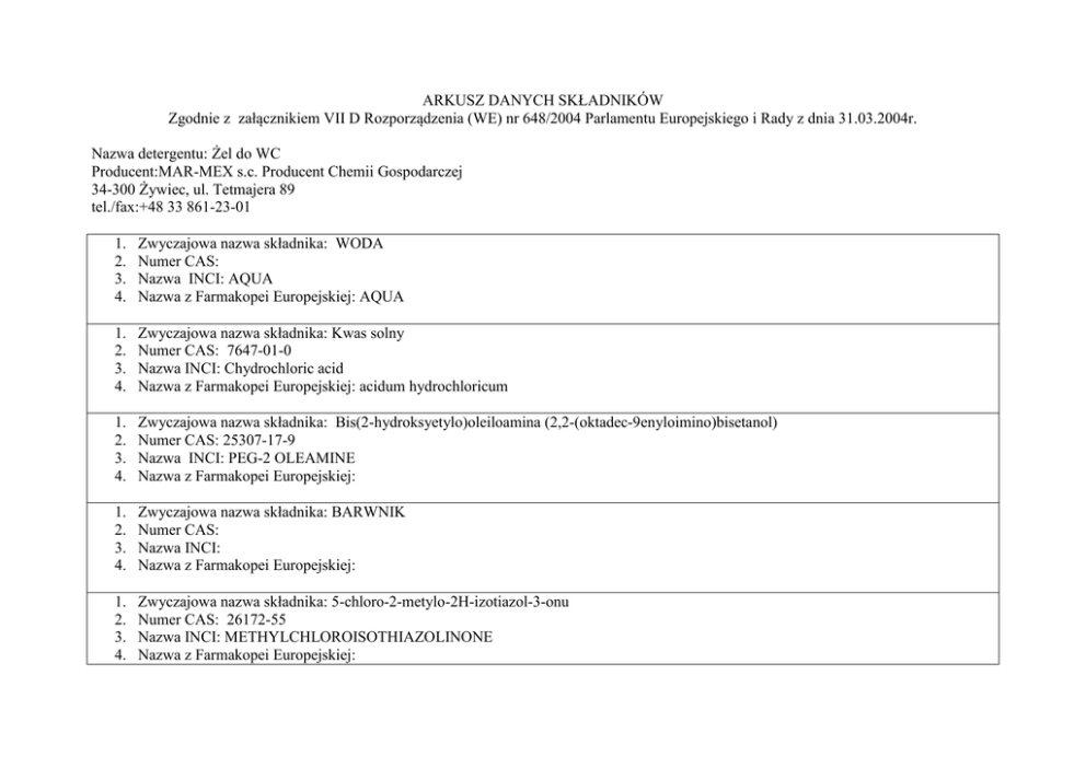 ARKUSZ DANYCH SKŁADNIKÓW Zgodnie z załącznikiem VII D Rozporządzenia (WE) nr 648/2004 Parlamentu Europejskiego i Rady z dnia 31.03.2004r. Nazwa detergentu: Żel do WC Producent:MAR-MEX s.c. Producent Chemii Gospodarczej 34-300 Żywiec, ul. Tetmajera 89 tel./fax:+48 33 861-23-01 1. 2. 3. 4. Zwyczajowa nazwa składnika: WODA Numer CAS: Nazwa INCI: AQUA Nazwa z Farmakopei Europejskiej: AQUA 1. 2. 3. 4. Zwyczajowa nazwa składnika: Kwas solny Numer CAS: 7647-01-0 Nazwa INCI: Chydrochloric acid Nazwa z Farmakopei Europejskiej: acidum hydrochloricum 1. 2. 3. 4. Zwyczajowa nazwa składnika: Bis(2-hydroksyetylo)oleiloamina (2,2-(oktadec-9enyloimino)bisetanol) Numer CAS: 25307-17-9 Nazwa INCI: PEG-2 OLEAMINE Nazwa z Farmakopei Europejskiej: 1. 2. 3. 4. Zwyczajowa nazwa składnika: BARWNIK Numer CAS: Nazwa INCI: Nazwa z Farmakopei Europejskiej: 1. 2. 3. 4. Zwyczajowa nazwa składnika: 5-chloro-2-metylo-2H-izotiazol-3-onu Numer CAS: 26172-55 Nazwa INCI: METHYLCHLOROISOTHIAZOLINONE Nazwa z Farmakopei Europejskiej: 1. 2. 3. 4. Zwyczajowa nazwa składnika: 2-metylo-2H-izotiazol-3-onu Numer CAS: 2682-20-4 Nazwa INCI: METHYLISOTHIAZOLINONE Nazwa z Farmakopei Europejskiej: 1. 2. 3. 4. Zwyczajowa nazwa składnika: 2-bromo-2-nitropropano-1,3-diol Numer CAS: 52-51-7 Nazwa INCI: 2-Bromo-2-nitropropane-1,3-diol Nazwa z Farmakopei Europejskiej: bronopol 1. Zwyczajowa nazwa składnika: kompozycja zapachowa Nie zawiera składników znajdujących się na liście zawartej w załączniku III, część I dyrektywy 76/768/EWG w ilości powyżej 0,01%wagowych Opracował: Zdzisław Kuczyński
