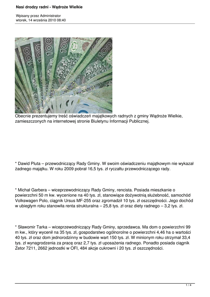 tys. zł wynagrodzenia za pracę oraz 2,7 tys. zł uposażenia radnego. Ponadto posiada ciągnik