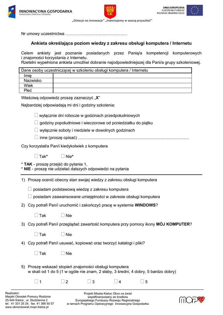 „Dotacje na innowacje” „Inwestujemy w waszą przyszłość” Nr umowy uczestnictwa ……………………………………… Ankieta określająca poziom wiedzy z zakresu obsługi komputera / Internetu Celem ankiety jest poznanie posiadanych przez Panią/a kompetencji komputerowych i znajomości korzystania z Internetu. Rzetelni wypełniona ankieta umożliwi dobranie najodpowiedniejszej dla Pani/a grupy szkoleniowej. Dane osoby uczestniczącej w szkoleniu obsługi komputera / Internetu Imię Nazwisko Wiek Płeć Właściwą odpowiedz proszę zaznaczyć „X” Najbardziej odpowiadają mi dni i godziny szkolenia: wyłącznie dni robocze w godzinach przedpołudniowych godziny popołudniowe i wieczorowe od poniedziałku do piątku wyłącznie soboty i niedziele w dowolnych godzinach inne (proszę opisać) ……………………………………………………………………… Czy korzystał/a Pan/i kiedykolwiek z komputera Tak* Nie* * TAK - proszę przejść do pytania 1, * NIE - proszę nie udzielać dalszych odpowiedzi na pytania 1) Proszę ocenić obecny stan swojej wiedzy z zakresu obsługi komputera posiadam podstawową wiedzę z zakresu komputera posiadam zaawansowane umiejętności w zakresie obsługi komputera 2) Czy potrafi Pan/i uruchomić i zakończyć pracę w systemie WINDOWS? Tak Nie 3) Czy potrafi Pan/i przeglądać zawartość komputera przy pomocy ikony MÓJ KOMPUTER? Tak Nie 4) Czy potrafi Pan/i usuwać, kopiować oraz tworzyć katalogi i pliki? Tak Nie 5) Proszę wskazać stopień znajomości obsługi komputera w skali od 1 do 5 (1 w ogóle nie znam, 2 słaby, 3 średni, 4 dobry, 5 bardzo dobry) 1 Realizator: Miejski Ośrodek Pomocy Rodzinie 25-544 Kielce , ul. Studzienna 2 tel. 41 331 25 24, fax. 41 368 50 57 www.oknonaswiat.mopr.kielce.pl Realizator 2 3 4 5 Projekt Miasta Kielce Okno na świat współfinansowany ze środków Europejskiego Funduszu Rozwoju Regionalnego w ramach Programu Operacyjnego Innowacyjna Gospodarka „Dotacje na innowacje” „Inwestujemy w waszą przyszłość” 6) Jak ocenia Pan/i poziom swojej znajomości edytora tekstu WORD w skali od 1 do 5 (1 w ogóle nie znam, 2 słaby, 3 średni, 4 dobry, 5 bardzo dobry) 1 2 3 4 5 7) Jak ocenia Pan/(i) poziom swojej znajomości arkusza kalkulacyjnego EXCEL w skali od 1 do 5 (1 w ogóle nie znam, 2 słaby, 3 średni, 4 dobry, 5 bardzo dobry) 1 2 3 4 5 8) Czy korzystał/a Pan/i kiedykolwiek z Internetu? Tak* Nie* * TAK - proszę przejść do pytania 9, * NIE - proszę nie udzielać dalszych odpowiedzi na pytania. 9) Jak ocenia Pan/i poziom swojej znajomości przeglądarek internetowych w skali od 1 do 5 (1 w ogóle nie znam, 2 słaby, 3 średni, 4 dobry, 5 bardzo dobry) 1 2 3 4 5 10) Potrafię wysłać i odczytać e-mail Tak Nie 11) Potrafię wyszukać podstawowe informacje w wyszukiwarce GOOGLE Tak Nie 12) Symbol @ (małpa) oznacza: nic nie oznacza symbol stosowany w adresie emailowym literę „ą” nie wiem 13) Proszę wskazać który z poniższych to adres strony internetowej www.mopr.kielce.pl [email protected] mopr/kielce/pl nie wiem Dane osoby wypełniającej ankietę ……………………………………..... data …………………… Dziękuję za współpracę Dyr. Marek Scelina Realizator: Miejski Ośrodek Pomocy Rodzinie 25-544 Kielce , ul. Studzienna 2 tel. 41 331 25 24, fax. 41 368 50 57 www.oknonaswiat.mopr.kielce.pl Realizator Projekt Miasta Kielce Okno na świat współfinansowany ze środków Europejskiego Funduszu Rozwoju Regionalnego w ramach Programu Operacyjnego Innowacyjna Gospodarka