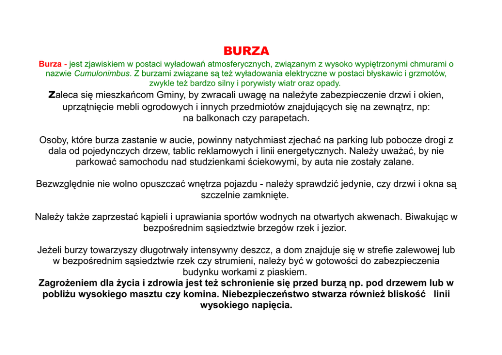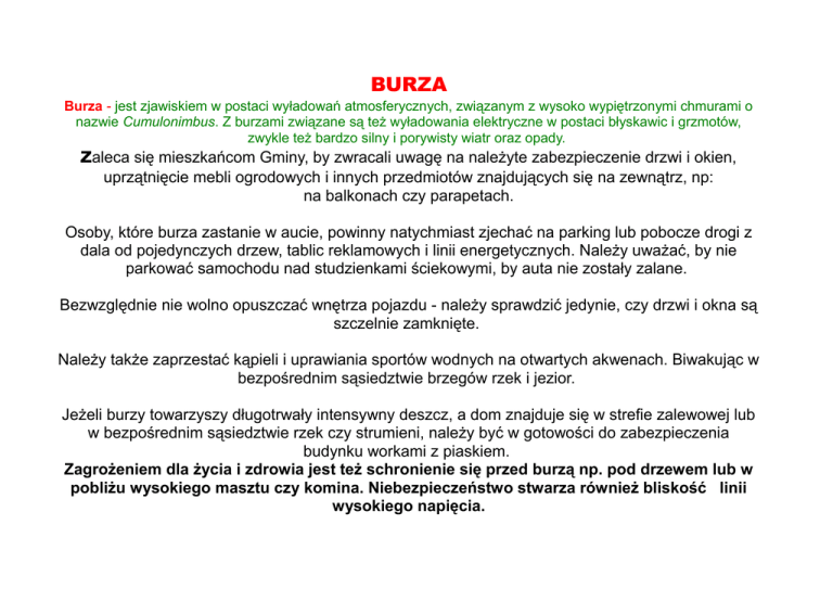 BURZA Burza - jest zjawiskiem w postaci wyładowań atmosferycznych, związanym z wysoko wypiętrzonymi chmurami o nazwie Cumulonimbus. Z burzami związane są też wyładowania elektryczne w postaci błyskawic i grzmotów, zwykle też bardzo silny i porywisty wiatr oraz opady. Zaleca się mieszkańcom Gminy, by zwracali uwagę na należyte zabezpieczenie drzwi i okien, uprzątnięcie mebli ogrodowych i innych przedmiotów znajdujących się na zewnątrz, np: na balkonach czy parapetach. Osoby, które burza zastanie w aucie, powinny natychmiast zjechać na parking lub pobocze drogi z dala od pojedynczych drzew, tablic reklamowych i linii energetycznych. Należy uważać, by nie parkować samochodu nad studzienkami ściekowymi, by auta nie zostały zalane. Bezwzględnie nie wolno opuszczać wnętrza pojazdu - należy sprawdzić jedynie, czy drzwi i okna są szczelnie zamknięte. Należy także zaprzestać kąpieli i uprawiania sportów wodnych na otwartych akwenach. Biwakując w bezpośrednim sąsiedztwie brzegów rzek i jezior. Jeżeli burzy towarzyszy długotrwały intensywny deszcz, a dom znajduje się w strefie zalewowej lub w bezpośrednim sąsiedztwie rzek czy strumieni, należy być w gotowości do zabezpieczenia budynku workami z piaskiem. Zagrożeniem dla życia i zdrowia jest też schronienie się przed burzą np. pod drzewem lub w pobliżu wysokiego masztu czy komina. Niebezpieczeństwo stwarza również bliskość linii wysokiego napięcia.