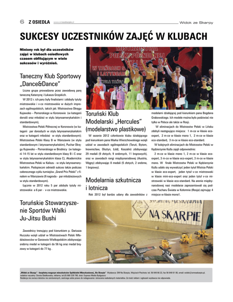 6 z osiedla www.smnaskarpie.pl Widok ze Skarpy Sukcesy uczestników zajęć w klubach Miniony rok był dla uczestników zajęć w klubach osiedlowych czasem obfitującym w wiele sukcesów i wyróżnień. Taneczny Klub Sportowy „Dance&Dance” Liczna grupa prowadzona przez zawodową parę taneczną Katarzynę i Łukasza Grzęskich. W 2012 r. ich pary były finalistami i zdobyły tytuły mistrzowskie i v-ce mistrzowskie w dużych imprezach ogólnopolskich, takich jak: Mistrzostwa Okręgu Kujawsko – Pomorskiego w Koronowie (w kategorii dorośli oraz młodzież w stylu latynoamerykańskim i standardowym), Mistrzostwa Polski Północnej w Koronowie (w kategorii par dorosłych w stylu latynoamerykańskim oraz w kategorii młodzież w stylu standardowym); Mistrzostwa Polski Klasy B w Warszawie (w stylu standardowym i latynoamerykańskim), Puchar Okręgu Kujawsko – Pomorskiego w Brodnicy (w kategorii 14-15 lat w stylu standardowym klasy B i C oraz w stylu latynoamerykańskim klasa C), Akademickie Mistrzostwa Polski w Kaliszu - w stylu latynoamerykańskim. Podopieczni odnieśli sukces także podczas całorocznego cyklu turniejów „Grand Prix Polski” z finałem w Warszawie (II nagroda - par młodzieżowych w stylu standardowym). Łącznie w 2012 roku 5 par zdobyło tytuły mistrzowskie a 6 par - v-ce mistrzowskie. Toruński Klub Modelarski „Hercules” (modelarstwo plastikowe) W sezonie 2012 członkowie klubu działającego pod kierunkiem pana Marka Wierzchowskiego wzięli udział w zawodach ogólnopolskich (Toruń, Bytom, Inowrocław, Olsztyn, Łódź, Koszalin) zdobywając 29 medali (9 złotych, 9 srebrnych, 11 brązowych), oraz w zawodach rangi międzynarodowej (Austria, Węgry) zdobywając 8 medali (5 złotych, 2 srebrne, 1 brązowy). Modelarnia szkutnicza i lotnicza Rok 2012 był bardzo udany dla zawodników z modelarni działającej pod kierunkiem pana Bogdana Grabowskiego. Ich modele można było podziwiać nie tylko w Polsce ale także w Rosji. W eliminacjach do Mistrzostw Polski w Lińsku zdobyli następujące miejsca: 1 m-ce w klasie ecoexpert, 2 m-ce w klasie mono 1, 2 m-ce w klasie eco-standard, 3 m-ce w klasie eco-standard. W kolejnych eliminacjach do Mistrzostw Polski w Kędzierzynie Koźlu zajęli odpowiednio: 2 m-ce w klasie mono 1, 2 m-ce w klasie ecoexpert, 3 m-ce w klasie eco-expert, 3 m-ce w klasie mono. W finale Mistrzostw Polski w Kędzierzynie Koźlu udało się wywalczyć jeden tytuł Mistrza Polski w klasie eco-expert, jeden tytuł v-ce mistrzowski w klasie mini-eco-expert oraz jeden tytuł v-ce mistrzowski w klasie eco-standard. Na arenie międzynarodowej nasi modelarze zaprezentowali się podczas Pucharu Świata w Kołomnie (Rosja) zajmując 4 miejsce w klasie mono1. Toruńskie Stowarzyszenie Sportów Walki Ju-Jitsu Bushi Zawodnicy trenujący pod kierunkiem p. Dariusza Huczuka wzięli udział w Mistrzostwach Polski Młodzieżowców w Gorzowie Wielkopolskim zdobywając srebrny medal w kategorii do 56 kg oraz medal brązowy w kategorii do 77 kg . „Widok ze Skarpy” - bezpłatny magazyn mieszkańców Spółdzielni Mieszkaniowej „Na Skarpie” Wydawca: SM Na Skarpie, Wojciech Piechota: tel. 56 648 66 22, fax 56 648 61 00, email: [email protected], redaktor naczelny: Dorota Gładkowska, reklama, tel.(0) 668 339 790, druk: Express Media Bydgoszcz Redakcja nie zwraca tekstów nie zamówionych, zastrzega sobie prawo do redagowania i skracania nadesłanych materiałów. Za treść reklam i ogłoszeń wydawca nie odpowiada.