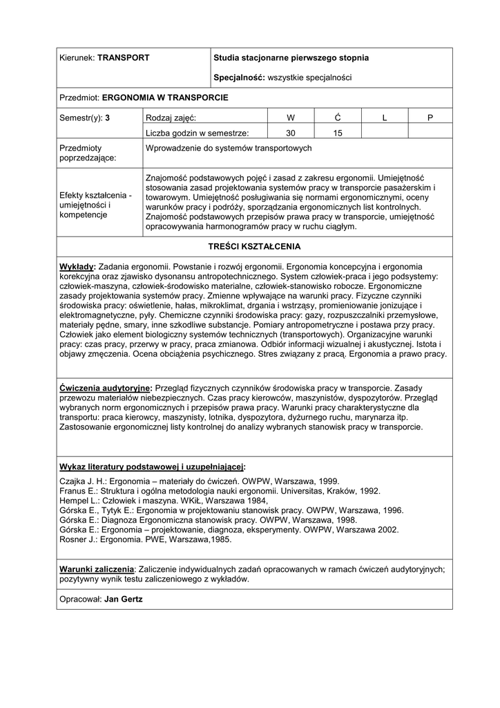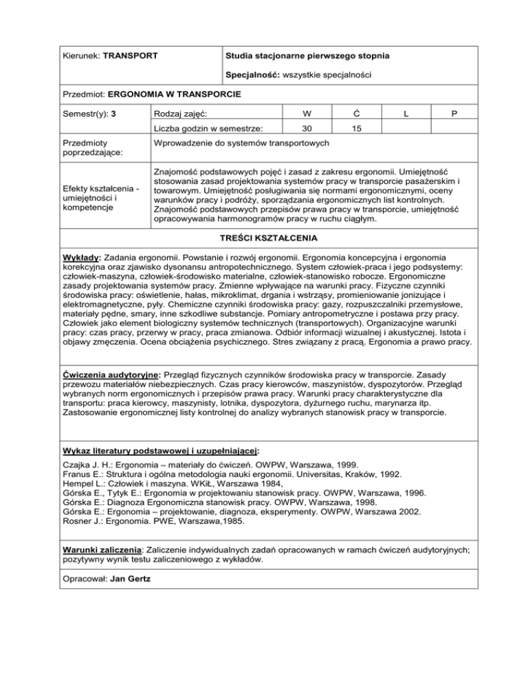 Kierunek: TRANSPORT Studia stacjonarne pierwszego stopnia Specjalność: wszystkie specjalności Przedmiot: ERGONOMIA W TRANSPORCIE Semestr(y): 3 Przedmioty poprzedzające: Efekty kształcenia umiejętności i kompetencje Rodzaj zajęć: W Ć Liczba godzin w semestrze: 30 15 L P Wprowadzenie do systemów transportowych Znajomość podstawowych pojęć i zasad z zakresu ergonomii. Umiejętność stosowania zasad projektowania systemów pracy w transporcie pasażerskim i towarowym. Umiejętność posługiwania się normami ergonomicznymi, oceny warunków pracy i podróży, sporządzania ergonomicznych list kontrolnych. Znajomość podstawowych przepisów prawa pracy w transporcie, umiejętność opracowywania harmonogramów pracy w ruchu ciągłym. TREŚCI KSZTAŁCENIA Wykłady: Zadania ergonomii. Powstanie i rozwój ergonomii. Ergonomia koncepcyjna i ergonomia korekcyjna oraz zjawisko dysonansu antropotechnicznego. System człowiek-praca i jego podsystemy: człowiek-maszyna, człowiek-środowisko materialne, człowiek-stanowisko robocze. Ergonomiczne zasady projektowania systemów pracy. Zmienne wpływające na warunki pracy. Fizyczne czynniki środowiska pracy: oświetlenie, hałas, mikroklimat, drgania i wstrząsy, promieniowanie jonizujące i elektromagnetyczne, pyły. Chemiczne czynniki środowiska pracy: gazy, rozpuszczalniki przemysłowe, materiały pędne, smary, inne szkodliwe substancje. Pomiary antropometryczne i postawa przy pracy. Człowiek jako element biologiczny systemów technicznych (transportowych). Organizacyjne warunki pracy: czas pracy, przerwy w pracy, praca zmianowa. Odbiór informacji wizualnej i akustycznej. Istota i objawy zmęczenia. Ocena obciążenia psychicznego. Stres związany z pracą. Ergonomia a prawo pracy. Ćwiczenia audytoryjne: Przegląd fizycznych czynników środowiska pracy w transporcie. Zasady przewozu materiałów niebezpiecznych. Czas pracy kierowców, maszynistów, dyspozytorów. Przegląd wybranych norm ergonomicznych i przepisów prawa pracy. Warunki pracy charakterystyczne dla transportu: praca kierowcy, maszynisty, lotnika, dyspozytora, dyżurnego ruchu, marynarza itp. Zastosowanie ergonomicznej listy kontrolnej do analizy wybranych stanowisk pracy w transporcie. Wykaz literatury podstawowej i uzupełniającej: Czajka J. H.: Ergonomia – materiały do ćwiczeń. OWPW, Warszawa, 1999. Franus E.: Struktura i ogólna metodologia nauki ergonomii. Universitas, Kraków, 1992. Hempel L.: Człowiek i maszyna. WKiŁ, Warszawa 1984, Górska E., Tytyk E.: Ergonomia w projektowaniu stanowisk pracy. OWPW, Warszawa, 1996. Górska E.: Diagnoza Ergonomiczna stanowisk pracy. OWPW, Warszawa, 1998. Górska E.: Ergonomia – projektowanie, diagnoza, eksperymenty. OWPW, Warszawa 2002. Rosner J.: Ergonomia. PWE, Warszawa,1985. Warunki zaliczenia: Zaliczenie indywidualnych zadań opracowanych w ramach ćwiczeń audytoryjnych; pozytywny wynik testu zaliczeniowego z wykładów. Opracował: Jan Gertz