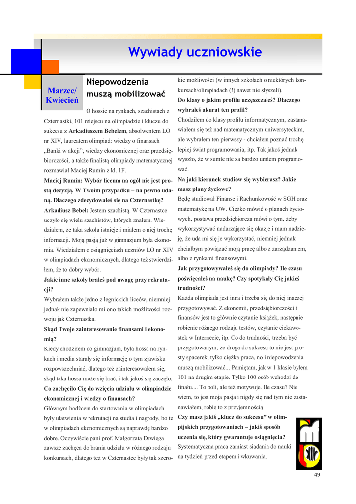 Wywiady uczniowskie Marzec/ Kwiecień Niepowodzenia muszą mobilizować kie możliwości (w innych szkołach o niektórych kon- O hossie na rynkach, szachistach z wybrałeś akurat ten profil? kursach/olimpiadach (!) nawet nie słyszeli). Do klasy o jakim profilu uczęszczałeś? Dlaczego Czternastki, 101 miejscu na olimpiadzie i kluczu do Chodziłem do klasy profilu informatycznym, zastana- sukcesu z Arkadiuszem Bebelem, absolwentem LO wiałem się też nad matematycznym uniwersyteckim, nr XIV, laureatem olimpiad: wiedzy o finansach ale wybrałem ten pierwszy - chciałem poznać trochę „Banki w akcji”, wiedzy ekonomicznej oraz przedsię- lepiej świat programowania, itp. Tak jakoś jednak biorczości, a także finalistą olimpiady matematycznej wyszło, że w sumie nie za bardzo umiem programorozmawiał Maciej Rumin z kl. 1F. wać. Maciej Rumin: Wybór liceum na ogół nie jest pro- Na jaki kierunek studiów się wybierasz? Jakie stą decyzją. W Twoim przypadku – na pewno uda- masz plany życiowe? ną. Dlaczego zdecydowałeś się na Czternastkę? Będę studiował Finanse i Rachunkowość w SGH oraz Arkadiusz Bebel: Jestem szachistą. W Czternastce matematykę na UW. Ciężko mówić o planach życio- uczyło się wielu szachistów, których znałem. Wie- wych, postawa przedsiębiorcza mówi o tym, żeby działem, że taka szkoła istnieje i miałem o niej trochę wykorzystywać nadarzające się okazje i mam nadzieinformacji. Moją pasją już w gimnazjum była ekono- ję, że uda mi się je wykorzystać, niemniej jednak mia. Wiedziałem o osiągnięciach uczniów LO nr XIV chciałbym powiązać moją pracę albo z zarządzaniem, w olimpiadach ekonomicznych, dlatego też stwierdzi- albo z rynkami finansowymi. łem, że to dobry wybór. Jak przygotowywałeś się do olimpiady? Ile czasu Jakie inne szkoły brałeś pod uwagę przy rekruta- poświęcałeś na naukę? Czy spotykały Cię jakieś cji? trudności? Wybrałem także jedno z legnickich liceów, niemniej Każda olimpiada jest inna i trzeba się do niej inaczej jednak nie zapewniało mi ono takich możliwości roz- przygotowywać. Z ekonomii, przedsiębiorczości i finansów jest to głównie czytanie książek, następnie woju jak Czternastka. Skąd Twoje zainteresowanie finansami i ekono- robienie różnego rodzaju testów, czytanie ciekawo- mią? stek w Internecie, itp. Co do trudności, trzeba być Kiedy chodziłem do gimnazjum, była hossa na ryn- przygotowanym, że droga do sukcesu to nie jest pro- kach i media starały się informację o tym zjawisku sty spacerek, tylko ciężka praca, no i niepowodzenia rozpowszechniać, dlatego też zainteresowałem się, muszą mobilizować... Pamiętam, jak w 1 klasie byłem skąd taka hossa może się brać, i tak jakoś się zaczęło. 101 na drugim etapie. Tylko 100 osób wchodzi do Co zachęciło Cię do wzięcia udziału w olimpiadzie finału.... To boli, ale też motywuje. Ile czasu? Nie ekonomicznej i wiedzy o finansach? wiem, to jest moja pasja i nigdy się nad tym nie zasta- Głównym bodźcem do startowania w olimpiadach nawiałem, robię to z przyjemnością były ułatwienia w rekrutacji na studia i nagrody, bo te Czy masz jakiś „klucz do sukcesu” w olimpijskich przygotowaniach – jakiś sposób w olimpiadach ekonomicznych są naprawdę bardzo dobre. Oczywiście pani prof. Małgorzata Drwięga uczenia się, który gwarantuje osiągnięcia? zawsze zachęca do brania udziału w różnego rodzaju Systematyczna praca zamiast siadania do nauki konkursach, dlatego też w Czternastce były tak szero- na tydzień przed etapem i wkuwania. 49 Wywiady uczniowskie Marzec/ Kwiecień Niepowodzenia muszą mobilizować Nie. Do szkoły jakoś dużo się nie uczyłem, przedmioty typu biologia, historia, chemia traktowałem tak, żeby tylko zdać, a nie oszukujmy się – do tego wiele nie potrzeba. Dużo czasu zajmowała mi ekonomia, ale pewnie sam wiesz, że jak robi się coś z własnej woli, to nie ma problemu, żeby odłożyć to na bok i pójść się spotkać z przyjaciółmi. Czy uważasz, że w LO nr XIV panuje atmosfera „wyścigu szczurów”? Ja się spotkałem ze współpracą, szczególnie z ludźmi z olimpiad ekonomicznych. Współpracowaliśmy i razem osiągaliśmy sukcesy. Nie przeczę, że być może istnieje jakiś „rat race” jeżeli chodzi o średnią ocen, ale to mnie nigdy nie obchodziło. Wywiad przeprowadził uczeń klasy 1 F, Maciej Rumin Wiele zależy od szczęścia Wywiad z Magdą Próchniak, absolwentką Czternastki, laureatką olimpiad: języka polskiego i filozofii. Dominika Dutkowiak: Czy przygotowania do olimJakie korzyści czerpałeś z odnoszenia olimpijskich sukcesów? Nie wiem, czy można to oficjalnie mówić, ale w Czternastce czuć, że w momencie zrobienia pierwszego finału nauka staje się dużo prostsza... Poza tym mówiłem już o nagrodach finansowych i rzeczowych. Czy lubisz się uczyć? Czegoś przyjemnego - jak np. ekonomia - tak. Ale jeśli chodzi o coś, do czego jestem przymuszany przez system edukacji, to nie cierpię. Czy poza ekonomią i matematyką masz jakieś zainteresowania? Oczywiście, np. gram w szachy, lubię podróżować, interesuje mnie samorozwój, czyli np. psychologia, szybkie czytanie, zapamiętywanie i inne mniej lub bardziej przydatne „bzdury”. O olimpijczykach Czternastki mówi się, że ciągle się uczą, nie mają na nic czasu, a poza szkołą nie spotykają się z przyjaciółmi. Czy odniósłbyś te słowa do siebie? piady w tym roku były trudniejsze, czy łatwiejsze niż w latach poprzednich, wziąwszy pod uwagę, że byłaś w klasie maturalnej? Magda Próchniak: Myślę, że jest to zasadnicze pytanie, jeżeli chodzi o korzyści, które daje olimpiada. Jeśli ktoś postanawia się skupić na przedmiocie, w którym później odnosi sukces olimpijski, zdecydowanie ułatwia to funkcjonowanie w klasie maturalnej. Ja na przykład miałam właściwie zapewniony wstęp na interesujące mnie studi