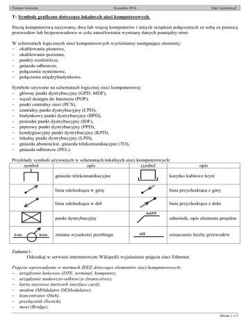 Tomasz Greszata - Koszalin 2016 - http://greszata.pl T: Symbole graficzne dotyczące lokalnych sieci komputerowych. Siecią komputerową nazywamy dwa lub więcej komputerów i innych urządzeń połączonych ze sobą za pomocą przewodów lub bezprzewodowo w celu umożliwienia wymiany danych pomiędzy nimi. W schematach logicznych sieci komputerowych wyróżniamy następujące elementy: okablowanie pionowe, okablowanie poziome, punkty rozdzielcze, gniazda odbiorcze, połączenia systemowe, połączenia międzybudynkowe. Symbole używane na schematach logicznej sieci komputerowej: główny punkt dystrybucyjny (GPD, MDF), węzeł dostępu do Internetu (POP), punkt centralny sieci (PCS), centralny punkt dystrybucyjny (CPD), budynkowy punkt dystrybucyjny (BPD), pośredni punkt dystrybucyjny (IDF), piętrowy punkt dystrybucyjny (PPD), kondygnacyjny punkt dystrybucyjny (KPD), lokalny punkt dystrybucyjny (LPD), gniazda abonenckie, gniazda telekomunikacyjne (TO), gniazda odbiorcze (PEL). Przykłady symboli używanych w schematach lokalnych sieci komputerowych: symbol opis symbol opis gniazdo telekomunikacyjne korytko kablowe kryte linia odchodząca w górę linia przychodząca z góry linia odchodząca w dół linia przychodząca z dołu punkt dystrybucyjny odnośnik, opis elementu projektu zmiana wysokości przebiegu oznaczenie liczby przewodów Zadanie1: Odszukaj w serwisie internetowym Wikipedii wyjaśnienie pojęcia sieci Ethernet. Pojęcia wprowadzone w normach IEEE dotyczące elementów sieci komputerowych: urządzenie końcowe (DTE, terminal, komputer), urządzenie nadawczo-odbiorcze (transceiver), karta sieciowa (network interface card), modem (MOdulator DEModulator), koncentrator (Hub), przełącznik (Switch), most (Bridge), Strona 1 z 3 Tomasz Greszata - Koszalin 2016 - http://greszata.pl wzmacniak (Repeater), punkt dostępowy (Access Point), ruter (Router), brama sieciowa (Gateway), brama VoIP (Voice over Internet Protocol), zapora sieciowa (Firewall), terminator, i inne. Zadanie2: Odszukaj w serwisie internetowym Dobreprogramy.pl informacje na temat programu SmartDraw, Dia, MS Visio oraz Network Notepad. Dia jest bezpłatnym programem umożliwiającym tworzenie schematów blokowych, diagramów i wykresów. Program posiada wbudowane symbole z różnych dziedzin (elektryki, komputerów, inżynierii lądowej itd.). Network Notepad jest bezpłatnym programem służącym do tworzenia prostych schematów sieci komputerowych (interaktywnych). Symbole graficzne stosowane w programie Network Notepad: Zadanie3: Wykorzystując program Network Notepad stwórz schemat sieci lokalnej LAN przedstawiający dwie szkolne pracownie komputerowe w salach 26 i 27. Utworzony schemat powinien zawierać wszystkie urządzenia znajdujące się w danych salach z ustawionymi nazwami oraz skonfigurowanymi statycznie adresami IP. Projekt będzie oceniany również pod kątem estetycznym. Pracę zachowaj na pod nazwą $nazwisko_schemat.ndg oraz prześlij pocztą elektroniczną w formie załącznika do nauczyciela pod adres [email protected]. Strona 2 z 3 Tomasz Greszata - Koszalin 2016 - http://greszata.pl Zadanie4: Odszukaj w serwisie internetowym Wikipedii informacje o programach Packet Tracer, GNS3 oraz Marionnet. GNS3 (ang. Graphical Network Simulator) jest to darmowy, publikowany na licencji GPL, graficzny symulator sieci, pozwalający tworzyć i testować projekty sieci komputerowych. Zadanie5: Sporządź schemat logicznej sieci komputerowej dla fragmentu drugiego piętra budynku szkolnego przy użyciu dowolnego programu komputerowego. Pracę zachowaj na pod nazwą $nazwisko_schemat oraz prześlij pocztą elektroniczną w formie załącznika do nauczyciela pod adres [email protected]. Strona 3 z 3