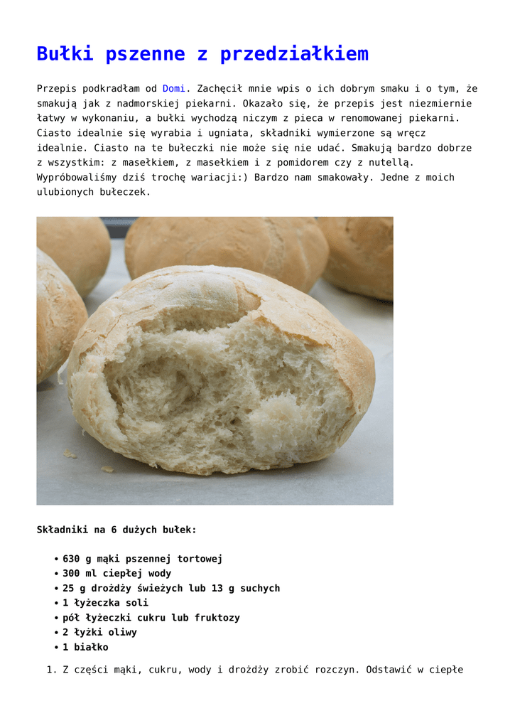 Bułki pszenne z przedziałkiem Przepis podkradłam od Domi. Zachęcił mnie wpis o ich dobrym smaku i o tym, że smakują jak z nadmorskiej piekarni. Okazało się, że przepis jest niezmiernie łatwy w wykonaniu, a bułki wychodzą niczym z pieca w renomowanej piekarni. Ciasto idealnie się wyrabia i ugniata, składniki wymierzone są wręcz idealnie. Ciasto na te bułeczki nie może się nie udać. Smakują bardzo dobrze z wszystkim: z masełkiem, z masełkiem i z pomidorem czy z nutellą. Wypróbowaliśmy dziś trochę wariacji:) Bardzo nam smakowały. Jedne z moich ulubionych bułeczek. Składniki na 6 dużych bułek: 630 g mąki pszennej tortowej 300 ml ciepłej wody 25 g drożdży świeżych lub 13 g suchych 1 łyżeczka soli pół łyżeczki cukru lub fruktozy 2 łyżki oliwy 1 białko 1. Z części mąki, cukru, wody i drożdży zrobić rozczyn. Odstawić w ciepłe miejsce do czasu aż rozpocznie pracować (jeśli suche drożdże, to nie robić rozczynu). 2. Wymieszać pozostałe składniki z pracującymi drożdżami w misie robota i wyrobić gładkie i elastyczne ciasto (8 minut). 3. Odstawić w ciepłe miejsce do podwojenia objętości (60-90 minut). 4. Blachę do pieczenia wyłożyć papierem do pieczenia. Można spsikać sprayem do pieczenia (nie zrobiłam tego i spód bułeczek oblepił się lekko papierem, który ciężko było usunąć). 5. Ciasto podzielić na 6 kawałków. Wziąć jeden do ręki, wyrobić z niego płaski okrąg i zwinąć w sakiewkę. Sakiewkę położyć zamknięciem do dołu na papierze do pieczenia. Dzięki temu mamy okrągłą bułeczkę. 6. Bułki oprószyć lekko mąką. Odstawić do napuszenia na kolejne 30 minut. 7. Bułeczki „naciąć” drewnianą szpatułą do 3/4 ich głębokości. 8. Wstawić do nagrzanego piekarnika (200 stopni) i piec około 30 minut do ich delikatnego zarumienienia. 9. Smacznego!