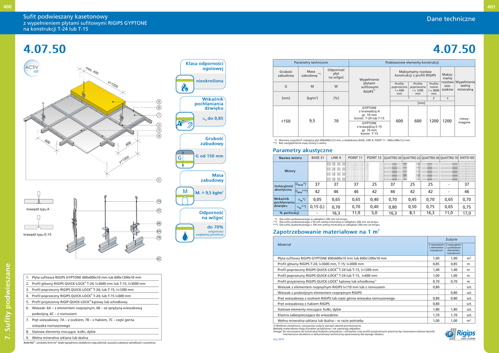 400 401 Sufit podwieszany kasetonowy Dane techniczne z wypełnieniem płytami sufitowymi RIGIPS GYPTONE na konstrukcji T-24 lub T-15 4.07.50 4.07.50 ma x. 40 Klasa odporności ogniowej 0 x= 1 20 Parametry techniczne Masa **) zabudowy Grubość zabudowy nieokreślona 0 Wskaźnik pochłaniania dźwięku 9 8 1 a w do 0,85 Podstawowe elementy konstrukcji Odporność płyt na wilgoć G M W [mm] [kg/m2] [%] 9,5 ł150 70 3 4 Grubość zabudowy 0 60 Wypełnienie płytami sufitowymi *) RIGIPS Maksymalny rozstaw Wypełnienie Profile Profile Profile wełną wiepoprzeczne poprzeczne nośne l = 600 l = 1200 l = 3600 szaków mineralną mm mm mm l y x [mm] 2 60 0 Maksymalny rozstaw konstrukcji z profili RIGIPS GYPTONE z krawędzią A gr. 10 mm konstr. T-24 lub T-15 600 GYPTONE z krawędzią E-15 gr. 10 mm konstr. T-15 600 niewymagane 1200 1200 *) Wymiary wszystkich rodzajów płyt 600x600x12,5 mm, a dodatkowo BASE, LINE 4, POINT 11 - 600x1200x12,5 mm. **) Bez uwzględnienia masy izolacji z wełny. Parametry akustyczne 12 y= G od 150 mm G 00 BASE 31 LINE 4 POINT 11 DNCW*) 37 37 37 25 37 25 25 - 37 DNCW***) 42 46 46 42 46 42 42 - 46 0,65 0,65 0,40 0,70 0,45 0,70 0,65 0,70 0,70 16,3 0,70 11,9 0,40 5,0 0,80 16,3 0,50 8,1 0,75 16,3 0,65 11,0 0,75 17,0 Nazwa wzoru POINT 12 QUATTRO 20 QUATTRO 22 QUATTRO 50 QUATTRO 70 SIXTO 60 Wzory Masa zabudowy 5 M M. ~ ~ 9,5 kg/m2 Wskaźnik a 0,05 w*) pochłaniania dźwięku a 0,15 (L) w**) 7A krawędź typu A 7C Odporność na wilgoć 6B do 70% 6A krawędź typu E-15 Izolacyjność akustyczna wilgotności względnej powietrza % perforacji - *) Dla sufitu podwieszanego w odległości 200 mm od stropu. **) Dla sufitu podwieszanego z 50 mm wełną mineralną w odległości 200 mm od stropu. ***) Dla sufitu podwieszanego z 100 mm wełną mineralną w odległości 200 mm od stropu. Zapotrzebowanie materiałowe na 1 m 2 7B Zużycie Materiał 7. Sufity podwieszane 6C 1. Płyta sufitowa RIGIPS GYPTONE 600x600x10 mm lub 600x1200x10 mm Z wieszakiem Z wieszakiem z elementem z podwójnym rozprężnym elementem rozprężnym Płyta sufitowa RIGIPS GYPTONE 600x600x10 mm lub 600x1200x10 mm 2. Profil główny RIGIPS QUICK-LOCK T-24; l=3600 mm lub T-15, l=3000 mm 3. Profil poprzeczny RIGIPS QUICK-LOCK® T-24; lub T-15, l=1200 mm ® 4. Profil poprzeczny RIGIPS QUICK-LOCK T-24; lub T-15 l=600 mm ® 5. Profil przyścienny RIGIP QUICK-LOCK kątowy lub schodkowy 6. Wieszak: 6A – z elementem rozprężnym, 6B – ze sprężyną wieszakową podwójną, 6C – z noniuszem 7. Pręt wieszakowy: 7A – z oczkiem, 7B – z hakiem, 7C – część górna wieszaka noniuszowego 8. Stalowe elementy mocujące: kołki, dyble 9. Wełna mineralna szklana lub skalna ® ® Activ’Air — produkty Activ’Air dzięki specjalnemu dodatkowi mają zdolność usuwania substancji szkodliwych z powietrza. 1,00 m2 Profil główny RIGIPS T-24; l=3600 mm, T-15; l=3000 mm 0,85 0,85 m Profil poprzeczny RIGIPS QUICK-LOCK® T-24 lub T-15, l=1200 mm 1,40 1,40 m ® Profil poprzeczny RIGIPS QUICK-LOCK T-24 lub T-15, l=600 mm 1,00 1,00 m Profil przyścienny RIGIPS QUICK-LOCK kątowy lub schodkowy1) 0,70 0,70 m Wieszak z elementem rozprężnym RIGIPS l=110 mm lub z noniuszem 0,80 - ® ® 1,00 Wieszak z podwójnym elementem rozprężnym RIGIPS szt. - 0,80 szt. Pręt wieszakowy z oczkiem RIGIPS lub część górna wieszaka noniuszowego 0,80 0,80 szt. Pręt wieszakowy z hakiem RIGIPS 0,80 - szt. Stalowe elementy mocujące: kołki, dyble 1,80 1,80 szt. Klamra zabezpieczająca do wieszaków 1,70 1,70 szt. Wełna mineralna szklana lub skalna — w razie potrzeby 1,00 1,00 m2 1) Wielkość uśredniona, rzeczywiste zużycie stanowi obwód pomieszczenia. Nakłady materiałowe mają charakter przybliżony i nie zawierają odpadów. Uwaga: Do mocowania do konstrukcji budynku wieszaków i uchwytów oraz profili przyściennych powinny być stosowane stalowe łączniki mechaniczne określone w dokumentacji technicznej opracowanej dla danego obiektu. luty 2016