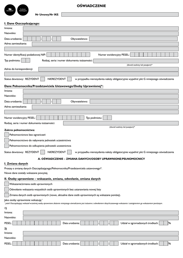 OÂWIADCZENIE Nr Umowy/Nr IKE: I. Dane Oszcz´dzajàcego: Imiona: Nazwisko: Data urodzenia: - - Obywatelstwo: Adres zamieszkania: Numer identyfikacji podatkowej NIP: Typ podmiotu: Numer ewidencyjny PESEL: Rodzaj, seria i numer dokumentu to˝samoÊci: (dowód osobisty lub paszport)* Adres do korespondencji: Status dewizowy: REZYDENT NIEREZYDENT w przypadku nierezydenta nale˝y obligatoryjnie wype∏niç pkt G niniejszego oÊwiadczenia Dane Pełnomocnika/Przedstawiciela Ustawowego/Osoby Uprawnionej*: Imiona: Nazwisko: Data urodzenia: - - Obywatelstwo: Adres zamieszkania: Numer ewidencyjny PESEL: Typ podmiotu: Rodzaj, seria i numer dokumentu to˝samoÊci: (dowód osobisty lub paszport)* Zakres pełnomocnictwa: Pełnomocnictwo bez ograniczeƒ Pełnomocnictwo do nabywania jednostek uczestnictwa Pełnomocnictwo do odkupienia jednostek uczestnictwa Status dewizowy: REZYDENT NIEREZYDENT w przypadku nierezydenta nale˝y obligatoryjnie wype∏niç pkt G niniejszego oÊwiadczenia A. OÂWIADCZENIE – ZMIANA DANYCH/OSOBY UPRAWNIONE/PEŁNOMOCNICY I. Zmiana danych Prosz´ o zmian´ danych Oszcz´dzajàcego/Pełnomocnika/Przedstawiciela ustawowego*. Nowe dane zostały wskazane powy˝ej. II. Osoby uprawnione – wskazanie, zmiana, odwołanie, zmiana danych Wskazanie/zmiana osób uprawnionych Odwołanie wskazania wszystkich osób uprawnionych bez ustanawiania nowej listy Zmiana danych osób uprawnionych (nowe, aktualne dane osób uprawnionych sà wskazane poni˝ej). Jako osoby uprawnione wskazujà:1 1 je˝eli Oszcz´dzajàcy wskazał wczeÊniej osoby uprawnione zło˝enie niniejszego oÊwiadczenia jest to˝same z odwołaniem dotychczasowego wskazania i zastàpieniem go wskazaniem poni˝szym. 1) Imiona: Nazwisko: PESEL: Data urodzenia: - - Udział w zgromadzonych Êrodkach: % Data urodzenia: - - Udział w zgromadzonych Êrodkach: % 2) Imiona: Nazwisko: PESEL: 3) Imiona: Nazwisko: PESEL: Data urodzenia: - - Udział w zgromadzonych Êrodkach: % Data urodzenia: - - Udział w zgromadzonych Êrodkach: % 4) Imiona: Nazwisko: PESEL: Je˝eli Oszcz´dzajàcy wskazał kilka osób uprawnionych do otrzymania Êrodków po jego Êmierci, a nie oznaczył ich udziału w tych Êrodkach lub suma oznaczonych udziałów nie jest równa 100%, uwa˝a si´, ˝e udziały tych osób sà równe. III. Pełnomocnicy Ustanowienie pełnomocnika Odwołanie pełnomocnika Dane Pełnomocnika zostały wskazane powy˝ej. B. WYPOWIEDZENIE UMOWY O PROWADZENIE IKE (WNIOSEK O ZWROT ÂRODKÓW) W przypadku, gdy oÊwiadczenie składane jest przez Pełnomocnika/Przedstawiciela Ustawowego dane osoby składajàcej oÊwiadczenie nale˝y wypełniç w odpowiedniej kolumnie. Oszcz´dzajàcy niniejszym wypowiada Umow´ o prowadzenie IKE JednoczeÊnie Oszcz´dzajàcy wnosi o dokonanie zwrotu Êrodków zgromadzonych na IKE** Nale˝y zaznaczyç w przypadku, gdy Oszcz´dzajàcy wnosi o dokonanie zwrotu Êrodków zgromadzonych na IKE, dokonywanego w formie pieni´˝nej, poprzez przekazanie nale˝nej kwoty Oszcz´dzajàcemu. W przypadku niezło˝enia przedmiotowego wniosku zwrot Êrodków nast´puje w trybie przekształcenia IKE w rejestr uczestnika Subfunduszu prowadzony na zasadach ogólnych, w Subfunduszu/Subfunduszach, w którym zgromadzone były Êrodki w ramach IKE, z zastrze˝eniem ˝e liczba jednostek uczestnictwa zarejestrowanych na rejestrze prowadzonym na zasadach ogólnych ustalana jest jako ró˝nica pomi´dzy liczbà jednostek uczestnictwa zarejestrowanych na IKE w dniu dokonywania zwrotu, a liczbà jednostek uczestnictwa odpowiadajàcych swà wartoÊcià (w tym dniu) wartoÊci nale˝noÊci, do których pobrania zobowiàzane jest Towarzystwo oraz wszelkich opłat, do których pobrania uprawnione jest Towarzystwo. W przypadku, gdy Oszcz´dzajàcy ma zgromadzone Êrodki w ramach IKE w wi´cej ni˝ jednym Subfunduszu, opłaty, do których pobrania uprawnione jest Towarzystwo i nale˝noÊci, do których pobrania jest zobowiàzane, pobierane sà ze Êrodków zgromadzonych w ka˝dym Subfunduszu proporcjonalnie do wartoÊci Êrodków zgromadzonych w danym Subfunduszu w stosunku do łàcznej wartoÊci Êrodków zgromadzonych na IKE, chyba ˝e obowiàzujàce przepisy stanowià inaczej. ** Powy˝sze nie dotyczy IKE – SKARBIECALFA, IKE mSkarbiec. W przypadku IKE wskazanych powy˝ej wypowiedzenie Umowy o prowadzenie IKE skutkuje zwrotem Êrodków zgromadzonych na IKE, dokonywanym w formie pieni´˝nej poprzez przekazanie nale˝nej kwoty Oszcz´dzajàcemu, po odkupieniu jednostek uczestnictwa zaewidencjonowanych na IKE. Je˝eli intencjà Oszcz´dzajàcego jest, aby za kwot´ nale˝nà z tytułu zwrotu Êrodków zgromadzonych na IKE nabyte zostały jednostki uczestnictwa zaewidencjonowane na rejestrze uczestnika Subfunduszu prowadzonym na zasadach ogólnych, nale˝y zło˝yç poni˝sze zlecenie: Oszcz´dzajàcy niniejszym składa zlecenie: otwarcia rejestru na zasadach ogólnych i nabycia na ten rejestr - za kwot´ nale˝nà z tytułu odkupienia jednostek uczestnictwa zaewidencjonowanych na IKE, pomniejszonà o kwot´ nale˝noÊci, do których pobrania zobowiàzane jest Towarzystwo oraz wszelkich opłat, do których pobrania uprawnione jest Towarzystwo - jednostek uczestnictwa Subfunduszy, których jednostki uczestnictwa posiadał w ramach IKE, w proporcji odpowiadajàcej proporcji udziału wartoÊci jednostek uczestnictwa poszczególnych Subfunduszy zapisanych na IKE do łàcznej wartoÊci jednostek uczestnictwa zapisanych na IKE. Sposób odbioru Êrodków pieni´˝nych z tytułu zwrotu: przelewem na rachunek bankowy - nazwa i numer rachunku bankowego, na który majà byç przekazane Êrodki: przekazem pocztowym na adres zamieszkania lub adres korespondencyjny (wskazany w pkt 1 formularza) Oszcz´dzajàcy oÊwiadcza, i˝ został pouczony i zapoznał si´ z konsekwencjami zwrotu, w tym z zasadà, ˝e zwrotowi podlegajà Êrodki zgromadzone na IKE pomniejszone o nale˝ny podatek, a w przypadku, gdy na IKE Oszcz´dzajàcego przyj´ta została wypłata transfero