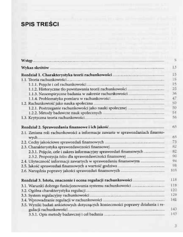 SPIS TREŚCI Wstęp Wykaz skrótów Rozdział 1. Charakterystyka teorii rachunkowości 1.1. Teoria rachunkowości 1.1.1. Pojęcie i cel rachunkowości 1.1.2. Historyczne tło powstawania teorii rachunkowości 1.1.3. Neoempiryczne badania w zakresie rachunkowości 1.1.4. Problematyka pomiaru w rachunkowości 1.2. Rachunkowość jako nauka społeczna 1.2.1. Postrzeganie rachunkowości jako nauki społecznej 1.2.2. Metody badawcze nauk społecznych 1.3. Krytyczna teoria rachunkowości Rozdział 2. Sprawozdaniafinansowe i ich jakość 2.1. Zmiana roli rachunkowości a informacje zawarte w sprawozdaniach finansowych 2.2. Cechy jakościowe sprawozdań finansowych 2.3. Charakterystyka sprawozdawczości finansowej 2.3.1. Pojęcie, cele i zakres informacyjny sprawozdań finansowych 2.3.2. Propozycja telos dla sprawozdawczości finansowej 2.4. Użyteczność informacji zawartych w sprawozdaniu finansowym 2.5. Jakość sprawozdańfinansowych a wartość godziwa 2.6. Narzędzia poprawy jakości sprawozdań finansowych Rozdział 3. Istota, znaczenie i ocena regulacji rachunkowości 3.1. Warunki dobrego funkcjonowania systemu rachunkowości 3.2. Ogólna charakterystyka regulacji 3.3. System regulacyjny rachunkowości 3.4. Wprowadzanie regulacji w rachunkowości 3.5. Wyniki badań ankietowych dotyczących konieczności poprawy działania i regulacji rachunkowości 3.5.1. Opis metody badawczej i cel badania 3.5.2. Przygotowanie kwestionariusza 3.5.3.Wnioski z badania 144 146 Rozdział 4. Charakterystyka etyki i jej przydatności w rachunkowości 4.1. Rozwój myśli etycznej 4.2. Teorie etyki 4.3. Etyka zawodowa a profesjonalizm 4.4. Charakterystyka profesji księgowej 4.5. Relacja profesji księgowej i społeczeństwa 4.6. Ogólna charakterystyka etyki w rachunkowości 4.6.1. Etyka w działalności gospodarczej a rachunkowość 4.6.2. Stadia rozwoju moralnego Kohlberga a profesja księgowa 4.6.3. Znaczenie etyki w rachunkowości 155 155 163 172 176 178 190 190 199 205 Rozdział 5. Kodeks postępowania etycznego i jego znaczenie dla rachunkowości 5.1. Samoregulacja etyczna profesji 5.2. Pożądana etyka zawodowa w rachunkowości 5.3. Efektywność regulacji etycznych 5.4. Kodeks zawodowej etyki w rachunkowości i jego ocena ankietowa 5.4.1. Ogólna charakterystyka Kodeksu 5.4.2. Cel badania i dobór próby badawczej 5.4.3. Przygotowanie kwestionariusza 5.4.4. Wnioski z badania 5.5. Problemy związane z wprowadzaniem kodeksów etycznych 213 213 220 225 232 232 236 237 238 258 Zakończenie 263 Załącznik. Wyniki badań ankietowych 273 Bibliografia 281 Spis tabel 302 Spis rysunków 303