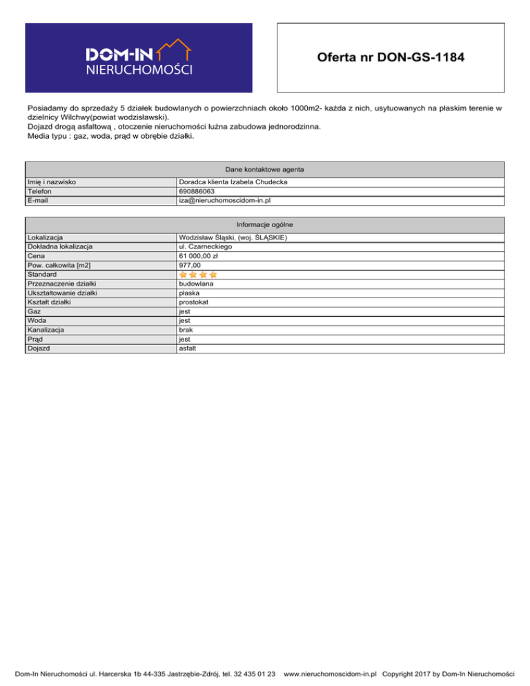 Oferta nr DON-GS-1184 Posiadamy do sprzedaży 5 działek budowlanych o powierzchniach około 1000m2- każda z nich, usytuowanych na płaskim terenie w dzielnicy Wilchwy(powiat wodzisławski). Dojazd drogą asfaltową , otoczenie nieruchomości luźna zabudowa jednorodzinna. Media typu : gaz, woda, prąd w obrębie działki. Dane kontaktowe agenta Imię i nazwisko Telefon E-mail Doradca klienta Izabela Chudecka 690886063 [email protected] Informacje ogólne Lokalizacja Dokładna lokalizacja Cena Pow. całkowita [m2] Standard Przeznaczenie działki Ukształtowanie działki Kształt działki Gaz Woda Kanalizacja Prąd Dojazd Wodzisław Śląski, (woj. ŚLĄSKIE) ul. Czarneckiego 61 000,00 zł 977,00 budowlana płaska prostokat jest jest brak jest asfalt Dom-In Nieruchomości ul. Harcerska 1b 44-335 Jastrzębie-Zdrój, tel. 32 435 01 23 www.nieruchomoscidom-in.pl Copyright 2017 by Dom-In Nieruchomości