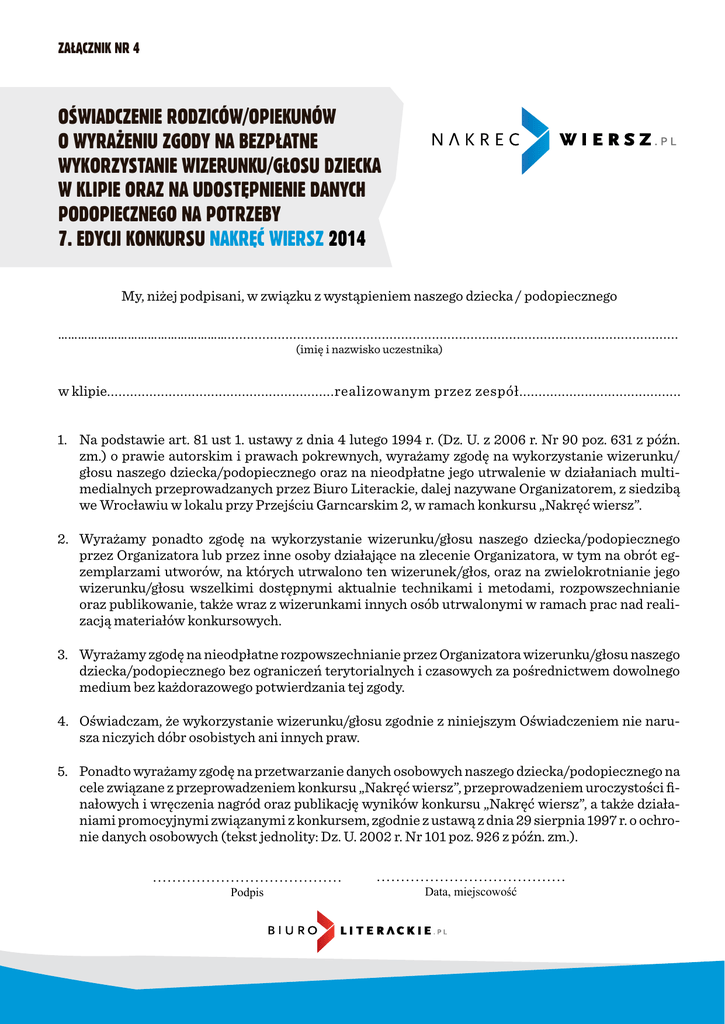 Załącznik nr 4 Oświadczenie rodziców/opiekunów o wyrażeniu zgody na bezpłatne wykorzystanie wizerunku/głosu dziecka w klipie oraz na udostępnienie danych podopiecznego na potrzeby 7. edycji konkursu Nakręć wiersz 2014 My, niżej podpisani, w związku z wystąpieniem naszego dziecka / podopiecznego ……………………………………………..................................................................................................................... (imię i nazwisko uczestnika) w klipie...........................................................realizowanym przez zespół.......................................... 1. Na podstawie art. 81 ust 1. ustawy z dnia 4 lutego 1994 r. (Dz. U. z 2006 r. Nr 90 poz. 631 z późn. zm.) o prawie autorskim i prawach pokrewnych, wyrażamy zgodę na wykorzystanie wizerunku/ głosu naszego dziecka/podopiecznego oraz na nieodpłatne jego utrwalenie w działaniach multimedialnych przeprowadzanych przez Biuro Literackie, dalej nazywane Organizatorem, z siedzibą we Wrocławiu w lokalu przy Przejściu Garncarskim 2, w ramach konkursu „Nakręć wiersz”. 2. Wyrażamy ponadto zgodę na wykorzystanie wizerunku/głosu naszego dziecka/podopiecznego przez Organizatora lub przez inne osoby działające na zlecenie Organizatora, w tym na obrót egzemplarzami utworów, na których utrwalono ten wizerunek/głos, oraz na zwielokrotnianie jego wizerunku/głosu wszelkimi dostępnymi aktualnie technikami i metodami, rozpowszechnianie oraz publikowanie, także wraz z wizerunkami innych osób utrwalonymi w ramach prac nad realizacją materiałów konkursowych. 3. Wyrażamy zgodę na nieodpłatne rozpowszechnianie przez Organizatora wizerunku/głosu naszego dziecka/podopiecznego bez ograniczeń terytorialnych i czasowych za pośrednictwem dowolnego medium bez każdorazowego potwierdzania tej zgody. 4. Oświadczam, że wykorzystanie wizerunku/głosu zgodnie z niniejszym Oświadczeniem nie narusza niczyich dóbr osobistych ani innych praw. 5. Ponadto wyrażamy zgodę na przetwarzanie danych osobowych naszego dziecka/podopiecznego na cele związane z przeprowadzeniem konkursu „Nakręć wiersz”, przeprowadzeniem uroczystości finałowych i wręczenia nagród oraz publikację wyników konkursu „Nakręć wiersz”, a także działaniami promocyjnymi związanymi z konkursem, zgodnie z ustawą z dnia 29 sierpnia 1997 r. o ochronie danych osobowych (tekst jednolity: Dz. U. 2002 r. Nr 101 poz. 926 z późn. zm.). ………………………………… Podpis str 1 ………………………………… Data, miejscowość