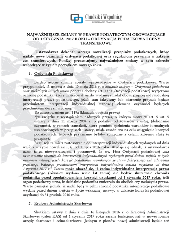 NAJWAŻNIEJSZE ZMIANY W PRAWIE PODATKOWYM OBOWIĄZUJĄCE OD 1 STYCZNIA 2017 ROKU – ORDYNACJA PODATKOWA I CENY TRANSFEROWE Ustawodawca dokonał szeregu nowelizacji przepisów podatkowych, które nadały nowe brzmienie ordynacji podatkowej oraz regulacjom prawnym w zakresu cen transferowych. Poniżej prezentujemy najważniejsze zmiany w tym zakresie wchodzące w życie z początkiem nowego roku. 1. Ordynacja Podatkowa: Bardzo istotne zmiany zostały wprowadzone w Ordynacji podatkowej. Warto przypomnieć, iż ustawą z dnia 13 maja 2016 r. o zmianie ustawy – Ordynacja podatkowa oraz niektórych innych ustaw poprzez dodany art. 14na Ordynacji podatkowej wyłączono ochronę podatnika, który zastosował się do wydanej i nadal obowiązującej indywidualnej interpretacji prawa podatkowego, jeżeli stan faktyczny lub zdarzenie przyszłe będące przedmiotem interpretacji indywidualnej stanowią element czynności będących przedmiotem decyzji wydanej: 1)z zastosowaniem art. 119a (klauzula obejścia prawa) 2)w związku z wystąpieniem nadużycia prawa, o którym mowa w art. 5 ust. 5 ustawy z dnia 11 marca 2004 r. o podatku od towarów i usług (dokonanie czynności, w ramach transakcji, która pomimo spełnienia warunków formalnych ustanowionych w przepisach ustawy, miała zasadniczo na celu osiągnięcie korzyści podatkowych, których przyznanie byłoby sprzeczne z celem, któremu służą te przepisy). Regulacja ta miała zastosowanie do interpretacji indywidualnych wydanych od dnia wejścia w życie nowelizacji, tj. od 1 lipca 2016 roku. Wydaje się jednak, iż ustawodawca uznał ją za niewystraczającą i postanowił, że art. 14na Ordynacji podatkowej „ma zastosowanie również do interpretacji indywidualnych wydanych przed dniem wejścia w życie niniejszej ustawy, jeżeli korzyść podatkowa wynikająca ze stanu faktycznego lub zdarzenia przyszłego będącego przedmiotem interpretacji indywidualnej została uzyskana od dnia 1 stycznia 2017 r.” Zatem może okazać się, iż żadna indywidualna interpretacja prawa podatkowego (również wydana wiele lat temu) nie będzie skutecznie chroniła podatnika przed opodatkowaniem korzyści uzyskanej od 1 stycznia 2017 roku, jeśli organ podatkowy uzna, iż działalnie podatnika zmierzało do obejścia czy nadużycia prawa. Warto pamiętać jednak, iż nadal będą w pełni chronić podatnika interpretacje podatkowe wydane przed dniem wejścia w życie wskazanej ustawy, w zakresie korzyści podatkowej uzyskanej do 31 grudnia 2016 roku. 2. Krajowa Administracja Skarbowa: Skutkiem ustawy z dnia z dnia 16 listopada 2016 r. o Krajowej Administracji Skarbowej (dalej: KAS) od 1 stycznia 2017 roku zaczną funkcjonować w nowej formie urzędy skarbowe i celno-skarbowe. Jednym z pionów nowej administracji będzie też 1 Krajowa Informacja Skarbowa, zajmująca się m.in. wydawaniem interpretacji prawa podatkowego. Jednym z podstawowych celów tych zmian jest integracja baz danych o podatnikach, umożliwiająca sprawniejsze kontrole i wychwytywanie nieprawidłowości. Poprawie działalności nowych służb ma służyć też powołanie w ustawie Krajowej Szkoły Skarbowości. KAS ma być podporządkowana ministrowi finansów, a kierować ma nią Szef Krajowej Administracji Skarbowej. Niektóre przepisy ustawy, zwłaszcza dotyczące Centrum Informatyki KAS, mają wejść w życie rok później. 3. Najważniejsze zmiany w zakresie cen transferowych: Podwyższenie progu, który określa powstanie powiązań kapitałowych pomiędzy różnymi podmiotami. Od 1 stycznia 2017 roku powiązane kapitałowo będą podmioty, które bezpośrednio lub pośrednio posiadają w kapitale innego podmiotu udział w wysokości co najmniej 25% (poprzednio 5 %). Oznacza to, że do transakcji pomiędzy podmiotami powiązanymi kapitałowo w małym stopniu nie będą już miały zastosowania przepisy o cenach transferowych. Uzależnienie obowiązku sporządzenia dokumentacji cen transferowych od spełnienia dodatkowego kryterium - przychodowego. Do sporządzenia dokumentacji zobowiązani będą tylko podatnicy, których przychody lub koszty w rozumieniu przepisów o rachunkowości przekroczyły w roku poprzedzającym rok podatkowy równowartość 2 mln EUR. Po przekroczeniu tego poziomu podatnik będzie zobowiązany do sporządzenia dokumentacji do wszystkich transakcji i innych zdarzeń z podmiotami powiązanymi mających istotny wpływ na wysokość jego dochodu bądź straty. Ponadto zgodnie ze zmienionymi przepisami za transakcje lub inne zdarzenia mające istotny wpływ ma wysokość dochodu (straty) uznawać się będzie takie, których łączna wartość przekracza w roku podatkowym równowartość co najmniej 50 tys. EUR. Dodatkowo ustawodawca przewidział jednak skalę, w której próg istotności będzie rósł wraz ze wzrostem przychodów. Możliwość żądania przez organ dokumentacji o transakcjach między podmiotami powiązanymi w razie prawdopodobieństwa zaniżenia wartości transakcji. Zgodnie z obowiązującymi przepisami podatnicy muszą przedstawić organom podatkowym dokumentację dotyczącą transakcji z podmiotami powiązanymi w ciągu 7 dni od dnia otrzymania żądania. Od 1 stycznia 2017 roku w sytuacji zaistnienia okoliczności wskazujących na prawdopodobieństwo zaniżenia wartości transakcji lub innych zdarzeń w celu uniknięcia obowiązku sporządzenia dokumentacji, organ podatkowy będzie mógł wystąpić do podatnika z żądaniem przedstawienia mu dokumentacji do transakcji, które nie kwalifikują się do obowiązkowej dokumentacji. Podatnik będzie miał 30 dni na jej dostarczenie. 2 Doprecyzowanie zakresu informacji, które należy zawrzeć w dokumentacji podatkowej. Zakres danych zostanie od 1 stycznia 2017 roku rozszerzony m.in. o konieczność opisania struktury organizacyjnej i zarządczej podatnika, przedmiotu i zakresu jego działalności, jego otoczenia konkurencyjnego, czy wskazania dokumentów dotyczących transakcji. Obowią
