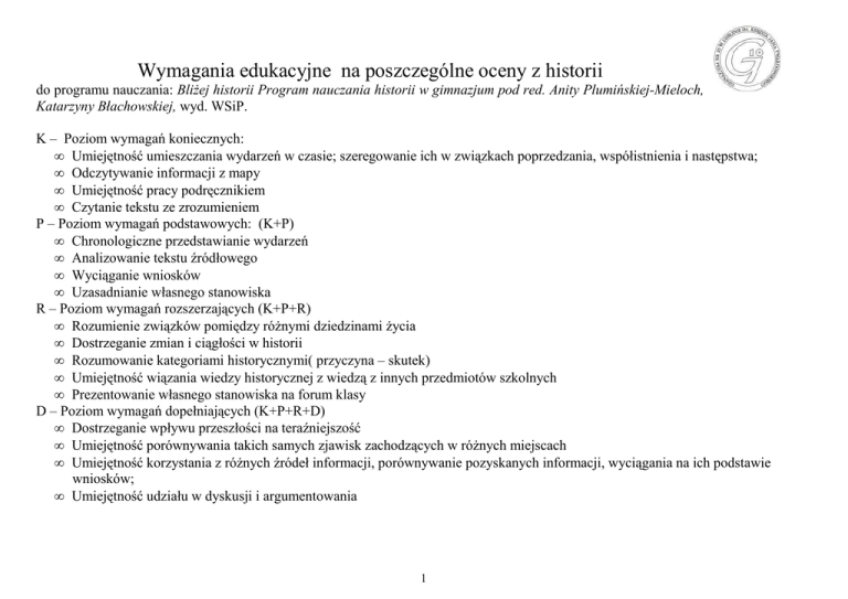 Wymagania edukacyjne na poszczególne oceny z historii do programu nauczania: Bliżej historii Program nauczania historii w gimnazjum pod red. Anity Plumińskiej-Mieloch, Katarzyny Błachowskiej, wyd. WSiP. K – Poziom wymagań koniecznych: • Umiejętność umieszczania wydarzeń w czasie; szeregowanie ich w związkach poprzedzania, współistnienia i następstwa; • Odczytywanie informacji z mapy • Umiejętność pracy podręcznikiem • Czytanie tekstu ze zrozumieniem P – Poziom wymagań podstawowych: (K+P) • Chronologiczne przedstawianie wydarzeń • Analizowanie tekstu źródłowego • Wyciąganie wniosków • Uzasadnianie własnego stanowiska R – Poziom wymagań rozszerzających (K+P+R) • Rozumienie związków pomiędzy różnymi dziedzinami życia • Dostrzeganie zmian i ciągłości w historii • Rozumowanie kategoriami historycznymi( przyczyna – skutek) • Umiejętność wiązania wiedzy historycznej z wiedzą z innych przedmiotów szkolnych • Prezentowanie własnego stanowiska na forum klasy D – Poziom wymagań dopełniających (K+P+R+D) • Dostrzeganie wpływu przeszłości na teraźniejszość • Umiejętność porównywania takich samych zjawisk zachodzących w różnych miejscach • Umiejętność korzystania z różnych źródeł informacji, porównywanie pozyskanych informacji, wyciągania na ich podstawie wniosków; • Umiejętność udziału w dyskusji i argumentowania 1 Klasa 1 Temat lekcji 1. Dlaczego uczymy się historii? Zagadnienia 1. Czym jest historia? 2. Epoki, wieki, mierzenie czasu. 3. Rodzaje źródeł historycznych. 2. Prehistoria – początki ludzkości Zagadnienia 1. Początki rodzaju ludzkiego. 2. Neandertalczycy i ludzie współcześni. 3. Życie ludzi w okresie paleolitu. Temat lekcji 3. Rewolucja neolityczna, czyli początki rolnictwa Zagadnienia 1. Rewolucja neolityczna. 2. Epoka brązu. 4. Pierwsze cywilizacje. Przykład Babilonii Zagadnienia 1. Położenie geograficzne Mezopotamii. 2. Warunki naturalne a życie mieszkańców. 3. Historia Babilonii. 4. Religia mieszkańców starożytnej Mezopotamii. 5. Osiągnięcia cywilizacyjne Międzyrzecza. 5. Starożytny Egipt Zagadnienia 1. Warunki naturalne starożytnego Egiptu. 2. Egipt darem Nilu. Ocena dopuszczająca – rozumie pojęcia: wiek, era, epoka, historia, prehistoria, źródło historyczne – oblicza upływ czasu pomiędzy erami i epokami – przypisuje daty wydarzeń do konkretnego wieku – rozumie pojęcie: homo sapiens – wie, kiedy i w jakim rejonie na Ziemi pojawił się człowiek – wymienia narzędzia, którymi posługiwali się ludzie pierwotni – opowiada o sposobach zdobywania pożywienia, mieszkaniach i ubiorach ludzi w epoce paleolitu Ocena dostateczna – wymienia epoki historyczne – wie, jakie są źródła historyczne – zna podział źródeł historycznych – wyjaśnią, dlaczego uczymy się historii Ocena dobra – przedstawia własne rozumienie konieczności nauki historii Ocena bardzo dobra – klasyfikuje źródła historyczne, posługując się przykładami – uzasadnia przydatność źródeł w pracy historyka i archeologa – rozumie pojęcia: paleolit, hominidy, neandertalczyk – zaznacza paleolit na osi czasu – umie wskazać na mapie kierunki ekspansji człowieka współczesnego – wie, dlaczego ludzie musieli żyć w grupach – dostrzega wpływ klimatu na warunki życia ludzi – wie, skąd pochodzi nazwa paleolit – rozumie wpływ warunków naturalnych na sposoby zdobywania pożywienia i mieszkania człowieka pierwotnego – rozumie i uzasadnia, dlaczego Ziemia nie była zaludniona równomiernie Ocena dopuszczająca – rozumie i wyjaśnią pojęcie neolit – umie wskazać na osi czasu neolit – umie opowiedzieć o sposobach zdobywania pożywienia, sposobach zamieszkiwania i ubiorach ludzi w epoce neolitu – wskazuje na mapie miejsca, gdzie najwcześniej rozwinęło się rolnictwo – rozumie pojęcia: Mezopotamia, pismo klinowe, politeizm, ziggurat, kodeks Hammurabiego, sieć nawadniająca – opowiada, czym zajmowali się mieszkańcy Międzyrzecza Ocena dostateczna – rozumie pojęcia: rewolucja neolityczna, plemię, ceramika, epoka brązu – wie, dlaczego rozwinęły się rolnictwo i hodowla – wie, kiedy doszło do rewolucji neolitycznej – wie, jakie zwierzęta zostały najszybciej udomowione – zna położenie geograficzne Mezopotamii – wskazuje na mapie pierwsze państwa Bliskiego Wschodu – zna postać Hammurabiego – wie, w jaki sposób mieszkańcy Babilonii czcili swoich bogów – wie, jakie były osiągnięcia cywilizacyjne Mezopotamii Ocena dobra – wskazuje wpływ klimatu na zmiany w życiu ludzi – potrafi dostrzec różnice pomiędzy epokami paleolitu, neolitu i brązu – wskazuje czynniki decydujące o rozwoju rolnictwa na obszarze Żyznego Półksiężyca Ocena bardzo dobra – rozumie, dlaczego nie wszyscy ludzie w epoce neolitu musieli zajmować się rolnictwem – potrafi wskazać rewolucyjny charakter zmian w epoce neolitu – rozumie wpływ nowych narzędzi na jakość życia ludzi – omawia wpływ warunków naturalnych Mezopotamii na życie jej mieszkańców – wie, które osiągnięcia cywilizacyjne Mezopotamii są wykorzystywane także współcześnie – wie, jakie znaczenie dla funkcjonowania państwa babilońskiego miały pismo i sieć nawadniająca – wie, co oznacza zasada „oko za oko...” – samodzielnie ocenia stosowaną w kodeksie Hammurabiego zasadę odwetu – rozumie pojęcia: faraon, system nawadniający, sieć irygacyjna, piramida, politeizm, hieroglify, papirus – znajduje i wskazuje na mapie terytorium starożytnego Egiptu – wymienia egipskie grupy społeczne, zna ich zadania – podaje przykłady osiągnięć naukowych Egiptu – rozpoznaje na ilustracjach zabytki starożytnego Egiptu i zna ich – wyjaśnią, co znaczy powiedzenie: „Egipt darem Nilu” – rozumie znaczenie sieci irygacyjnej dla rozwoju rolnictwa – rozumie, dlaczego w Egipcie powstała o