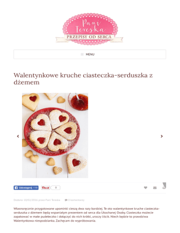 MENU Walentynkowe kruche ciasteczka-serduszka z dżemem Udostępnij 119 0 Dodano 10/02/2016 przez Pani Tereska 0 komentarzy Własnoręcznie przygotowane upominki cieszą dwa razy bardziej. Te oto walentynkowe kruche ciasteczkaserduszka z dżemem będą wspaniałym prezentem od serca dla Ukochanej Osoby. Ciasteczka możecie zapakować w małe pudełeczko i dołączyć do nich krótki, uroczy liścik. Niech będzie to prawdziwa Walentynkowa niespodzianka. Zachęcam do wypróbowania. dp OCENA PRZEPISU (5 / 5) (1 ocena/y) SKŁADNIKI CIASTO: 1 opakowanie Ciasta kruchego Dr. Oetkera 100 g masła 1 jajko PONADTO: 100-150 g gładkiego, gęstego dżemu (malinowego lub truskawkowego) Cukier puder do oprószenia SPOSÓB PRZYGOTOWANIA 1. Wszystkie składniki zagniotłam na jednolite ciasto. Następnie zawinęłam je w folię spożywczą i odłożyłam do lodówki do schłodzenia na około 30 minut. Piekarnik nagrzałam do temperatury 180°C. 2. Po tym czasie rozwałkowałam ciasto na grubość około 2-3 mm i powycinałam z niego serduszka. Ciasteczka rozdzieliłam na dwie partie. Przy pomocy malutkiej wykrawaczki w jednej partii serduszek wycięłam dziurki (małe serduszka). Następnie poukładałam je na wyłożonej papierem do pieczenia blasze z wyposażenia piekarnika. Tak przygotowane ciastka wstawiłam do nagrzanego piekarnika i piekłam około 10-13 minut. Po upieczeniu wystudziłam. 3. Wystudzone ciasteczka bez dziurki posmarowałam dżemem i przykryłam ciasteczkami z dziurką. Na koniec oprószyłam je cukrem pudrem. Kategorie: Ciasteczka, Walentynki Tagi: dżem/kon tura OCEŃ TEN PRZEPIS Średnia ocena 1 fan oceniał ten przepis. Nie ma jeszcze komentarzy. DODAJ KOMENTARZ Komentarz Imię Email Dodaj komentarz ZOBACZ PODOBNE PRZEPISY (5 / 5) Ciasto czekoladowe z malinami i kremem czekoladowym Walentynkowe blondies Różyczki z jabłek i ciasta francuskiego Drożdżowe kieszonki z czekoladą Maślane ciasteczka neonowe Bezglutenowe ciasteczka orzechowe POPULARNE PRZEPISY Pączki klasyczne Drożdżowe kieszonki z czekoladą Oponki TAGI agrest, alkohol, ananas, bakalie, banany, biała czekolada, białka wykorzystanie, biszkopty, brzoskwinie, budyń, chałwa, chili, cynamon, cytryny, czarne porzeczki, czekolada, czereśnie, czerwone porzeczki, daktyle, drożdże, dynia, dżem/kon tura, gi, frużelina, galaretka, goździki, granat, gruszki, herbatniki/ciasteczka, imbir, jabłka, jagody/borówki amerykańskie, jeżyny, jogurt, kakao, kardamon, kawa, ke r/maślanka, kisiel, kiwi, kleik ryżowy, krakersy, krem budyniowy, kwaśna śmietana, laska cynamonu, laska wanilii, majonez, mak, maliny, mango, marcepan, marchewka, masa krówkowa, mascarpone, masło orzechowe, migdały, miód, mięta, mleczko kokosowe, mleko skondesowane, mleko w proszku, morele, mąka krupczatka, mąka orkiszowa, mąka pełnoziarnista, mąka ziemniaczana, mąka żytnia, nutella, orzechy laskowe, orzechy włoskie, orzeszki ziemne, pierniczki, pigwa, pomarańcze/mandarynki, porzeczki, przyprawa korzenna, płatki owsiane, rabarbar, ricotta, rodzynki, serek homogenizowany, serek kremowy, sezam, smalec, szpinak, słonecznik, truskawki, twaróg, winogrona, wiórki kokosowe, wiśnie, śliwki, śmietanka kremówka, żelatyna, żelatyna w listkach, żurawina, żółtka wykorzystanie PANI TERESKA Mam na imię Teresa, mieszkam w Trójmieście i od przeszło trzydziestu lat pracuję w rmie Dr. Oetker w Gdańsku. Moje życie, zarówno zawodowe jak i prywatne, kręci się wokół pieczenia i gotowania, dlatego założyłam ten blog. Daje mi on możliwość dzielenia się z Wami moją pasją i jej efektami czyli moimi przepisami kulinarnymi. e-mail : [email protected] Pani Tereska Like Page 80K likes Be the first of your friends to like this © 2017 Pani Tereska - Przepisy od serca. All Rights Reserved.