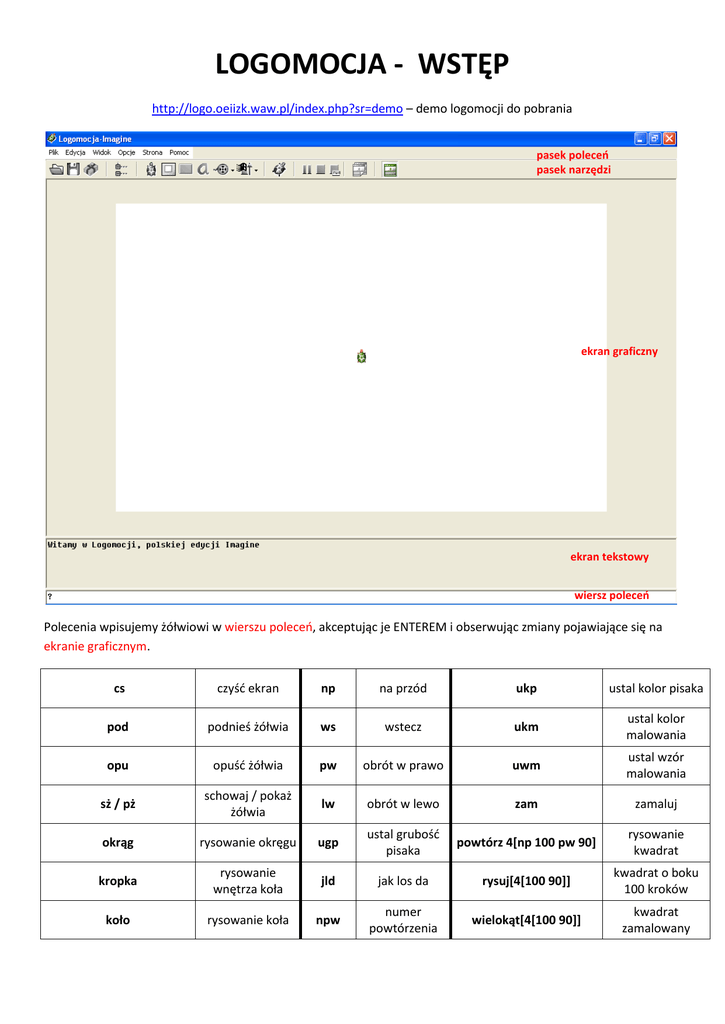LOGOMOCJA - WSTĘP http://logo.oeiizk.waw.pl/index.php?sr=demo – demo logomocji do pobrania pasek poleceń pasek narzędzi ekran graficzny ekran tekstowy wiersz poleceń Polecenia wpisujemy żółwiowi w wierszu poleceo, akceptując je ENTEREM i obserwując zmiany pojawiające się na ekranie graficznym. cs czyśd ekran np na przód ukp ustal kolor pisaka pod podnieś żółwia ws wstecz ukm ustal kolor malowania opu opuśd żółwia pw obrót w prawo uwm ustal wzór malowania sż / pż schowaj / pokaż żółwia lw obrót w lewo zam zamaluj okrąg rysowanie okręgu ugp ustal grubośd pisaka powtórz 4[np 100 pw 90] rysowanie kwadrat kropka rysowanie wnętrza koła jld jak los da rysuj[4[100 90]] kwadrat o boku 100 kroków koło rysowanie koła npw numer powtórzenia wielokąt[4[100 90]] kwadrat zamalowany