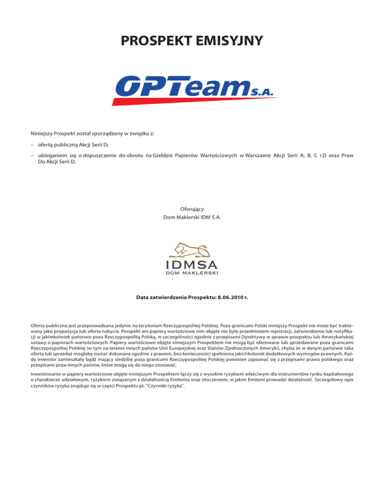 PROSPEKT EMISYJNY Niniejszy Prospekt został sporządzony w związku z: – ofertą publiczną Akcji Serii D; – ubieganiem się o dopuszczenie do obrotu na Giełdzie Papierów Wartościowych w Warszawie Akcji Serii A, B, c i D oraz Praw Do Akcji Serii D. Oferujący Dom Maklerski iDM S.A. Data zatwierdzenia Prospektu: 8.06.2010 r. Oferta publiczna jest przeprowadzana jedynie na terytorium rzeczypospolitej Polskiej. Poza granicami Polski niniejszy Prospekt nie może być traktowany jako propozycja lub oferta nabycia. Prospekt ani papiery wartościowe nim objęte nie były przedmiotem rejestracji, zatwierdzenia lub notyfikacji w jakimkolwiek państwie poza rzeczypospolitą Polską, w szczególności zgodnie z przepisami Dyrektywy w sprawie prospektu lub Amerykańskiej ustawy o papierach wartościowych. Papiery wartościowe objęte niniejszym Prospektem nie mogą być oferowane lub sprzedawane poza granicami rzeczypospolitej Polskiej (w tym na terenie innych państw Unii Europejskiej oraz Stanów Zjednoczonych Ameryki), chyba że w danym państwie taka oferta lub sprzedaż mogłaby zostać dokonana zgodnie z prawem, bez konieczności spełnienia jakichkolwiek dodatkowych wymogów prawnych. Każdy inwestor zamieszkały bądź mający siedzibę poza granicami rzeczypospolitej Polskiej powinien zapoznać się z przepisami prawa polskiego oraz przepisami praw innych państw, które mogą się do niego stosować. inwestowanie w papiery wartościowe objęte niniejszym Prospektem łączy się z wysokim ryzykiem właściwym dla instrumentów rynku kapitałowego o charakterze udziałowym, ryzykiem związanym z działalnością Emitenta oraz otoczeniem, w jakim Emitent prowadzi działalność. Szczegółowy opis czynników ryzyka znajduje się w części Prospektu pt. ”czynniki ryzyka”. część i - Spis Treści CZĘŚĆ I SPIS TREŚCI CZĘŚĆ I SPIS TREŚCI.......................................................................................................................................................... 1 OSTRZEŻENIE......................................................................................................................................................................................................................6 CZĘŚĆ II PODSUMOWANIE................................................................................................................................................ 6 A. PODSTAWOWE INFORMACJE O SPÓŁCE.............................................................................................................................................6 B.CZYNNIKI RYZYKA.......................................................................................................................................................................................9 C.INFORMACJE O OSOBACH ZARZĄDZAJACYCH, OSOBACH NADZORUJĄCYCH ORAZ DORADCACH I BIEGŁYCH REWIDENTACH................................................................................................................................................................................................ 10 D.CELE EMISJI I WYKORZYSTANIE WPŁYWÓW PIENIĘŻNYCH........................................................................................................11 E.INFORMACJE FINANSOWE, WYNIKI PRZEDSIĘBIORSTWA, SYTUACJA FINANSOWA ORAZ PERSPEKTYWY............ 12 F. ZNACZĄCY AKCJONARIUSZE I TRANSAKCJE Z PODMIOTAMI POWIĄZANYMI.................................................................. 14 G. SZCZEGÓŁY OFERTY I DOPUSZCZENIA DO OBROTU................................................................................................................... 18 H.INFORMACJE DODATKOWE.................................................................................................................................................................. 19 CZĘŚĆ III CZYNNIKI RYZYKA............................................................................................................................................ 20 1.CZYNNIKI RYZYKA.................................................................................................................................................................................... 20 1.1.CZYNNIKI ZWIĄZANE Z OTOCZENIEM, W JAKIM GRUPA KAPITAŁOWA EMITENTA PROWADZI DZIAŁALNOŚĆ..... 20 1.1.1.RYZYKO ZWIĄZANE Z WPŁYWEM SYTUACJI MAKROEKONOMICZNEJ NA DZIAŁALNOŚĆ GRUPY KAPITAŁOWEJ EMITENTA.................................................................................................................................................................................................... 20 1.1.2.RYZYKO OTOCZENIA PRAWNEGO ORAZ NIESTABILNOŚCI POLSKIEGO SYSTEMU PODATKOWEGO......................... 20 1.1.3.RYZYKO ZWIĄZANE ZE ZMIANAMI TECHNOLOGICZNYMI W BRANŻY I ROZWOJEM NOWYCH PRODUKTÓW..... 20 1.1.4.RYZYKO WYNIKAJĄCE Z KONSOLIDACJI BRANŻY........................................................................................................................ 20 1.1.5.RYZYKO KONKURENCJI.......................................................................................................................................................................... 21 1.2.CZYNNIKI RYZYKA ZWIĄZANE Z DZIAŁALNOŚCIĄ GRUPY KAPITAŁOWEJ EMITENTA..................................................... 21 1.2.1.RYZYKO ZWIĄZANE ZE ZMIANĄ WARUNKÓW HANDLOWYCH PRZEZ DOSTAWCÓW.................................................... 21 1.2.2.RYZYKO WYNIKAJĄCE Z KRÓTKIEGO CZASU ŻYCIA PRODUKTÓW........................................................................................ 21 1.2.3.RYZYKO ZWIĄZANE Z PROJEKTAMI INFORMATYCZNYMI REALIZOWANYMI PRZEZ GRUPĘ KAPITAŁOWĄ EMITENTA........................................................................................................................................................................................................... 21 1.2.4.RYZYKO ZAGROŻENIA BEZPIECZEŃSTWA SYSTEMÓW EM