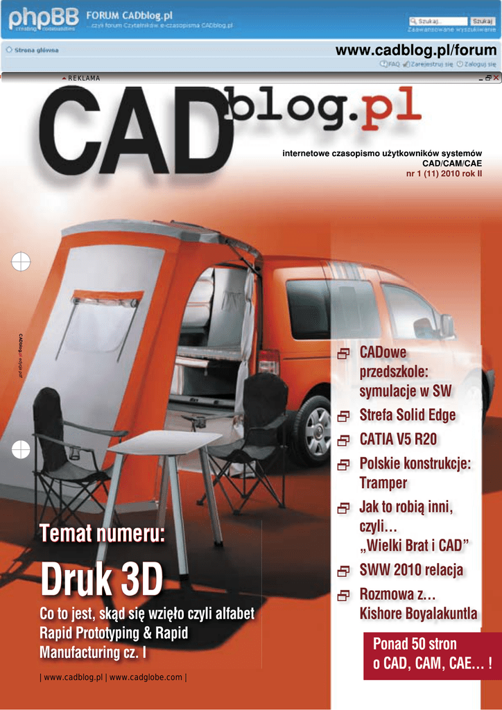www.cadblog.pl/forum REKLAMA internetowe czasopismo użytkowników systemów CAD/CAM/CAE nr 1 (11) 2010 rok II CADblog.pl edycja pdf CADowe przedszkole: symulacje w SW Strefa Solid Edge CATIA V5 R20 Polskie konstrukcje: Tramper Temat numeru: Druk 3D Co to jest, skąd się wzięło czyli alfabet Rapid Prototyping & Rapid Manufacturing cz. I | www.cadblog.pl | www.cadglobe.com | Jak to robią inni, czyli... „Wielki Brat i CAD” SWW 2010 relacja Rozmowa z... Kishore Boyalakuntla Ponad 50 stron o CAD, CAM, CAE... ! CADblog.pl Od redakcji ...także tym razem tylko kilka słów, żeby nie opóźniać jeszcze bardziej pierwszego naprawdę tegorocznego numeru. W końcu trzeba jeszcze przygotować plik postscript, z niego „skręcić” pdf, dodać aktywne łącza, wrzucić do archiwum na ftp, uaktualnić zakładkę Archiwum na stronie... ech, a wydawałoby się, że już tak blisko, że już widać światełko w tunelu, że „już witał się z gąską”... O problemach i piętrzących się – nierzadko bardzo prozaicznych (głupich wręcz) przyczynach tego opóźnienia dzieliłem się z Państwem na blogu. To „dzielenie się” nie wszystkim przypadło do gustu (vide forum – „Postulaty Czytelników”), ale taka jest specyfika blogu. Pozostaje podziękować zdecydowanej większości (nie)cierpliwie wyglądającej kolejnego e-wydania, ale także wszystkim tym, którym nie szkoda czasu na konstruktywną krytykę. Ale teraz przekazuję pierwsze tegoroczne wydanie... jeszcze nie w Państwa ręce, ale przed Państwa oczy. Długo wyczekiwane zapewne nie będzie mogło liczyć na żadne ulgowe traktowanie, ale także nie o to chodzi. Istotą jest, by zawarte w nim informacje, nawet jeśli nie dla wszystkich okażą się użyteczne, były przynajmniej interesujące. A to chyba udaje się osiągnąć, o czym świadczy stale rosnąca liczba pobrań wydań archiwalnych. Mam więc nadzieję, że podobnie jak poprzednie, spotka się z życzliwym przyjęciem. Nie przewiduję możliwości opublikowania kolejnego wydania... przed nadchodzącymi Świętami Wielkanocy. Dlatego korzystając z tej okazji, pragnę złożyć Państwu... Serdeczne Życzenia Radosnych Świąt Zmartwychwstania Pańskiego! A przecież dziwne to Święta... Z jednej strony okres Postu, przeżywania Męki Pańskiej („Pasja” w reż. Mela Gibsona już czeka na swoje kolejne coroczne odtworzenie), a z drugiej radość z owej najwspanialszej obietnicy, jaka mogła zostać nam złożona... I, w odróżnieniu od różnych obietnic składanych na tych łamach, ta zostanie dotrzymana na pewno. A do życzeń dokładam jeszcze Tradycyjnie Interesującej lektury Maciej CADblogger Stanisławski P.S. I mokrego dyngusa ;) Średni nakład (wg. dotychczasowej liczby pobrań) wynosi ponad 1800 egzemplarzy CADblog.pl www.cadblog.pl internetowy magazyn użytkowników CAD CAM CAE redaktor naczelny: Maciej Stanisławski, [email protected], kom.: 0602 336 579 adres redakcji: ul. Pilicka 22, 02-613 Warszawa wydawca: Studio Graficzne Stanisławski – Maciej Stanisławski opracowanie graficzne, DTP: jw. ([email protected]) 2 CADblog.pl jest tytułem prasowym zarejestrowanym w krajowym rejestrze dzienników i czasopism na podstawie postanowienia Sądu Okręgowego Warszawa VII Wydział Cywilny rejestrowy Ns Rej. Pr. 244/09 z dnia 31.03.2009 poz. Pr 15934 edycja pdf wydanie 9(10) 2009 CADblog.pl CADblog.pl edycja pdf Wstępniak, jak zwykle, na koniec... W numerze wydanie 1 (11) 2010 Systemy CAD w praktyce 4 W oczekiwaniu na następcę: CATIA V5 R20 Chociaż wiele mówiło się już (i mówi nadal) o V6, dla większości użytkowników standardem jest CATIA V5. Jej najnowsza rewizja pojawiła się z solidnym opóźnieniem – zamiast premiery pod koniec roku 2009, użytkownicy dopiero w lutym 2010 otrzymali możliwość przetestowania nowej wersji popularnej „Kaśki”. Ale nie powinni czuć się zawiedzeni... Strefa Solid Edge 8 Sferyczne wgłębienie... 9 Kontakt liniowy i kontakt typu „sklejone”... CADowe przedszkole 11 Analizy i symulacje z SimulationXpress Jak to robią inni... 17 „Wielki Brat” i CAD CADblog.pl edycja pdf Nie tak dawno, w ramach Aktualności na CADblogowej stronie, zamieściłem informację o pomyślnym oblocie rosyjskiego myśliwca nowej generacji, o oznaczeniu kodowym PAK FA. Najmłodszy zrealizowany projekt zakładów – czy już raczej – koncernu Suchoj nawet największym sceptykom powinien zasygnalizować, iż potencjału technologicznego i intelektualnego Rosjan nie należy lekceważyć. (...) Temat numeru: 26 „Drukowanie” ...nożem? Przegląd współczesnych technologii szybkiego prototypowania Każda większa konferencja związana z systemami CAx stwarza okazję do zapoznania się z metodami szybkiego prototypowania, określanymi bardzo często mianem „druku 3D”. Większość czytających te słowa zetknęła się już zapewne z prototypami uzyskanymi na maszynach, których zasada działania zbliżona jest często do zwykłych drukarek komputerowych. (...) Warto przeczytać... 33 „NX CAM. Programowanie ścieżek dla obrabiarek CNC” Polskie konstrukcje i projekty... 34 Tramper z Poznania Wydarzenia 42 Krótka (i subiektywna) relacja z SolidWorks World 2010 Rozmowa z... 50 Analizy i symulacje z poziomu SolidWorks… edycja pdf wydanie 8(9) 2009 CADblog.pl 3 Systemy CAD w praktyce Nowoœci CATIA V5 R20 Rys. 1. Dynamiczne przekroje z poziomu części – Dynamic Sectioning W oczekiwaniu na następcę: Chociaż wiele mówiło się już (i mówi nadal) o V6, dla większości użytkowników standardem jest CATIA V5. Jej najnowsza rewizja pojawiła się z solidnym opóźnieniem – zamiast premiery pod koniec roku 2009, użytkownicy dopiero w lutym 2010 otrzymali możliwość przetestowania nowej wersji popularnej „Kaśki”. Ale nie powinni czuć się zawiedzeni... AUTOR: Sebastian Radowski, KS Automotive P ierwszym nowym narzędziem, które wyłapie czujne oko, jest możliwość wykonania dynamiczne