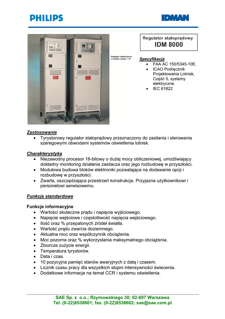 Specyfikacja • FAA AC 150/5345-10E. • ICAO Podręcznik Projektowania Lotnisk, Część 5, systemy elektryczne. • IEC 61822 Zastosowanie • Tyrystorowy regulator stałoprądowy przeznaczony do zasilania i sterowania szeregowymi obwodami systemów oświetlenia lotnisk. Charakterystyka • Niezawodny procesor 16-bitowy o dużej mocy obliczeniowej, umożliwiający dokładny monitoring działania zasilacza oraz jego rozbudowę w przyszłości. • Modułowa budowa bloków elektroniki pozwalająca na dodawanie opcji i rozbudowę w przyszłości. • Zwarta, oszczędzająca przestrzeń konstrukcja. Przyjazna użytkownikowi i personelowi serwisowemu. Funkcje standardowe Funkcje informacyjne • Wartości skuteczne prądu i napięcia wyjściowego. • Napięcie wejściowe i częstotliwość napięcia wejściowego. • Ilość oraz % przepalonych źródeł światła. • Wartość prądu zwarcia doziemnego. • Aktualna moc oraz współczynnik obciążenia. • Moc pozorna oraz % wykorzystania maksymalnego obciążenia. • Zbiorcze zużycie energii. • Temperatura tyrystorów. • Data i czas. • 10 pozycyjna pamięć stanów awaryjnych z datą i czasem. • Licznik czasu pracy dla wszystkich stopni intensywności świecenia. • Dodatkowe informacje na temat CCR i systemu oświetlenia. SAE Sp. z o.o.; Rzymowskiego 30; 02-697 Warszawa Tel. (0-22)8538601; fax. (0-22)8538602; [email protected] Funkcje monitorowania – przepalenie źródeł światła • Dokładność +/- 1 źródło światła do 10 awarii i +/-3 źródła do 30 awarii na wszystkich stopniach intensywności świecenia, przy obciążeniach od 50% do 100% znamionowej mocy regulatora. • Ilość i % przepalonych źródeł światła. • 2 poziomy alarmowe z regulowanym progiem i czasem opóźnienia oraz zdalnym wskazaniem stanu awaryjnego. Funkcje monitorowania – spadek VA • Monitorowanie wartości mocy pozornej w stosunku do zarejestrowanej mocy maksymalnej. • Możliwość wyłączenia np. po otrzymaniu sygnału o zmianie ustawień kątowych PAPI (PAPI-tilt). • 2 poziomy alarmowe z regulowanym progiem i czasem opóźnienia oraz zdalnym wskazaniem stanu awaryjnego. Funkcje zabezpieczające Wszystkie funkcje zabezpieczające mają regulowany poziom załączenia oraz opóźnienia czasowego. Użytkownik może wybrać również tryb kasowania oraz zdalnego wskazania w systemie: • Otwarcie obwodu. • Przeciążenie prądowe. Zabezpieczenia dwupoziomowe: pierwszy poziom zadziałania jest sygnałem ostrzegawczym a drugi poziom jest poziomem wyłączenia: • Napięcie wejściowe: 2 poziomy. • Częstotliwość wejściowa: 2 poziomy. • Temperatura: 2 poziomy. Zespół zasilający • Suchy transformator z odczepami do dopasowania regulatora do rzeczywistego obciążenia systemu, dzięki czemu poprawia się podstawowy współczynnik mocy. • Zintegrowane pary tyrystorów ze sterownikiem oraz filtr RC gwarantujący pewność działania. • Bierny filtr LC, tłumiący wyższe harmoniczne i zakłócenia radiowe. • • • Interfejs sterowania lokalnego Ruchowy przełącznik obrotowy: praca zdalna/wyłączony/stopnie intensywności. Wszystkie komunikaty (ekrany), funkcje monitorowania oraz zabezpieczenia są w prosty sposób zobrazowane na wyświetlaczu ciekłokrystalicznym i sterowane 5-ma przyciskami typu soft touch. Interfejsy sterowania zdalnego Sterowanie równoległe: • Wybieralny tryb sterowania dziesiętny/dwójkowy oraz statyczny/impulsowy. • Wybieralne napięcie sterowania 24/48/60 VDC. • Wybieralne kroki awaria-praca normalna dla opcji sterowania statycznego. • 24 styki bezpotencjałowe dla sygnałów zwrotnych. • Opcjonalnie zabudowane źródło zasilania DC. Sterowanie szeregowe: • Dostępne karty field-bus do zabudowy na większości typach szyn. • Opcjonalnie zdublowany interfejs. • Możliwość przesyłania dodatkowych danych np. liczba źródeł światła, oporność izolacji itp. SAE Sp. z o.o.; Rzymowskiego 30; 02-697 Warszawa Tel. (0-22)8538601; fax. (0-22)8538602; [email protected] Zespoły dodatkowe – opcje Miernik poziomu zwarcia doziemnego (E) • Zakres pomiarowy od 10 kΩ do 50MΩ. • Wskazanie oporności izolacji oraz 2 poziomów alarmowych z regulowaną wartością progową, czasem opóźnienia oraz wskazaniem zdalnego sterowania. • Możliwość wyboru trybu serwisowego dającego podwyższony poziom zabezpieczenia osiągany przez przełączenie regulatora na 2-gi poziom alarmu zwarcia doziemnego. Zmieniacz kierunków (1) • Możliwość zasilania i sterowania dwoma kierunkami świecenia przy pomocy dedykowanego przełącznika sterującego. • Przełączanie bezprądowe dla zapewnienia maksymalnej żywotności źródeł światła i styczników. Przełącznik wyboru obwodów (2-4) • Do 4 obwodów sterowanych przy pomocy przełączników zintegrowanych z wyświetlaczem. • Ustawialny poziom niskoprądowy w czasie wyłączania obwodów, aby zapewnić maksymalną żywotność źródeł światła i minimalne migotanie świateł. Ograniczniki przepięć (S) • Na życzenie mogą być zainstalowane wysokonapięciowe ograniczniki przepięć na wyjściu i normalne na wejściu. Zaczepy do unoszenia regulatora (L) • 4 ucha do unoszenia i przenoszenia regulatora. Koła (W) • 2 stałe koła z tyłu obudowy regulatora. • 2 obrotowe koła z przodu obudowy regulatora. Szeregowy przełącznik-zwora (U) • Zabudowany tylko w regulatorach jednowyjściowych. Blok zacisków (B) • Równoległy interfejs D37 podłączony do bloku dodatkowych zacisków. Parametry techniczne Napięcie zasilające: 130V -15 … +10%/50Hz dla urządzeń poniżej 5kVA 400V -15 … +10%/50Hz dla urządzeń powyżej 5kVA Pełne wyłączenie do -10%. Poziomy mocy: 3/4/5/7 ½ /10/12 ½ /15/17 ½ /20/25/30 kVA Prąd wyjściowy: Znamionowy: 6,6A Stopnie intensywności świecenia: Sterowanie standardowe 7-o stopniowe. Inna ilość stopni dostępna na życzenie. Zdalne sterowanie: Interfejs szeregowy lub równ