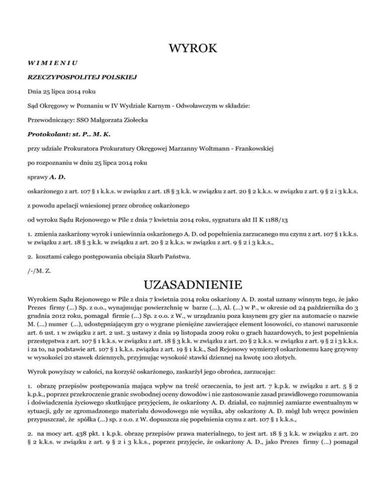WYROK WIMIENIU RZECZYPOSPOLITEJ POLSKIEJ Dnia 25 lipca 2014 roku Sąd Okręgowy w Poznaniu w IV Wydziale Karnym - Odwoławczym w składzie: Przewodniczący: SSO Małgorzata Ziołecka Protokolant: st. P.. M. K. przy udziale Prokuratora Prokuratury Okręgowej Marzanny Woltmann - Frankowskiej po rozpoznaniu w dniu 25 lipca 2014 roku sprawy A. D. oskarżonego z art. 107 § 1 k.k.s. w związku z art. 18 § 3 k.k. w związku z art. 20 § 2 k.k.s. w związku z art. 9 § 2 i 3 k.k.s. z powodu apelacji wniesionej przez obrońcę oskarżonego od wyroku Sądu Rejonowego w Pile z dnia 7 kwietnia 2014 roku, sygnatura akt II K 1188/13 1. zmienia zaskarżony wyrok i uniewinnia oskarżonego A. D. od popełnienia zarzucanego mu czynu z art. 107 § 1 k.k.s. w związku z art. 18 § 3 k.k. w związku z art. 20 § 2 k.k.s. w związku z art. 9 § 2 i 3 k.k.s., 2. kosztami całego postępowania obciąża Skarb Państwa. /-/M. Z. UZASADNIENIE Wyrokiem Sądu Rejonowego w Pile z dnia 7 kwietnia 2014 roku oskarżony A. D. został uznany winnym tego, że jako Prezes firmy (...) Sp. z o.o., wynajmując powierzchnię w barze (...), Al. (...) w P., w okresie od 24 października do 3 grudnia 2012 roku, pomagał firmie (...) Sp. z o.o. z W., w urządzaniu poza kasynem gry gier na automacie o nazwie M. (...) numer (...), udostępniającym gry o wygrane pieniężne zawierające element losowości, co stanowi naruszenie art. 6 ust. 1 w związku z art. 2 ust. 3 ustawy z dnia 19 listopada 2009 roku o grach hazardowych, to jest popełnienia przestępstwa z art. 107 § 1 k.k.s. w związku z art. 18 § 3 k.k. w związku z art. 20 § 2 k.k.s. w związku z art. 9 § 2 i 3 k.k.s. i za to, na podstawie art. 107 § 1 k.k.s. związku z art. 19 § 1 k.k., Sad Rejonowy wymierzył oskarżonemu karę grzywny w wysokości 20 stawek dziennych, przyjmując wysokość stawki dziennej na kwotę 100 złotych. Wyrok powyższy w całości, na korzyść oskarżonego, zaskarżył jego obrońca, zarzucając: 1. obrazę przepisów postępowania mająca wpływ na treść orzeczenia, to jest art. 7 k.p.k. w związku z art. 5 § 2 k.p.k., poprzez przekroczenie granic swobodnej oceny dowodów i nie zastosowanie zasad prawidłowego rozumowania i doświadczenia życiowego skutkujące przyjęciem, że oskarżony A. D. działał, co najmniej zamiarze ewentualnym w sytuacji, gdy ze zgromadzonego materiału dowodowego nie wynika, aby oskarżony A. D. mógł lub wręcz powinien przypuszczać, że spółka (...) sp. z o.o. z W. dopuszcza się popełnienia czynu z art. 107 § 1 k.k.s., 2. na mocy art. 438 pkt. 1 k.p.k. obrazę przepisów prawa materialnego, to jest art. 18 § 3 k.k. w związku z art. 20 § 2 k.k.s. w związku z art. 9 § 2 i 3 k.k.s., poprzez przyjęcie, że oskarżony A. D., jako Prezes firmy (...) pomagał firmie (...) Sp. z o.o. z siedzibą w W. w urządzaniu poza kasynem gry gier na automacie o nazwie M. (...) numer (...) udostępniającym gry o wygrane pieniężne zawierające elementy losowości. Podnosząc powyższe zarzuty obrońca wniósł o: 1. zmianę zaskarżonego wyroku i uniewinnienie oskarżonego od dokonania przypisanego mu czynu ewentualnie o 2. uchylenie wyroku i przekazanie sprawy do ponownego rozpoznania Sądowi Rejonowemu w Pile. Sąd Okręgowy zważył, co następuje: Apelacja obrońcy oskarżonego A. D. okazała się być w pełni zasadną. Po zapoznaniu się z materiałem dowodowym niniejszej sprawy, treścią wyroku, jego pisemnym uzasadnieniem oraz apelacja obrońcy oskarżonego, Sąd Okręgowy stwierdził, że Sąd I instancji prawidłowo ustalił stan faktyczny, lecz wadliwie uznał, iż ustalone postępowanie oskarżonego A. D. wyczerpało znamiona przestępstwa określonego w art. 107 § 1 k.k.s. w związku z art. 18 § 3 k.k. w związku z art. 20 § 2 k.k.s. w związku z art. 9 § 2 i 3 k.k.s. Nie budzi żadnych wątpliwości, że oskarżony A. D., jako Prezes firmy (...) Sp. z o.o., w okresie od 24 października do 3 grudnia 2012 roku, wynajął firmie (...) Sp. z o.o. z W. powierzchnię w barze (...), Al. (...) w P. w celu postawienia tam automatu do gier o nazwie M. (...) numer (...). Przeprowadzona zaś w dniu 3 grudnia 2012 roku przez funkcjonariuszy Urzędu Celnego w P. kontrola, potwierdzona następnie ekspertyzą biegłego sądowego z zakresu informatyki, wykazała, że gry odbywające się za pośrednictwem automatu do gier o nazwie M. (...) numer (...) należą do kategorii gier o wygrane pieniężne o charakterze komercyjnym i losowym. Tym samym usytuowanie tego automatu w barze (...), Al. (...) w P. stanowiło naruszenie art. 6 ust. 1 w związku z art. 2 ust. 3 ustawy z dnia 19 listopada 2009 roku o grach hazardowych. Bazując na takim stanie faktycznym Urząd Celny w P. postawił oskarżonemu zarzut popełnienia przestępstwa z art. 107 § 1 k.k.s. w związku z art. 18 § 3 k.k. w związku z art. 20 § 2 k.k.s. w związku z art. 9 § 2 i 3 k.k.s., a Sąd Rejonowy w Pile uznał oskarżonego winnym popełnienia takiego przestępstwa i skazał go na karę grzywny. Takiego stanowiska obu tych organów wymiaru sprawiedliwości Sąd Okręgowy w Poznaniu nie podzielił. Zgodnie z przepisem art. 18 § 3 k.k. odpowiada za pomocnictwo ten, kto w zamiarze, aby inna osoba dokonała czynu zabronionego, swoim zachowaniem ułatwia jego popełnienie. A więc udzielający pomocy obejmować musi swą świadomością to, że podejmując określone czynności ułatwia w ten sposób innej osobie popełnienie czynu zabronionego oraz musi obejmować swą świadomością także i to, że czyni to w odniesieniu do konkretnego, scharakteryzowanego w odpowiednim przepisie części szczególnej lub przepisie pozakodeksowym czynu zabronionego oraz w odniesieniu do indywidualnie oznaczonej osoby bezpośredniego wykonawcy (por. wyrok Sądu Najwyższego z dnia 10 maj 1982 roku RW 317/82 OSNKW 1982 z. 10 – 11, poz. 72; postanowienie Sądu Najwyższego z dnia 20 października 2005 roku II KK 184/05 OSNKW 2005 z. 12 poz. 120) . Udziel