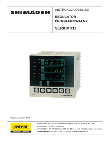 INSTRUKCJA OBSŁUGI REGULATOR PROGRAMOWALNY SERII MR13 Wydanie kwiecień 2007 PRZEDSIĘBIORSTWO AUTOMATYZACJI I POMIARÓW INTROL Sp. z o.o. ul. Kościuszki 112, 40-519 Katowice tel. 032/ 205 33 44, 789 00 00, fax 032/ 205 33 77, e-mail: [email protected], www.introl.pl Dział temperatur: tel. 032/ 78 90 130, e-mail: [email protected] INTROL Sp. z o.o., ul. Kościuszki 112, 40-519 Katowice, tel.: 32/78 90 130, faks: 32/2053377, e-mail: [email protected], www.introl.pl SPIS TREŚCI Wstęp ................................................................................................................................ 3 1. Wprowadzenie ............................................................................................................. 6 1.1 Sprawdzenie przed rozpoczęciem użytkowania ...................................................... 6 1.2 Ostrzeżenie dotyczące użytkowania........................................................................ 7 2. Montaż i łączenie przewodów..................................................................................... 8 2.1 Miejsce zamontowania (warunki otoczenia) ........................................................... 8 2.2 Montaż..................................................................................................................... 8 2.3 Wymiary zewnętrzne i wycięcia montażowe w tablicy przyrządów ...................... 9 2.4 Podłączenie przewodów .......................................................................................... 9 2.5 Schemat układu zacisków ......................................................................................11 2.6 Tabela układu zacisków......................................................................................... 12 3. Płyta przednia ............................................................................................................ 14 3.1 Schemat płyty przedniej i nazwy części ................................................................ 14 3.2 Objaśnienia dotyczące płyty przedniej .................................................................. 14 4. Ekrany ........................................................................................................................ 17 4.1 Włączenie zasilania i wyświetlenie ekranów początkowych ................................ 17 4.2 Schemat nastawień ................................................................................................ 18 4.3 Układ ekranów ...................................................................................................... 21 4.4 Jak zmieniać ekrany .............................................................................................. 22 4.5 Przełączanie kanału dla dowolnego ekranu .......................................................... 23 4.6 Zmiana danych na dowolnym ekranie .................................................................. 23 4.7 Ekrany grupy 0 ...................................................................................................... 24 4.8 Ekrany grupy 1 ...................................................................................................... 26 5. Uzupełnienie............................................................................................................... 28 5.1 Tabela kodów zakresów pomiarowych ................................................................. 28 5.2 Tabela kodów typu zdarzenia ................................................................................ 30 5.3 Komunikaty błędów .............................................................................................. 31 6. Dane techniczne ......................................................................................................... 32 Dziękujemy za zakup regulatora Shimaden serii MR13. Prosimy o sprawdzenie, czy dostarczony wyrób dokładnie odpowiada złożonemu zamówieniu. Prosimy nie zaczynać korzystania z naszego produktu przed uważnym przeczytaniem niniejszej instrukcji obsługi i dobrym zrozumieniem jej treści. Adnotacja Należy zapewnić, aby niniejsza Instrukcja obsługi została dostarczona ostatecznemu użytkownikowi przyrządu. 2 INTROL Sp. z o.o., ul. Kościuszki 112, 40-519 Katowice, tel.: 32/78 90 130, faks: 32/2053377, e-mail: [email protected], www.introl.pl Wstęp Niniejsza instrukcja obsługi przeznaczona jest dla personelu zaangażowanego w montaż, podłączanie, obsługę i planową konserwację regulatora serii MR13. Instrukcja omawia sposób obchodzenia się z regulatorem, montaż, łączenie przewodów, jego funkcje oraz obsługę. Zaleca się przechowywanie jej w pobliżu miejsca, gdzie pracuje MR13. Przy korzystaniu z przyrządu, należy zawsze stosować się do zaleceń zawartych w instrukcji. Jeżeli chodzi o sprawy dotyczące bezpieczeństwa oraz potencjalnej możliwości zniszczenia sprzętu i / lub wyposażenia, to dodatkowe wyjaśnienia i zalecenia zostały podane z poniższymi oznaczeniami: Ostrzeżenie Zachować najwyższą ostrożność zgodnie z opisem. Ten nagłówek wskazuje wystąpienie stanu zagrożenia, który może spowodować obrażenia ciała, a nawet śmierć obsługujących. Ostrzeżenie Zachować najwyższą ostrożność zgodnie z opisem. Ten nagłówek wskazuje wystąpienie stanu zagrożenia, który może spowodować zniszczenie sprzętu i / lub wyposażenia. Uwaga Ten nagłówek sygnalizuje dodatkowe zalecenia, uwagi i objaśnienia. Znak oznacza zacisk przewodu ochronnego. Należy pamiętać o jego dobrym uziemieniu. Sprawy dotyczące bezpieczeństwa Ostrzeżenie Regulator serii MR13 jest przeznaczony do sterowania temperaturą, wilgotnością i innymi wielkościami fizycznymi. Nie wolno go stosować w żaden sposób, mogący wpływać ujemnie na warunki bezpieczeństwa, zdrowie lub warunki pracy osób mających kontakt ze skutkami działania przyrządu. Przy stosowaniu, należy zapewnić w każdym przypadk