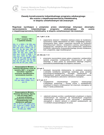 Centrum Metodyczne Pomocy Psychologiczno-Pedagogiczne Oprac. Grażyna Kowalczyk –––––––––––––––––––––––––––––––––––––––––––––––––––––––––––––––––––––––––––––– Zasady konstruowania indywidualnego programu edukacyjnego dla ucznia z niepełnosprawnością intelektualną w stopniu umiarkowanym lub znacznym Regulacje wynikające z przepisów prawa oświatowego dotyczące obowiązku opracowywania indywidualnego programu edukacyjnego dla ucznia z niepełnosprawnością intelektualną w stopniu umiarkowanym lub znacznym art. 1 pkt 1, 4, 5a Ustawa z dnia 7 września 1991 r. o systemie oświaty zapewnienie dzieciom i młodzieży realizacji prawa do kształcenia, wychowania i opieki odpowiednich do wieku i osiągniętego rozwoju; dostosowanie treści, metod i organizacji nauczania do możliwości psychofizycznych dziecka i korzystania z pomocy psychologicznopedagogicznej i specjalnych form pracy dydaktycznej; zapewnienie możliwości realizowania zindywidualizowanego procesu kształcenia, form, programów, zajęć rewalidacyjnych (Dz. U. z 2004 r. Nr 256, poz. 2572, Nr 273, poz. 2703, Nr 281, poz. 2781; z 2005 r. Nr 17, poz.141, Nr 94, poz. 788, Nr 122, poz.1020, Nr 131, poz. 1091, Nr 167, poz. 1400, Nr 249, poz. 2104; z 2006 r. Nr art. 22a ust. 1 i 2 144, poz. 1043, Nr 208, poz. 1532, Nr 227, poz.1658; z 2007 przyznanie nauczycielowi prawa wyboru programów i podręczników r. Nr 42, poz.273, Nr 80, poz. spośród programów i podręczników dopuszczonych do użytku 542, Nr 115, poz. 791, Nr 120, szkolnego, a także prawa do opracowania własnego programu poz. 818, Nr 181, poz. 1292) wychowania przedszkolnego lub programu nauczania Rozporządzenie Ministra Edukacji Narodowej z dnia 30 kwietnia 2007 r. w sprawie warunków i sposobu oceniania, klasyfikowania i promowania uczniów… (Dz. U. Nr 83, poz. 562, Nr 130, poz. 906; z 2008 r. Nr 3, poz. 9) Rozporządzenie Ministra Edukacji Narodowej i Sportu z dnia 26 lutego 2002 r. w sprawie podstawy programowej wychowania przedszkolnego oraz kształcenia ogólnego… (Dz. U. Nr 51, poz. 458 z późn. zm., w tym zm. z 2005 r. Nr 19, poz. 165 – zał. nr 1 i 3; z 2006 r. Nr 228, poz. 1669) § 6 ust. 3 obowiązek nauczyciela dostosowania, na podstawie orzeczenia o potrzebie kształcenia specjalnego wydanego przez poradnię psychologiczno-pedagogiczną, wymagań edukacyjnych do indywidualnych potrzeb psychofizycznych i edukacyjnych ucznia, u którego stwierdzono zaburzenia i odchylenia rozwojowe… § 11 ust. 2 i 7 uwzględnienie indywidualnego programu edukacyjnego w klasyfikacji śródrocznej i rocznej ucznia z upośledzeniem umysłowym w stopniu umiarkowanym lub znacznym, począwszy od klasy IV szkoły podstawowej zależność edukacji uczniów z upośledzeniem umysłowym w stopniu umiarkowanym lub znacznym od indywidualnych programów edukacyjnych opracowanych przez nauczycieli i specjalistów pracujących z dziećmi zarówno w szkołach podstawowych, jak i w szkołach przysposabiających do pracy Centrum Metodyczne Pomocy Psychologiczno-Pedagogicznej Oprac. Grażyna Kowalczyk Rozporządzenie Ministra Edukacji Narodowej z dnia 18 § 4 ust. 4 stycznia 2005 r. w sprawie warunków organizowania obowiązek opracowywania - na podstawie wielospecjalistycznej kształcenia, wychowania oceny poziomu funkcjonowania ucznia - oraz modyfikowania i opieki dla dzieci i młodzieży indywidualnego programu edukacyjnego określającego zakres niepełnosprawnych… zintegrowanych działań nauczycieli i specjalistów, rodzaj zajęć w specjalnych przedszkolach, rewalidacyjnych lub socjoterapeutycznych, zgodnie z jego szkołach… potrzebami edukacyjnymi i możliwościami psychofizycznymi (Dz. U. Nr 19, poz. 166) Rozporządzenie Ministra Edukacji Narodowej z dnia 18 stycznia 2005 r. w sprawie warunków organizowania kształcenia, wychowania i opieki dla dzieci i młodzieży niepełnosprawnych… w przedszkolach, szkołach… ogólnodostępnych i integracyjnych § 5 ust. 2 pkt 2b i c obowiązek dostosowania programów nauczania do indywidualnych potrzeb edukacyjnych i możliwości psychofizycznych dzieci i młodzieży niepełnosprawnych… oraz opracowania dla każdego ucznia i realizowania indywidualnego programu edukacyjnego określającego zakres zintegrowanych działań nauczycieli i specjalistów, rodzaj zajęć rewalidacyjnych lub socjoterapeutycznych z nim prowadzonych (Dz. U. Nr 19, poz. 167) Co wynika z powyższych przepisów prawnych? Edukacja (oddziaływania dydaktyczne, wychowawcze, opiekuńcze, rewalidacyjne, profilaktyczne) uczniów z upośledzeniem umysłowym w stopniu umiarkowanym lub znacznym opiera się na indywidualnych programach edukacyjnych, opracowanych przez nauczycieli i specjalistów pracujących z uczniami na podstawie wielospecjalistycznej oceny poziomu ich funkcjonowania (diagnoza funkcjonalna), i zawierających realne cele, zadania i treści wynikające: ze strefy najbliższego rozwoju uczniów, z podstawy programowej kształcenia ogólnego. O czym należy pamiętać przed przystąpieniem do konstruowania programu? a) o podstawowych założeniach, na których powinna opierać się praca z uczniem (m.in. o nawiązaniu z nim pozytywnego kontaktu emocjonalnego, o dokładnym poznaniu jego możliwości psychospołecznych i edukacyjnych, o działaniach stymulujących sprawność ruchową, rozwój umysłowy, społeczny, o sprawdzeniu w bezpośrednich kontaktach z uczniem jego umiejętności i kompetencji, o pozytywnym wzmacnianiu nawet niewielkich jego postępów, o wczesnym podjęciu działań rehabilitacyjnych, o bardzo dokładnym poznaniu jego środowiska rodzinnego, inne1), b) o wyborze metod, form pracy i środków dydaktycznych uwzględniających zasady ortodydaktyki (m.in. zasadę gruntownej znajomości dziecka, dostosowania poczynań pedagogicznych do możliwości i potrzeb ucznia, aktywnego