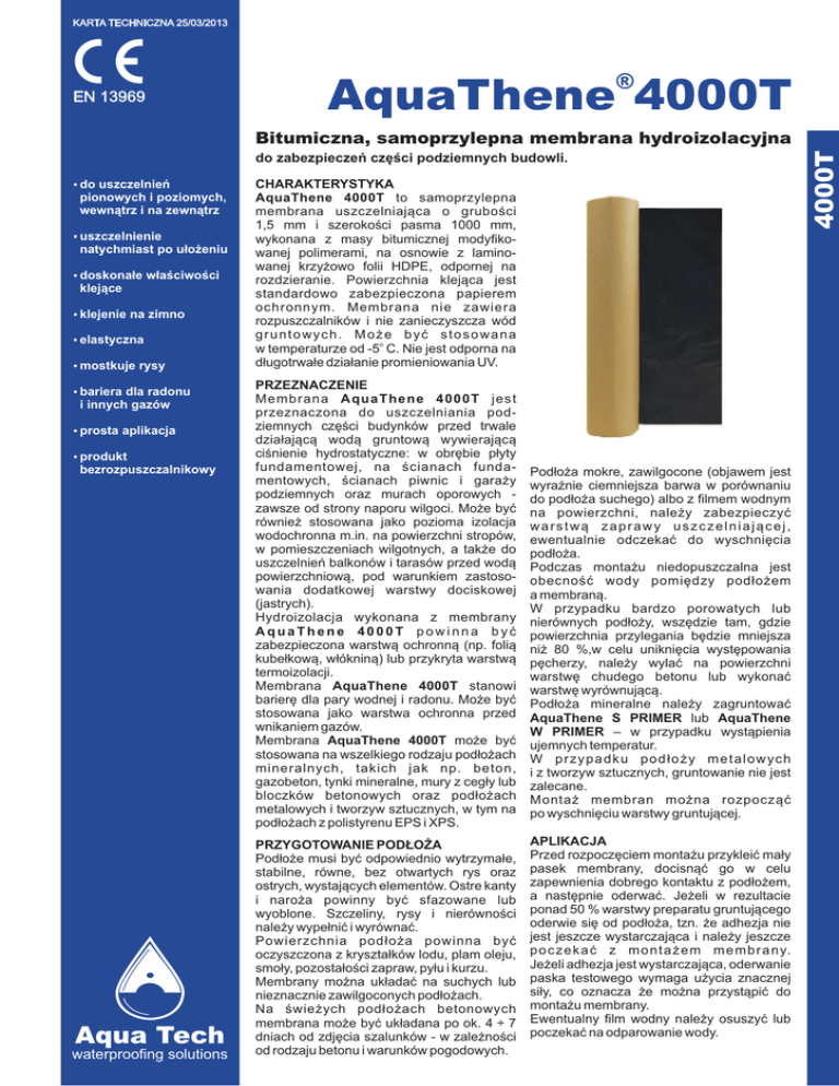 KARTA TECHNICZNA 25/03/2013 EN 13969 ® AquaThene 4000T do zabezpieczeń części podziemnych budowli. do uszczelnień pionowych i poziomych, wewnątrz i na zewnątrz uszczelnienie natychmiast po ułożeniu doskonałe właściwości klejące klejenie na zimno elastyczna mostkuje rysy bariera dla radonu i innych gazów prosta aplikacja produkt bezrozpuszczalnikowy Aqua Tech waterproofing solutions CHARAKTERYSTYKA AquaThene 4000T to samoprzylepna membrana uszczelniająca o grubości 1,5 mm i szerokości pasma 1000 mm, wykonana z masy bitumicznej modyfikowanej polimerami, na osnowie z laminowanej krzyżowo folii HDPE, odpornej na rozdzieranie. Powierzchnia klejąca jest standardowo zabezpieczona papierem ochronnym. Membrana nie zawiera rozpuszczalników i nie zanieczyszcza wód gruntowych. Może być stosowana o w temperaturze od -5 C. Nie jest odporna na długotrwałe działanie promieniowania UV. PRZEZNACZENIE Membrana AquaThene 4000T jest przeznaczona do uszczelniania podziemnych części budynków przed trwale działającą wodą gruntową wywierającą ciśnienie hydrostatyczne: w obrębie płyty fundamentowej, na ścianach fundamentowych, ścianach piwnic i garaży podziemnych oraz murach oporowych zawsze od strony naporu wilgoci. Może być również stosowana jako pozioma izolacja wodochronna m.in. na powierzchni stropów, w pomieszczeniach wilgotnych, a także do uszczelnień balkonów i tarasów przed wodą powierzchniową, pod warunkiem zastosowania dodatkowej warstwy dociskowej (jastrych). Hydroizolacja wykonana z membrany AquaThene 4000T powinna być zabezpieczona warstwą ochronną (np. folią kubełkową, włókniną) lub przykryta warstwą termoizolacji. Membrana AquaThene 4000T stanowi barierę dla pary wodnej i radonu. Może być stosowana jako warstwa ochronna przed wnikaniem gazów. Membrana AquaThene 4000T może być stosowana na wszelkiego rodzaju podłożach mineralnych, takich jak np. beton, gazobeton, tynki mineralne, mury z cegły lub bloczków betonowych oraz podłożach metalowych i tworzyw sztucznych, w tym na podłożach z polistyrenu EPS i XPS. PRZYGOTOWANIE PODŁOŻA Podłoże musi być odpowiednio wytrzymałe, stabilne, równe, bez otwartych rys oraz ostrych, wystających elementów. Ostre kanty i naroża powinny być sfazowane lub wyoblone. Szczeliny, rysy i nierówności należy wypełnić i wyrównać. Powierzchnia podłoża powinna być oczyszczona z kryształków lodu, plam oleju, smoły, pozostałości zapraw, pyłu i kurzu. Membrany można układać na suchych lub nieznacznie zawilgoconych podłożach. Na świeżych podłożach betonowych membrana może być układana po ok. 4 ÷ 7 dniach od zdjęcia szalunków - w zależności od rodzaju betonu i warunków pogodowych. Podłoża mokre, zawilgocone (objawem jest wyraźnie ciemniejsza barwa w porównaniu do podłoża suchego) albo z filmem wodnym na powierzchni, należy zabezpieczyć warstwą zaprawy uszczelniającej, ewentualnie odczekać do wyschnięcia podłoża. Podczas montażu niedopuszczalna jest obecność wody pomiędzy podłożem a membraną. W przypadku bardzo porowatych lub nierównych podłoży, wszędzie tam, gdzie powierzchnia przylegania będzie mniejsza niż 80 %,w celu uniknięcia występowania pęcherzy, należy wylać na powierzchni warstwę chudego betonu lub wykonać warstwę wyrównującą. Podłoża mineralne należy zagruntować AquaThene S PRIMER lub AquaThene W PRIMER – w przypadku wystąpienia ujemnych temperatur. W przypadku podłoży metalowych i z tworzyw sztucznych, gruntowanie nie jest zalecane. Montaż membran można rozpocząć po wyschnięciu warstwy gruntującej. APLIKACJA Przed rozpoczęciem montażu przykleić mały pasek membrany, docisnąć go w celu zapewnienia dobrego kontaktu z podłożem, a następnie oderwać. Jeżeli w rezultacie ponad 50 % warstwy preparatu gruntującego oderwie się od podłoża, tzn. że adhezja nie jest jeszcze wystarczająca i należy jeszcze p o c z e k a ć z m o n t a ż e m m e m b r a n y. Jeżeli adhezja jest wystarczająca, oderwanie paska testowego wymaga użycia znacznej siły, co oznacza że można przystąpić do montażu membrany. Ewentualny film wodny należy osuszyć lub poczekać na odparowanie wody. 4000T Bitumiczna, samoprzylepna membrana hydroizolacyjna ® 4000T AquaThene 4000T Bitumiczna, samoprzylepna membrana hydroizolacyjna do zabezpieczeń części podziemnych budowli. Wykonanie izolacji należy rozpocząć od zabezpieczenia narożników, naroży i krawędzi odpowiednio przyciętymi kawałkami membrany lub przy pomocy taśmy narożnikowej AquaThene CORNER TAPE. Izolację powierzchni pionowych należy rozpoczynać od góry, układając pasma membrany pionowo. Rolkę AquaThene 4000T należy rozwinąć tak, aby papier ochronny znajdował się na spodzie, pociąć na pasma o wymaganej długości i zwinąć ponownie. Ochronną warstwę papieru należy usunąć z membrany bezpośrednio przed jej ułożeniem, zdejmując powoli i równomiernie fragmenty o długości ok. 30 cm. Membranę ułożyć na podłożu stroną przylepną i docisnąć, używając, np. twardego pędzla lub szmatki. Następnie odkleić kolejne 30 cm papieru ochronnego. Dociskanie należy rozpocząć od środka kierując się ku zewnętrznej stronie, tak aby wyeliminować powstawanie fałd i załamań membrany. Następny pas membrany ułożyć stosując zakład 10 cm – zgodnie z linią nadrukowaną na powierzchni folii. W żadnym wypadku zakład nie może być mniejszy niż 8 cm. Miejsca zakładów należy docisnąć szczególnie dokładnie. Aby uniknąć wnikania wody pod izolację na jej górnych krawędziach należy zastosować taśmę klejącą Górne zakończenie izolacji, układanej na powierzchniach pionowych, należy uszczelnić taśmą zamykającą AquaThene ALU TAPE, AquaThene BAND (może być tynkowana) lub szpachlówką bitumiczną AquaThene MASTIC. Do montażu termoizolacji lub warstwy ochronnej można przystąpić natychmiast po uło