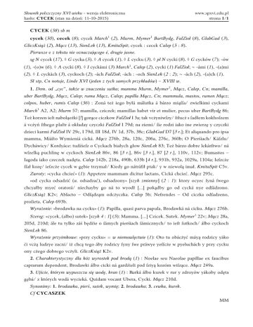 Słownik polszczyzny XVI wieku - wersja elektroniczna hasło: CYCEK (stan na dzień: 11-10-2015) www.spxvi.edu.pl strona 1/1 CYCEK (58) sb m cycek (50), cecek (8); cycek March1 (2), Murm, Mymer1 BartBydg, FalZioł (8), GlabGad (3), GliczKsiąż (2), Mącz (13), SienLek (13), KmitaSpit; cycek : cecek Calep (5 : 8). Pierwsze e z tekstu nie oznaczającego é, drugie jasne. sg N cycek (17). ◊ G cycka (5). ◊ A cycek (1). ◊ L cycku (3). ◊ pl N cycki (8). ◊ G cycków (7); -ów (1), -(o)w (6). ◊ A cycki (8). ◊ I cyckåmi (3) March1, Calep (2), cycki (1) FalZioł; ~ -åmi (1), -(a)mi (2). ◊ L cyckåch (3), cyckoch (2); -åch FalZioł; -åch : -och SienLek (2 : 2); ~ -åch (2), -(a)ch (1). Sł stp, Cn notuje, Linde XVI (jeden z tych samych przykładów) – XVIII w. 1. Dem. od „cyc”, także w znaczeniu sutka; mamma Murm, Mymer1, Mącz, Calep, Cn; mamilla, uber BartBydg, Mącz, Calep; ruma Mącz, Calep; papilla Mącz, Cn; mammula, mastos, rumen Mącz; colpos, huber, rumis Calep (56) : Zoná też iego byłá málutka á bárzo miąſſa/ zwielkimi cyckami March1 A2, A2; Murm 57; mamilla, cziczek; mamillas habet vir et mulier, pecus uber BartBydg 86; Też korzen ieſt naboląeżki [!] gorące ciczkow FalZioł I 3a; tak vcżyniwſzy/ ſtłucż s ſadłem kokhoſzem á vcżyń ſthego plaſtr á okładay czyczki FalZioł I 79d; na ziemi/ ſie rodzi iako ine zwierzę y czyczki dzieci karmi FalZioł IV 29c, I 79d, III 18d, IV 1d, 37b, 38c; GlabGad D7 [3 r.]; Et aliquando pro ipsa mamma, Miáſto Wymieniá cická. Mącz 276b, 28a, 120c, 206a, 276c, 360b; O Pierśiach/ Káſzlu/ Dycháwicy/ Kordyáce: tudźieſz o Cyckach białych głow SienLek 83; Też bárzo dobre lekárſtwo/ ná wſzelką puchlinę w cyckoch SienLek 86v, 86 [3 r.], 86v [3 r.], 87 [2 r.], 110v, 112v; Bumastos ‒ Iagoda iako czeczek nadęta. Calep 142b, 218a, 490b, 633b [4 r.], 931b, 932a, 1029a, 1104a; Ieſzcże ſſał kozę/ ieſzcże cycek w gębie trzymał/ Kiedy go nátráfił ptak/ y w niewolą imał. KmitaSpit C5v. Zwroty: »cycka chcieć« (1): Appetere mammam dicitur lactans, Cická chcieć. Mącz 295c. »od cycka odsadzić (a. odsadzać), odsadzony« [szyk zmienny] (2 : 1): ktory ocyec ſyná ſwego chcyałby myeć oratorá/ niechayby go ná to wyodł [...] pokądby go od cycká nye odſádzono. GliczKsiąż K2v; Ablacto ‒ Odſądząm odcżyczka. Calep 5b; Nefrendes ‒ Od ciczka odſadzeno, proſieta. Calep 693b. Wyrażenie: »brodawka na cycku« (1): Papilla, quasi parva papula, Brodawká ná cicku. Mącz 276b. Szereg: »cycek, (albo) sutek« [szyk 4 : 1] (5): Mamma. [...] Czicek. Sutek. Mymer1 22v; Mącz 28a, 205d, 210d; ále tu tylko záś będźie o ſámych pierśiach ſámicznych/ to ieſt ſutkoch/ álbo cyckoch SienLek 86. Wyrażenie przyimkowe: »przy cycku« = w niemowlęctwie (1): Oto tu obácżyć máyą rodzicy yáko ći vcżą ludzye zacni/ iż chcą tego áby rodzicy ſyny ſwe práwye yeſſcże w pyeluchách y przy cycku ony cżego dobrego vcżyli. GliczKsiąż K2v. 2. Charakterystyczny dla kóz wyrostek pod brodą (1) : Noelae seu Naeolae papillae ex faucibus caprarum dependent, Brodawki álbo cicki ná gardźieli pod ſziyą kozóm wiſzące. Mącz 249a. 3. Ujście, którym wypuszcza się wodę, kran (1) : Rurká álbo kurek v rur y zdroyów yákoby odęta gębá/ z których wodá wycieká. Quidam vocant Ubera, Cycki. Mącz 210d. Synonimy: 1. brodawka, pierś, sutek, wymię; 2. brodawka; 3. cewka, kurek. Cf CYCASZEK MM