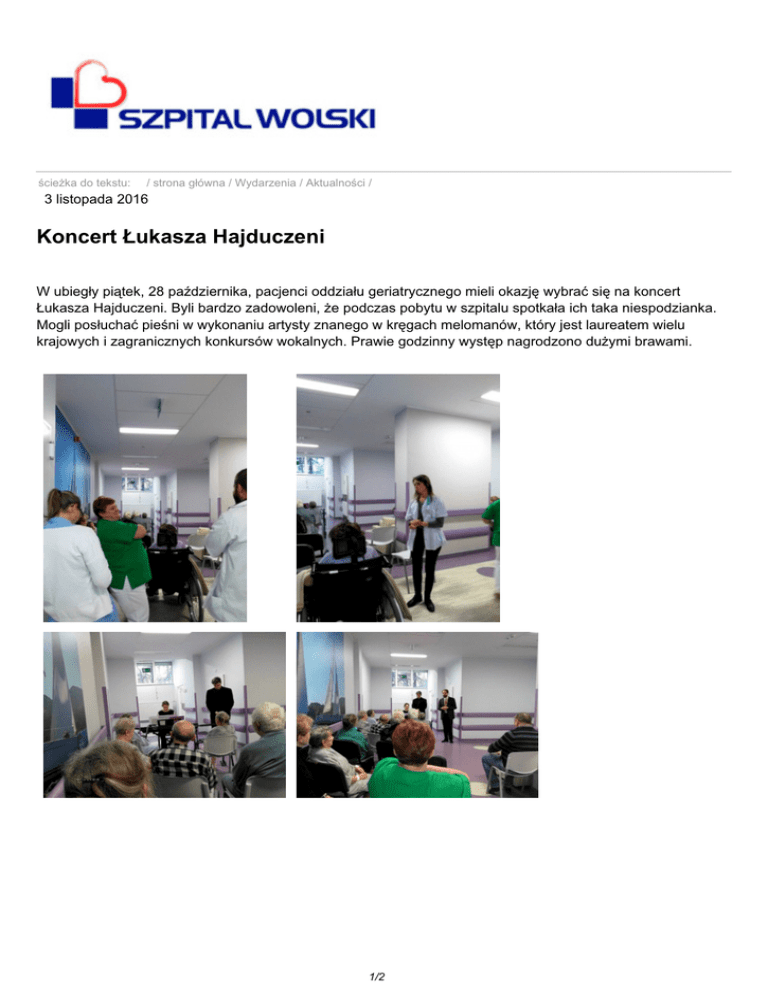 ścieżka do tekstu: / strona główna / Wydarzenia / Aktualności / 3 listopada 2016 Koncert Łukasza Hajduczeni W ubiegły piątek, 28 października, pacjenci oddziału geriatrycznego mieli okazję wybrać się na koncert Łukasza Hajduczeni. Byli bardzo zadowoleni, że podczas pobytu w szpitalu spotkała ich taka niespodzianka. Mogli posłuchać pieśni w wykonaniu artysty znanego w kręgach melomanów, który jest laureatem wielu krajowych i zagranicznych konkursów wokalnych. Prawie godzinny występ nagrodzono dużymi brawami. 1/2 Łukasz Hajduczenia jest absolwentem wydziału wokalnego Uniwersytetu Muzycznego Fryderyka Chopina w Warszawie. Naukę kontynuował w Londynie w prestiżowej Guildhall School of Music and Drama i na wydziale operowym Associated Studios. Ma też magisterium z teologii. Studiował w Chrześcijańskiej Akademii Teologicznej w Warszawie i Prawosławnym Seminarium Duchownym. Jego działalność to nie tylko koncerty i projekty operowe, lecz także praca pedagogiczna i praca z zespołami wokalnymi. Poza muzyką klasyczną, specjalizuje się w muzyce cerkiewnej oraz słowiańskiej muzyce ludowej. Interesuje się ikonografią i teologią prawosławną. Prowadzi badania nad muzyczną sferą liturgii bizantyjskiej, jest doktorantem na Wydziale Artes Liberales Uniwersytetu Warszawskiego. data wydruku: adres dokumentu: 4 marzec 2017; 11:32:52 http://www.wolski.med.pl//index.php?LANG=pl&page_ID=21&art_ID=563 2/2