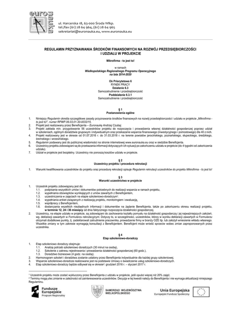 ul. Harcerska 18, 63-000 Środa Wlkp. tel./fax (61) 28 64 964, (61) 28 64 965 [email protected], www.euronauka.eu REGULAMIN PRZYZNAWANIA ŚRODKÓW FINANSOWYCH NA ROZWÓJ PRZEDSIĘBIORCZOŚCI I UDZIAŁU W PROJEKCIE Mikrofirma - to jest to! w ramach Wielkopolskiego Regionalnego Programu Operacyjnego na lata 2014-2020 Oś Priorytetowa 6 RYNEK PRACY Działanie 6.3 Samozatrudnienie i przedsiębiorczość Poddziałanie 6.3.1 Samozatrudnienie i przedsiębiorczość §1 Postanowienia ogólne 1. 2. 3. 4. 5. 6. 7. Niniejszy Regulamin określa szczegółowe zasady przyznawania środków finansowych na rozwój przedsiębiorczości i udziału w projekcie „Mikrofirma to jest to!”, numer RPWP.06.03.01-30-0033/15. Projekt jest realizowany przez Beneficjenta – Euronaukę Andrzej Czubaj. Projekt zakłada min. przygotowanie 56 uczestników projektu do rozpoczęcia i prowadzenia własnej działalności gospodarczej poprzez udział w szkoleniach, ogólnym doradztwie grupowym i indywidualnym oraz przekazanie wsparcia finansowego (inwestycyjnego i pomostowego) dla 40 z nich. Projekt realizowany jest w okresie od 01.07.2016 r. do 31.03.2018 r. na terenie powiatów jarocińskiego, poznańskiego, słupeckiego, średzkiego, śremskiego i wrzesińskiego. Regulamin podawany jest do publicznej wiadomości na stronie internetowej www.euronauka.eu oraz w siedzibie Beneficjenta. Uczestnicy projektu zobowiązani są do przekazania informacji dotyczących ich sytuacji po zakończeniu udziału w projekcie (do 4 tygodni od zakończenia udziału). Udział w projekcie jest bezpłatny. Uczestnicy nie ponoszą kosztów udziału w projekcie. §2 Uczestnicy projektu i procedura rekrutacji 1. Warunki kwalifikowania uczestników do projektu oraz procedurę rekrutacji opisuje Regulamin rekrutacji uczestników do projektu Mikrofirma - to jest to! §3 Warunki uczestnictwa w projekcie 1. 2. Uczestnik projektu zobowiązany jest do: 1.1. podpisania wszystkich umów i dokumentów potrzebnych do realizacji wsparcia w ramach projektu, 1.2. wypełniania obowiązków wynikających z umów zawartych z Beneficjentem, 1.3. uczestniczenia w zajęciach na etapie szkoleniowo-doradczym1. 1.4. wypełniania ankiet związanych z realizacją projektu, monitoringiem i ewaluacją, 1.5. współpracy z Beneficjentem, 1.6. dostarczania wszelkich niezbędnych informacji i dokumentów na żądanie Beneficjenta, także po zakończeniu okresu realizacji projektu, w terminie 12, 24 i 36 miesięcy od dnia faktycznego rozpoczęcia działalności gospodarczej. Uczestnicy, na etapie udziału w projekcie, są zobowiązani do zachowania kształtu pomysłu na działalność gospodarczą i jej najważniejszych założeń, wg. deklaracji zawartych w Formularzu rekrutacyjnym. Dotyczy to, w szczególności, uczestników, którzy w wyniku deklaracji zawartych w Formularzu otrzymali dodatkowe punkty, tj. zadeklarowali zatrudnienie pracownika, prowadzenie firmy w branży OZE itp. lub założyli wniesienie wkładu własnego. Wszelkie zmiany w tym zakresie wymagają konsultacji z Beneficjentem. Beneficjent może wnieść sprzeciw wobec zmian zaproponowanych przez uczestnika. §4 Etap szkoleniowo-doradczy 1. 2. 3. 4. Etap szkoleniowo doradczy obejmuje: 1.1. Analizę potrzeb szkoleniowo doradczych (30 minut na osobę), 1.2. Szkolenie z zakresu rejestrowania i prowadzenia działalności gospodarczej (60 godz.), 1.3. Doradztwo biznesowe (4 godz. na osobę). Harmonogram szkoleń i doradztwa zostanie ustalony przez Beneficjenta indywidualnie dla każdej grupy szkoleniowej. Wsparcie szkoleniowo-doradcze realizowane jest na podstawie Umowy o świadczenie usług szkoleniowo-doradczych. Etap szkoleniowo-doradczy będzie odbywał się w okresie2: grudzień 2016 r. – styczeń 2017 r. Uczestnik projektu może zostać wykluczony przez Beneficjenta z udziału w projekcie, jeśli opuści więcej niż 20% zajęć. Terminy mogą ulec zmianie w zależności od zainteresowania uczestników. Decyzja w tej kwestii należy do Beneficjenta i nie wymaga aktualizacji niniejszego Regulaminu. 1 2 ul. Harcerska 18, 63-000 Środa Wlkp. tel./fax (61) 28 64 964, (61) 28 64 965 [email protected], www.euronauka.eu 5. 6. 7. 8. Etap szkoleniowo-doradczy zakończy się wydaniem przez Beneficjenta uczestnikom projektu zaświadczeń potwierdzających uczestnictwo w szkoleniu. Dopuszcza się możliwość zwolnienia uczestnika z obowiązku uczestniczenia w etapie szkoleniowo-doradczym w sytuacji, kiedy uzyskał on podobne tematycznie wsparcie w ramach innego projektu w ramach Programu Operacyjnego Kapitał Ludzki lub inne. Decyzja o zwolnieniu uczestnika z udziału w etapie szkoleniowo – doradczym należy do Beneficjenta. Uczestnicy projektu są zobowiązani do uczestnictwa w szkoleniach, podpisywania listy obecności na zajęciach szkoleniowych i doradczych oraz innych stosownych dokumentów, a także wykorzystania przysługującego wsparcia doradczego oraz potwierdzania jego odbioru. Uczestnikom przysługują bezpłatne materiały szkoleniowe, refundacja kosztów dojazdu, catering oraz zwrot kosztów opieki nad dzieckiem lub osobą zależną, na zasadach określonych w Regulaminie. §5 Przyznawanie środków finansowych na rozwój przedsiębiorczości 1. 2. 3. 4. 5. 6. 7. 8. 9. 10. 11. 12. 13. 14. 15. 16. 17. 18. 19. 20. 21. W ramach projektu przewidziane jest przyznanie środków finansowych na rozwój przedsiębiorczości dla 40 Uczestników, którzy ukończyli etap szkoleniowo-doradczy i uzyskali zaświadczenie. Uczestnicy projektu mogą ubiegać się o środki finansowe: 2.1. na wsparcie bezzwrotne, którego maksymalna kwota wsparcia nie przekracza kwoty 22 700,76 zł; 2.2. na wsparcie pomostowe w postaci pomocy finansowej, o którym mowa w § 8 pkt. 2.1 i 2.2. O wsparcie finansowe na rozwój przedsiębiorczości Uczestnik może ubiegać się poprzez złożenie biznesplanu przedsięwzięcia, zgodnego ze wzorem otrzymanym od Beneficjenta. Środki z bezzwrotnej dotacji na rozpoczęcie działalności gospo
