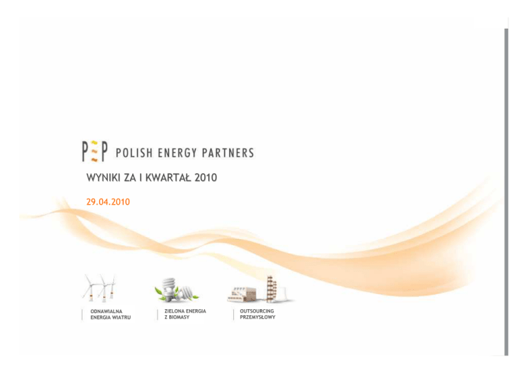 COMPANY PRESENTATION WYNIKI MARCH 2010 ZA I KWARTAŁ 2010 1 29.04.2010 WIND ENERGY ODNAWIALNA ENERGIA WIATRU BIOMASS FUELS ZIELONA ENERGIA Z BIOMASY INDUSTRIAL ENERGY OUTSOURCING OUTSOURCING PRZEMYSŁOWY Plan Prezentacji Przegląd działalności Obecna Działalność Projekty w fazie wdrażania Projekty w fazie developmentu Wyniki finansowe za I kwartał 2010 roku Podsumowanie 2 PRZEGLĄD DZIAŁALNOŚCI 3 Przegląd Działalności - Wyniki Skorygowana EBITDA z pominięciem sprzedaży Farm Wiatrowych za rok 2010 wynosi narastająco 17,8 mln PLN i jest wyższa w stosunku do roku ubiegłego o 3,0 mln PLN Zysk netto za I kwartał 2010 roku z pominięciem wpływu różnic kursowych z wyceny bilansowej i sprzedaży Farm Wiatrowych wyniósł 11,2 mln PLN i jest wyższy od poziomu z I kwartału 2009 o 3,1 mln PLN W porównaniu z I kwartałem 2009, w I kwartale 2010 nie zostały sprzedane udziały w Farmach Wiatrowych, w związku z czym skorygowana EBITDA i zysk netto w I kwartale 2010 są niższe niż w roku 2009 4 Przegląd Działalności – Kluczowe wydarzenia Energetyka Wiatrowa Rozwój portfela projektów wiatrowych postępuje zgodnie z planem Realizacja projektów FW Łukaszów i FW Modlikowice jest w toku Proces sprzedaży projektu FW Wartkowo w końcowej fazie negocjacji na zasadzie wyłączności z wybranym partnerem Niższe wyniki FW Puck z powodu słabej wietrzności Outsourcing Energetyki Przemysłowej Wyniki EC Saturn oraz EL Mercury przekraczają ubiegłoroczny poziom Development elektrowni biomasowej 30 MW dla KGHM w toku Trwają negocjacje z kolejnym dużym podmiotem przemysłowym (blue chip) w celu uruchomienia kolejnej elektrowni biomasowej o mocy 30 MW Produkcja Paliw z Biomasy Zakład produkcji peletu GPBE Północ pracuje zgodnie z planem Budowa zakładu GPBE Południe rozpoczęta i zgodna z harmonogramem czasowym uruchomienie zaplanowano na wrzesień 2010 Development zakładu GPBE Wschód postępuje zgodnie z planem- rozpoczęcie produkcji planowane na wrzesień 2011 5 OBECNA DZIAŁALNOŚĆ 6 Obecna Działalność EC Saturn: Wyższe rozliczenie zielonej energii i podziału oszczędności za rok 2009 Wyższe przychody z zielonej energii ze względu na zwiększenie produkcji energii elektrycznej i wyższy poziom cen EC Zakrzów i EC Jeziorna - wyniki na poziomie z roku 2009, zgodnie z budżetem EC Mercury – wyższa produkcja niż w ubiegłym roku w wyniku wzrostu dostaw gazu z koksowni FW Puck – w porównaniu do ubiegłego roku niższa produkcja oraz poniżej budżetu z powodu słabych warunków wietrznych Zakład GPBE Północ – zgodnie z planem 7 PROJEKTY W FAZIE WDRAŻANIA 8 PROJEKTY W FAZIE WDRAŻANIA – ENERGETYKA WIATROWA 9 Postęp w developmencie projektów wiatrowych FW Modlikowice - [12 turbin; 24 MW] i FW Łukaszów - [17 turbin; 34 MW] Przygotowania do rozpoczęcia budowy postępują zgodnie z planem - rozpoczęcie budowy w lipcu Rozbudowa projektu do 85 MW w trakcie developmentu 10 Podpisanie kontraktów na pozostałe prace związane z budową farmy w II kwartale 2010 roku Trwają negocjacje w sprawie obsługi długu przez konsorcjum bankowe – zostały przekazane wiążące warunki Rozpoczęcie produkcji w III kwartale 2011 PROJEKTY W FAZIE WDRAŻANIA – PALIWA Z BIOMASY 11 Produkcja Paliw z Biomasy - projekty w fazie wdrażania GPBE Południe - zakład produkcji peletu do obsługi kontraktu z EDF Polska: Budowa zakładu postępuje zgodnie z planem Kontraktowanie zakupu słomy jest w toku Rozpoczęcie produkcji jest zaplanowane na wrzesień 2010 roku 12 GPBE Wschód - zakład produkcji peletu dla obsługi kontraktu z GDF Suez Polska: Wybór lokalizacji w toku Rozpoczęcie produkcji jest zaplanowane na koniec 2011 Trwają negocjacje w celu podpisania umów z innymi dużymi podmiotami PROJEKTY W DEVELOPMENCIE 13 Plan rozwoju portfela projektów wiatrowych w 2010 r. B – 20 MW A – 58 MW MPZ, DŚ, PB MPZ, DŚ, PB Farmy Wiatrowe na zaawansowanym etapie developmentu z wysokim prawdopodobieństwem realizacji F – 42 MW Rozszerzenie FW Modlikowice/Łukaszów DŚ C – 26 MW MPZ E – 60 MW 14 MPZ, WPS D - 105 MW MPZ Osiągnięte etapy developmentu: MPZ DŚ – WPS – PB – Miejscowy Plan Zagospodarowania Decyzja Środowiskowa Warunki Przyłączenia do Sieci Pozwolenie na Budowę Development Outsourcingu Energetyki Przemysłowej Elektrownie biomasowe – typu greenfield Elektrownia biomasowa o mocy 30 MW dla KGHM S.A. Dyskusja na temat kluczowych warunków umowy w toku Dalsze inwestycje w elektrownie biomasowe Trwają negocjacje z kolejnym dużym podmiotem przemysłowym (blue chip) w celu uruchomienia kolejnej elektrowni biomasowej o mocy 30 MW 15 WYNIKI FINANSOWE ZA I KWARTAŁ 2010/2009 16 Wyniki za I kwartał 2010/2009 - Przychody Kwartał I Skonsolidowane Przychody [mln PLN] 36,5 Kwartał I Skonsolidowane Przychody bez wpływu ze sprzedaży Farm Wiatrowych [mln PLN] 33,4 33,4 26,7 2009A 2010A 2009A 2010A 17 Wyższe przychody ze sprzedaży: Wyższe przychody SM zarówno dla zielonej energii wyprodukowanej w bieżącym okresie oraz w wyniku rozliczenia rocznego Wyższe przychody SM z MGLC (oszczędności) i z czerwonej energii Wyższe ESP związane z projektem Tytan i Projektami Modernizacyjnymi Przychody z projektu GPBE oraz projektu Mercury Niższe przychody z tytułu: Niższej produkcji Farmy Wiatrowej Puck Braku wpływów ze sprzedaży projektów Farm Wiatrowych w I kwartale 2010 – w I kwartale 2009 sprzedano 70% udziałów w FW Jarogniew/Mołtowo (wpływ 9,8 mln PLN) Wyniki za I kwartał 2010/2009 – Skorygowana EBITDA * Kwartał I Skonsolidowana Skorygowana EBITDA bez wpływu ze sprzedaży Farm Wiatrowych [mln PLN] Kwartał I Skonsolidowana Skorygowana EBITDA [mln PLN] 37,5 17,8 14,8 17,8 2009A 2009A 2010A 2010A 18 Wpływ przychodów Niższe koszty operacyjne w EC Zakrzów Większa wydajność EC Jeziorna Odsetki od dodatkowego kapitału dotyczące projektów Tytan i Projektów Modernizacyjnych zapłacone przez Mondi Brak wpływów ze sprzedaży ud