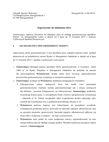 Ośrodek Sportu i Rekreacji Ul.Olimpijczyków Starogardzkich 1 83-200 Starogardzkich 1 Starogard Gd. 11.06.2015r. Zaproszenie do składania ofert Zamawiający zaprasza oferentów do składania ofert na obsługę gastronomiczną ogródków letnich na starogardzkim rynku w dniach od 6 lipca do 13 września 2015 r. podczas Cyklicznych Spotkań Plenerowych. I. SZCZEGÓŁOWY OPIS PRZEDMIOTU OFERTY: Zapewnienie oferty gastronomicznej, w tym sprzedaży piwa, napojów podczas cyklu spotkań plenerowych na południowej stronie Rynku w Starogardzie Gdańskim w dniach od 6 lipca do 13 września 2015 r. zgodnie z poniższymi wytycznymi. 1. Zamawiający udostępni miejsce sprzedaży oferty gastronomicznej w wymiarze: około 1000 m2 na Rynku Miejskim w Starogardzie Gdańskim do podziału na parcele dla poszczególnych Wykonawców. Każda oferta musi zawierać zapotrzebowanie powierzchni gastronomicznej wyrażonej w metrach kwadratowych. 2. Zamawiający oczekuje od Wykonawcy spełnienia następujących warunków: Zabezpieczenia miejsc siedzących: ławy lub stoliki wraz parasolami gastronomicznymi. Estetyka stoiska gastronomicznego jak i miejsc siedzących dla klientów powinna komponować się kolorystycznie. Zamawiający podkreśla, że preferuje kolory jasne, w szczególności biały i beżowy (proponowana wizualizacja – załącznik nr 4). Należy uwzględnić także wygrodzenia stoiska załączając opis, rysunek lub wizualizację wraz z podaniem potrzebnego obszaru w m2. Wykonawca podczas imprezy jest zobowiązany do posiadania wszelkich, wymaganych przepisami prawa, pozwoleń na sprzedaż napojów alkoholowych oraz na sprzedaż artykułów spożywczych. Sprzedaż napojów alkoholowych odbywać się może tylko i wyłącznie w miejscu do tego wyznaczonym. Wykonawca musi podać do czasu podpisania umowy zapotrzebowanie na moc energii elektrycznej do obsługi swojego punktu. Warunki techniczne przyłączy należy omówić z Zamawiającym. Obowiązkiem Wykonawcy jest świadczenie usług na wyłączonej z ruchu samochodowego południowej części Rynku od 6 lipca do 13 września 2015 r., bez możliwości demontażu i zaprzestania działalności gastronomicznej w czasie trwania cyklu imprez letnich, pod rygorem uiszczenia kary w wysokości 10 000,00 zł na rzecz Zamawiającego, za nie dotrzymanie warunków umowy. Wykonawca musi przedstawić do umowy aktualną polisę ubezpieczenia OC. Wykonawca może zaproponować uzupełnienie oferty o elementy, które nie są przedmiotem działalności gastronomicznej. Dotyczy to m.in. takich elementów jak ustawienie piaskownicy czy dowiezienie piasku, ustawienie dodatkowych atrakcji dla dzieci czy też udostępnianie korzystającym sprzętu sportowego (badminton, kometka itp.) 3. Informacje uzupełniające Zamawiający udostępni Wykonawcy teren na Rynku Miejskim o powierzchni wynikającej z oferty w dniu 6 lipca 2015 roku o godzinie 8:00. Demontaż sprzętu Wykonawcy powinien nastąpić w dniu 13 września 2015 roku po godzinie 17:00, nie później niż do godziny 21:00. Wykonawca akceptuje fakt, iż podczas spotkań plenerowych (nie będących imprezą masową) prowadzona będzie sprzedaż regionalnych wyrobów spożywczych oferowanych przez m.in. Koła Gospodyń Wiejskich, oraz artykuły typu popcorn i wata cukrowa przez drobnych detalistów (np. food truck). Przewiduje się, iż w czasie świadczenia usług będą odbywały się imprezy takie jak koncerty na scenie przy Ratuszu, kino letnie, sety DJ, jam session itp. WARUNKI FINANSOWE/ROZLICZENIA/PŁATNOŚCI 1. Wykonawca, zgodnie z ww warunkami, ma zadeklarować wysokość kwoty za metr kwadratowy powierzchni za cały okres użytkowania. Wartość czynszu należnego Zamawiającemu to iloczyn ilości metrów kwadratowych i ceny podanej przez Wybranego Wykonawcę za metr kwadratowy. 2. Wykonawca zapłaci Zamawiającemu wartość za wynajem powierzchni gastronomicznej w dwóch równych ratach na podstawie faktury VAT: o I rata – do 10 lipca 2015 r. o II rata – do 10 sierpnia 2015 r. 3. Wykonawca ponosi wszelkie koszty związane z obsługą swojego stoiska między innymi: opłata za podłączenie i pobór prądu na podstawie podlicznika, za wywóz śmieci, przenośne toalety itp. Wszelkie koszty użytkowania powierzchni gastronomicznej Wynajmujący zapłaci Zamawiającemu na podstawie faktury VAT w ciągu 14 dni od jej otrzymania. Wykonawca sam uiści należny podatek od nieruchomości za wynajęty teren. ISTOTNE POSTANOWIENIA UMOWY Termin realizacji oferty od 6 lipca 2015 r. do 13 września 2015 r. KRYTERIA OCENY OFERT O wyborze oferty decydować będzie kryterium: o najwyższej ceny (przy spełnieniu wszystkich warunków przedstawionych w niniejszym zaproszeniu do składania ofert) – 80% o dodatkowych elementów , które nie są przedmiotem działalności gastronomicznej – 20% - Zamawiający będzie punktował szczególnie te atrakcje, które promować będą aktywny wypoczynek i zabawę dla dla mieszkańców Starogardu Gdańskiego. SPOSÓB PRZYGOTOWANIA OFERTY Oferta musi zawierać: 1. Pełną nazwę Wykonawcy. 2. Adres siedziby Wykonawcy. 3. Wyciąg z CEIDG 4. Uzupełnione załączniki do oferty. DATA I MIEJSCE SKŁADANIA OFERT Zamawiający nie dopuszcza składania ofert częściowych. Ofertę należy złożyć w formie formularza zapytania ofertowego, który stanowi załącznik nr 1 do zaproszenia. Kontakt w sprawach technicznych: Mariusz Pater telefon: 58 56 240 04 fax: 58 56 221 20 mail: [email protected] Zamawiający oczekuje na oferty do dnia 19 czerwca 2015 roku do godziny 12:00. Oferty należy złożyć w siedzibie Zamawiającego przy ul.Olimpijczyków Starogardzkich 1; 83-200 Starogard Gdański w sekretariacie, w zamkniętej kopercie opatrzonej opisem „Oferty na gastronomię podczas spotkań plenerowych” lub w formie elektronicznej na adres: [email protected] Informacja o wyborze ofert znajdzie się na stronie www.osir.com.pl Umowa z wybranymi wykonawcami zostanie podpisana niezwłocznie p