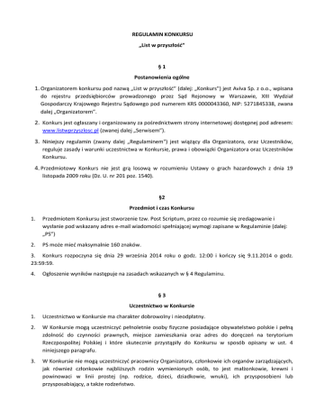 REGULAMIN KONKURSU „List w przyszłość” §1 Postanowienia ogólne 1. Organizatorem konkursu pod nazwą „List w przyszłość” (dalej: „Konkurs”) jest Aviva Sp. z o.o., wpisana do rejestru przedsiębiorców prowadzonego przez Sąd Rejonowy w Warszawie, XIII Wydział Gospodarczy Krajowego Rejestru Sądowego pod numerem KRS 0000043360, NIP: 5271845338, zwana dalej „Organizatorem”. 2. Konkurs jest ogłaszany i organizowany za pośrednictwem strony internetowej dostępnej pod adresem: www.listwprzyszlosc.pl (zwanej dalej „Serwisem”). 3. Niniejszy regulamin (zwany dalej „Regulaminem") jest wiążący dla Organizatora, oraz Uczestników, reguluje zasady i warunki uczestnictwa w Konkursie, prawa i obowiązki Organizatora oraz Uczestników Konkursu. 4. Przedmiotowy Konkurs nie jest grą losową w rozumieniu Ustawy o grach hazardowych z dnia 19 listopada 2009 roku (Dz. U. nr 201 poz. 1540). §2 Przedmiot i czas Konkursu 1. Przedmiotem Konkursu jest stworzenie tzw. Post Scriptum, przez co rozumie się zredagowanie i wysłanie pod wskazany adres e-mail wiadomości spełniającej wymogi zapisane w Regulaminie (dalej: „PS”) 2. PS może mieć maksymalnie 160 znaków. 3. Konkurs rozpoczyna się dnia 29 września 2014 roku o godz. 12:00 i kończy się 9.11.2014 o godz. 23:59:59. 4. Ogłoszenie wyników następuje na zasadach wskazanych w § 4 Regulaminu. §3 Uczestnictwo w Konkursie 1. Uczestnictwo w Konkursie ma charakter dobrowolny i nieodpłatny. 2. W Konkursie mogą uczestniczyć pełnoletnie osoby fizyczne posiadające obywatelstwo polskie i pełną zdolność do czynności prawnych, miejsce zamieszkania oraz adres do doręczeń na terytorium Rzeczpospolitej Polskiej i które skutecznie przystąpiły do Konkursu w sposób opisany w ust. 4 niniejszego paragrafu. 3. W Konkursie nie mogą uczestniczyć pracownicy Organizatora, członkowie ich organów zarządzających, jak również członkowie najbliższych rodzin wymienionych osób, to jest małżonkowie, krewni i powinowaci w linii prostej (np. rodzice, dzieci, dziadkowie, wnuki), ich przysposobieni lub przysposabiający, a także rodzeństwo. 4. Osoba, o której mowa w ust. 2 niniejszego paragrafu przystępuje do Konkursu, stając się jego uczestnikiem (dalej „Uczestnik”), wysyłając wiadomość elektroniczną (zwaną dalej „Listem”) za pośrednictwem formularza zamieszczonego w Serwisie, poprzez: a) wskazanie adresu e-mail, na który ma zostać wysłany List wraz z PS, b) wskazanie daty dostarczenia Listu, z zastrzeżeniem, iż termin wybrany przez Uczestnika nie może przypadać później niż trzy lata od dnia przystąpienia do Konkursu c) wpisanie swojego adresu e-mail, d) uzupełnienie pola PS e) opcjonalne udostępnienie stworzonego PS na portalu Facebook, f) zaakceptowanie regulaminu konkursu, g) zaakceptowanie regulaminu serwisu, h) stworzenie Listu w edytorze dostępnym w Serwisie, i) opcjonalne dołączenie zdjęć j) wysłanie Listu wraz z PS poprzez kliknięcie przycisku „Wyślij List” 5. Prawidłowe wykonanie czynności określonych w ust. 4 niniejszego paragrafu skutkuje wysłaniem PS do Konkursu. Komisja Konkursowa dokonuje wstępnej moderacji PS w ciągu 24 godzin, od dnia jego wysłania i – w przypadku gdy PS w jej wstępnej ocenie spełnia wszystkie wymagania określone Regulaminem, przyjmuje go do udziału w Konkursie. 6. PS może zostać usunięty z Serwisu i wykluczony z Konkursu w każdym czasie w razie stwierdzenia przez Komisję Konkursową, że nie spełnia ona wymogów przewidzianych w Regulaminie lub w przypadku wystąpienia roszczeń związanych PS. 7. Każdy Uczestnik Konkursu może wysłać jeden List zawierający PS, jednakże udostępniając PS na portalu Facebook Uczestnik uzyskuje możliwość wysłania kolejnego Listu.. 8. W przypadku nadesłania przez różnych Uczestników PS zawierającego w ocenie Komisji Konkursowej taką samą lub wysoce podobną treść, w Konkursie bierze udział PS Uczestnika, który dokonał pierwszego chronologicznie zgłoszenia takiej PS. Ocena odnośnie istnienia identyczności lub podobieństwa PS należy do wyłącznej kompetencji Komisji Konkursowej. 9. W celu wyjaśnienia wątpliwości związanych z udziałem Uczestnika w Konkursie, Organizator może kontaktować się z nim przy wykorzystaniu podanego przez niego podczas tworzenia PS adresu e-mail. §4 Przebieg Konkursu 1. Spośród przesłanych PS zostanie wyłoniony – w sposób określony w ust. 3 poniżej - jeden najlepszy, tj. najbardziej oryginalnych i kreatywny, w ocenie Komisji Konkursowej PS, którego autor zostanie zwycięzcą nagrody głównej (zwanym dalej: „Zwycięzcą Nagrody Głównej”). 2. Spośród przesłanych PS zostanie wyłonionych również – w sposób określony w ust. 3 poniżej – dziesięć najciekawszych, w ocenie Komisji Konkursowej, PS nadesłanych w danym tygodniu, których autorzy zostaną zwycięzcami nagród cotygodniowych (zwanymi dalej: „Zwycięzcami”). Dziesięć nagród cotygodniowych wyłanianych będzie przez cały okres trwania Konkursu. 3. Decyzje w przedmiocie wyboru PS, o których mowa w ust. 1 oraz 2 powyżej, podejmowane są przez Komisję Konkursową, co oznacza, że Komisja Konkursowa spośród nadesłanych PS, spełniających wymogi konkursowe, wybiera najlepsze w jej ocenie PS według kryterium wskazanego w ust. 1 oraz 2 niniejszego paragrafu. 4. Decyzje w przedmiocie wyboru Zwycięzców Komisja Konkursowa podejmować będzie w każdy wtorek o godz. 12:00 , zaś Zwycięzca Nagrody Głównej zostanie wybrany najpóźniej 5 dni roboczych po zakończeniu Konkursu. O wygranej Zwycięzcy oraz Zwycięzca Nagrody Głównej zostaną poinformowani poprzez wiadomość przesłaną na adres e-mail podany podczas redagowania Listu. 5. Zwycięzca Nagrody Głównej zobowiązany jest, w ciągu 14 dni roboczych od dnia wysłania przez Organizatora wiadomości e-mail, o której mowa w ust. 4 niniejszego paragrafu, przesłać zwrotną wiadomość