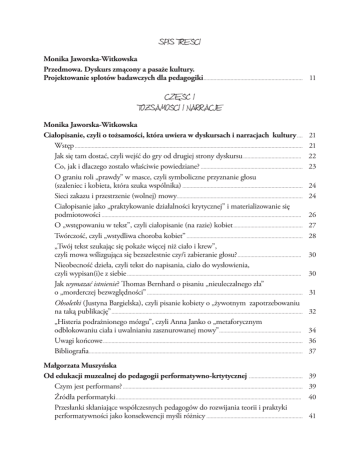 SPIS TREŚCI Monika Jaworska-Witkowska Przedmowa. Dyskurs zmącony a pasaże kultury. Projektowanie splotów badawczych dla pedagogiki....................................................................... 11 CZĘŚĆ I TOŻSAMOŚCI I NARRACJE Monika Jaworska-Witkowska Ciałopisanie, czyli o tożsamości, która uwiera w dyskursach i narracjach kultury..... Wstęp.................................................................................................................................................................. Jak się tam dostać, czyli wejść do gry od drugiej strony dyskursu.......................................... Co, jak i dlaczego zostało właściwie powiedziane?......................................................................... O graniu roli „prawdy” w masce, czyli symboliczne przyznanie głosu (szaleniec i kobieta, która szuka wspólnika)...................................................................................... Sieci zakazu i przestrzenie (wolnej) mowy.......................................................................................... Ciałopisanie jako „praktykowanie działalności krytycznej” i materializowanie się podmiotowości.............................................................................................................................................. O „wstępowaniu w tekst”, czyli ciałopisanie (na razie) kobiet.................................................. Twórczość, czyli „wstydliwa choroba kobiet”................................................................................... „Twój tekst szukając się pokaże więcej niż ciało i krew”, czyli mowa wślizgująca się bezszelestnie czy/i zabieranie głosu?.............................................. Nieobecność dzieła, czyli tekst do napisania, ciało do wysłowienia, czyli wypisan(i)e z siebie............................................................................................................................ Jak wymazać istnienie? Thomas Bernhard o pisaniu „nieuleczalnego zła” o „morderczej bezwzględności”............................................................................................................... Obsoletki (Justyna Bargielska), czyli pisanie kobiety o „żywotnym zapotrzebowaniu na taką publikację”........................................................................................................................................ „Histeria podrażnionego mózgu”, czyli Anna Janko o „metaforycznym odblokowaniu ciała i uwalnianiu zasznurowanej mowy”........................................................... Uwagi końcowe.............................................................................................................................................. Bibliografia........................................................................................................................................................ Małgorzata Muszyńska Od edukacji muzealnej do pedagogii performatywno-krtytycznej ....................................... Czym jest performans?................................................................................................................................ Źródła performatyki.................................................................................................................................... Przesłanki skłaniające współczesnych pedagogów do rozwijania teorii i praktyki performatywności jako konsekwencji myśli różnicy..................................................................... 21 21 22 23 24 24 26 27 28 30 30 31 32 34 36 37 39 39 40 41 6 Spis treści Czym jest nauczanie - uczenie się według teorii performatywnej?....................................... Performatywny styl muzealnego i pozamuzealnego działania edukacyjnego według C. Garoiana..................................................................................................................................... Uwagi końcowe.............................................................................................................................................. Bibliografia........................................................................................................................................................ Julita Orzelska W trosce o tożsamość. Między postawami ''człowieka-Ja'' oraz ''człowieka-nikt'' u Edwarda Stachury........................................................................................................................................... Wstęp.................................................................................................................................................................. W cieniu egoizmu świata ludzi - Ja....................................................................................................... Meta-pomoc w (od)zyskaniu troski za własne życie...................................................................... Świadomość własnej „nocy psychologicznej” jako warunku (od)zyskania jasności w ocenie rzeczywistości............................................................................................................................... Wdzięczność sobie w oporze przed skazaniem na wdzięczność wobec innych................. Przebudzenie w obliczu niepełnosprawności duchowej............................................................... Wstyd – (od)zyskiwanie cnoty utraconej........................................................................................... Uwagi końcowe.............................................................................................................................................. Bibliografia........................................................................................................................................................ 43 44 45 45 47 47 48 48 50 51 52 55 56 57 CZĘŚĆ II ARCHE
