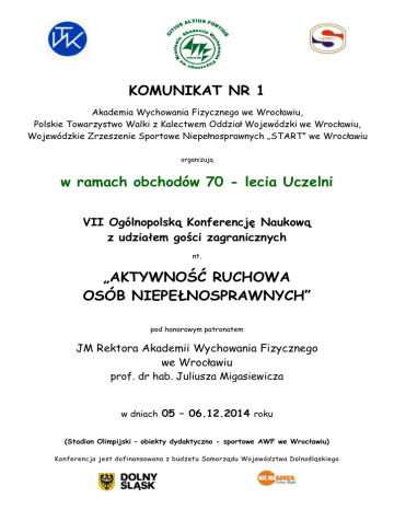 KOMUNIKAT NR 1 Akademia Wychowania Fizycznego we Wrocławiu, Polskie Towarzystwo Walki z Kalectwem Oddział Wojewódzki we Wrocławiu, Wojewódzkie Zrzeszenie Sportowe Niepełnosprawnych „START” we Wrocławiu organizują w ramach obchodów 70 - lecia Uczelni VII Ogólnopolską Konferencję Naukową z udziałem gości zagranicznych nt. „AKTYWNOŚĆ RUCHOWA OSÓB NIEPEŁNOSPRAWNYCH” pod honorowym patronatem JM Rektora Akademii Wychowania Fizycznego we Wrocławiu prof. dr hab. Juliusza Migasiewicza w dniach 05 – 06.12.2014 roku (Stadion Olimpijski – obiekty dydaktyczno - sportowe AWF we Wrocławiu) Konferencja jest dofinansowana z budżetu Samorządu Województwa Dolnośląskiego KOMITET NAUKOWY Przewodniczący: prof. dr hab. Eugeniusz Bolach - Akademia Wychowania Fizycznego we Wrocławiu • Członkowie: prof. dr hab. Pavol Bartik – Uniwersytet Mateja Bela w Bańskiej Bystrzycy prof. dr hab. Tadeusz Kasperczyk - Akademia Wychowania Fizycznego w Krakowie prof. dr hab. Andrzej Kosmol - Akademia Wychowania Fizycznego w Warszawie prof. dr hab. Tadeusz Koszczyc - Akademia Wychowania Fizycznego we Wrocławiu prof. dr hab. Stanisław Kowalik - Akademia Wychowania Fizycznego w Poznaniu prof. dr hab. Jela Labudova – Uniwersytet Komeńskiego w Bratysławie prof. dr hab. Michajło Lynec - Państwowy Uniwersytet Kultury Fizycznej we Lwowie prof. dr hab. Eugeniusz Prystupa - Państwowy Uniwersytet Kultury Fizycznej we Lwowie prof. dr hab. Tadeusz Skolimowski - Akademia Wychowania Fizycznego we Wrocławiu prof. dr hab. Małgorzata Słowińska-Lisowska - Akademia Wychowania Fizycznego we Wrocławiu prof. dr hab. Jan Ślężyński - Akademia Wychowania Fizycznego w Katowicach prof. dr hab. Marek Woźniewski - Akademia Wychowania Fizycznego we Wrocławiu prof. dr hab. Andrej Vovkanych - Państwowy Uniwersytet Kultury Fizycznej we Lwowie dr hab. Kazimierz Chojnacki prof. AWF – Wyższa Szkoła Zawodowa w Nowym Targu dr hab. Andrzej Czamara prof. WSF - Wyższa Szkoła Fizjoterapii we Wrocławiu dr hab. Alla Danilenko prof. BU – Brackij Uniwersytet w Brześciu dr hab. Ewa Demczuk-Włodarczyk prof. AWF - Akademia Wychowania Fizycznego we Wrocławiu dr hab. Krystyna Gawlik prof. AWF - Akademia Wychowania Fizycznego w Katowicach dr hab. Anatoly Gerasievich prof. BU – Brackij Uniwersytet w Brześciu dr hab. Henryk Knapik prof. AWF - Akademia Wychowania Fizycznego w Katowicach dr hab. Jitka Koprivova prof. UM - Uniwersytet Masaryka w Brnie dr hab. Milada Krejčí prof. WSWFiS – Wyższa Szkoła Wychowania Fizycznego i Sportu „PALESTRA” w Pradze dr hab. Bartosz Molik prof. AWF - Akademia Wychowania Fizycznego w Warszawie dr hab. Małgorzata Mraz prof. AWF - Akademia Wychowania Fizycznego we Wrocławiu dr hab. Bożena Ostrowska prof. AWF - Akademia Wychowania Fizycznego we Wrocławiu dr hab. Andrzej Rokita prof. AWF - Akademia Wychowania Fizycznego we Wrocławiu dr hab. Tadeusz Stefaniak prof. AWF - Akademia Wychowania Fizycznego we Wrocławiu dr hab. n. med. Jan Szczegielniak prof. PO – Politechnika Opolska dr hab. Tomasz Tasiemski prof. AWF - Akademia Wychowania Fizycznego w Poznaniu dr hab. Anna Zwierzchowska prof. AWF - Akademia Wychowania Fizycznego w Katowicach dr hab. Rainer Schliermann – Uniwersytet Kultury Fizycznej w Köln dr hab. Kazimierz Witkowski - Akademia Wychowania Fizycznego we Wrocławiu • • • • • • • • • • • • • • • • • • • • • • • • • • • • • • • • KOMITET ORGANIZACYJNY Przewodniczący: • • dr Maciej Kochański dr Józef Patkiewicz Członkowie: • • • • • • dr Bartosz Bolach dr Zdzisław Paliga dr Ryszard Pawelec dr Tetyana Prystupa dr Wojciech Seidel dr Rafał Szafraniec • • • • • • dr Edyta Szczuka mgr Jerzy Bocheński mgr Jerzy Mysłakowski mgr Dorota Szarafińska-Juszczak Alina Rozmus Bogumiła Piwowar PROGRAM OGÓLNY • Sesje naukowe odbędą się w poniższych grupach tematycznych: 1. Sport wyczynowy (kwalifikowany) osób niepełnosprawnych, 2. Rekreacja i turystyka osób niepełnosprawnych, 3. Aktywność ruchowa adaptacyjna (APA), 4. Aktywność ruchowa w różnych jednostkach chorobowych, 5. Zagadnienia integracji w wychowaniu fizycznym i sporcie, 6. Sesja posterowa. • Warsztaty metodyczne będą polegały na omówieniu i demonstracji wybranych aspektów treningu sportowego osób niepełnosprawnych w następujących dyscyplinach: pływanie, piłka siatkowa na siedząco, goalball. • Wystawy (wydawnictwa rehabilitacyjne i sportowe, trofea sportowe, prace plastyczne wykonane przez osoby niepełnosprawne). • Występy artystyczne osób z niepełnosprawnością. • Prezentacja sprzętu medycznego. • Wycieczka z przewodnikiem po Wrocławiu (6 grudnia). Wymogi przygotowania prac: Zgłoszenia tematu i streszczenia prac (abstrakt w języku polskimi i angielskim) na załączonym formularzu należy przesłać drogą elektroniczną w nieprzekraczalnym terminie do 15.09.2014 roku na adres: [email protected] Dotrzymanie wyznaczonego terminu umożliwi organizatorom przygotowanie programu konferencji oraz wydanie zbioru streszczeń. Prezentacje można wygłaszać w języku polskim lub angielskim. Czas wystąpienia – 10 minut. Plakaty do sesji posterowej należy przygotować w formacie A0 (84cm/112cm). Możliwość opublikowania prac w następujących czasopismach: Human Movement (7 pkt. KBN), Rozprawy Naukowe (5 pkt. KBN), Fizjoterapia (4 pkt. KBN), Antropomotoryka (4 pkt. KBN). Konferencja jest dofinansowana przez Urząd Marszałkowski Województwa Dolnośląskiego (organizatorzy nie pobierają wpisowego za uczestnictwo w Konferencji, dojazd i noclegi we własnym zakresie). KARTA ZGŁOSZENIA (proszę wypełnić drukowanymi literami) VII Ogólnopolska Konferencja Naukowa z udziałem gości zagranicznych nt. „AKTYWNOŚĆ RUCHOWA OSÓB NIEPEŁNOSPRAWNYCH” Wrocław 05 – 06.12.2014 Imię i nazwisko referenta/uczestnika____________________________________________ Stopień