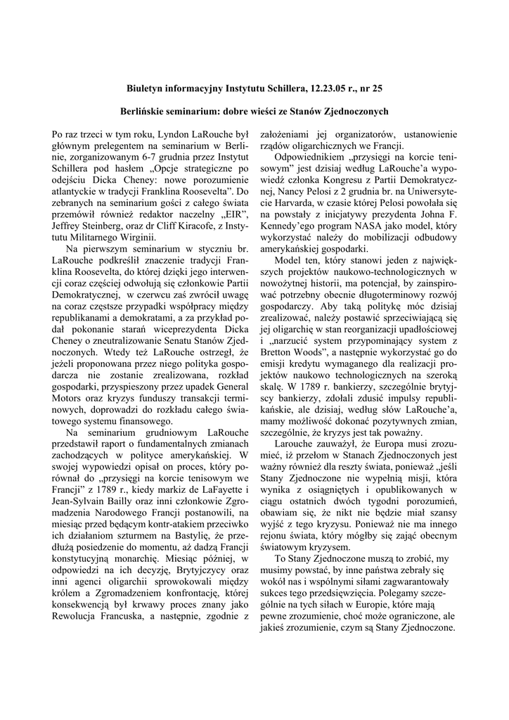 Biuletyn informacyjny Instytutu Schillera, 12.23.05 r., nr 25 Berlińskie seminarium: dobre wieści ze Stanów Zjednoczonych Po raz trzeci w tym roku, Lyndon LaRouche był głównym prelegentem na seminarium w Berlinie, zorganizowanym 6-7 grudnia przez Instytut Schillera pod hasłem „Opcje strategiczne po odejściu Dicka Cheney: nowe porozumienie atlantyckie w tradycji Franklina Roosevelta”. Do zebranych na seminarium gości z całego świata przemówił również redaktor naczelny „EIR”, Jeffrey Steinberg, oraz dr Cliff Kiracofe, z Instytutu Militarnego Wirginii. Na pierwszym seminarium w styczniu br. LaRouche podkreślił znaczenie tradycji Franklina Roosevelta, do której dzięki jego interwencji coraz częściej odwołują się członkowie Partii Demokratycznej, w czerwcu zaś zwrócił uwagę na coraz częstsze przypadki współpracy między republikanami a demokratami, a za przykład podał pokonanie starań wiceprezydenta Dicka Cheney o zneutralizowanie Senatu Stanów Zjednoczonych. Wtedy też LaRouche ostrzegł, że jeżeli proponowana przez niego polityka gospodarcza nie zostanie zrealizowana, rozkład gospodarki, przyspieszony przez upadek General Motors oraz kryzys funduszy transakcji terminowych, doprowadzi do rozkładu całego światowego systemu finansowego. Na seminarium grudniowym LaRouche przedstawił raport o fundamentalnych zmianach zachodzących w polityce amerykańskiej. W swojej wypowiedzi opisał on proces, który porównał do „przysięgi na korcie tenisowym we Francji” z 1789 r., kiedy markiz de LaFayette i Jean-Sylvain Bailly oraz inni członkowie Zgromadzenia Narodowego Francji postanowili, na miesiąc przed będącym kontr-atakiem przeciwko ich działaniom szturmem na Bastylię, że przedłużą posiedzenie do momentu, aż dadzą Francji konstytucyjną monarchię. Miesiąc później, w odpowiedzi na ich decyzję, Brytyjczycy oraz inni agenci oligarchii sprowokowali między królem a Zgromadzeniem konfrontację, której konsekwencją był krwawy proces znany jako Rewolucja Francuska, a następnie, zgodnie z założeniami jej organizatorów, ustanowienie rządów oligarchicznych we Francji. Odpowiednikiem „przysięgi na korcie tenisowym” jest dzisiaj według LaRouche’a wypowiedź członka Kongresu z Partii Demokratycznej, Nancy Pelosi z 2 grudnia br. na Uniwersytecie Harvarda, w czasie której Pelosi powołała się na powstały z inicjatywy prezydenta Johna F. Kennedy’ego program NASA jako model, który wykorzystać należy do mobilizacji odbudowy amerykańskiej gospodarki. Model ten, który stanowi jeden z największych projektów naukowo-technologicznych w nowożytnej historii, ma potencjał, by zainspirować potrzebny obecnie długoterminowy rozwój gospodarczy. Aby taką politykę móc dzisiaj zrealizować, należy postawić sprzeciwiającą się jej oligarchię w stan reorganizacji upadłościowej i „narzucić system przypominający system z Bretton Woods”, a następnie wykorzystać go do emisji kredytu wymaganego dla realizacji projektów naukowo technologicznych na szeroką skalę. W 1789 r. bankierzy, szczególnie brytyjscy bankierzy, zdołali zdusić impulsy republikańskie, ale dzisiaj, według słów LaRouche’a, mamy możliwość dokonać pozytywnych zmian, szczególnie, że kryzys jest tak poważny. Larouche zauważył, że Europa musi zrozumieć, iż przełom w Stanach Zjednoczonych jest ważny również dla reszty świata, ponieważ „jeśli Stany Zjednoczone nie wypełnią misji, która wynika z osiągniętych i opublikowanych w ciągu ostatnich dwóch tygodni porozumień, obawiam się, że nikt nie będzie miał szansy wyjść z tego kryzysu. Ponieważ nie ma innego rejonu świata, który mógłby się zająć obecnym światowym kryzysem. To Stany Zjednoczone muszą to zrobić, my musimy powstać, by inne państwa zebrały się wokół nas i wspólnymi siłami zagwarantowały sukces tego przedsięwzięcia. Polegamy szczególnie na tych siłach w Europie, które mają pewne zrozumienie, choć może ograniczone, ale jakieś zrozumienie, czym są Stany Zjednoczone. Zrozumienie tego, kim my naprawdę jesteśmy: nie jesteśmy Georgem Bushem, nie jesteśmy Dickiem Cheney. Nie jesteśmy Wall Street. Mamy długą tradycję, sięgającą korzeniami do Solona z Aten. Jesteśmy tą tradycją, wyrażaną w Stanach Zjednoczonych, tradycją, o którą walczy Europa, w swoich najlepszych wysiłkach. Mamy więc sytuację przypominającą przysięgę na korcie tenisowym. Czy uda nam się coś z tym zrobić? Nie wiem. Ale nie ma nic innego, o co warto byłoby się starać”. Część swojego przemówienia LaRouche poświęcił historii cywilizacji europejskiej, którą określił jako walkę między tradycją platońską a złem reprezentowanym przez Rzym i Arystotelesa. We współczesnych czasach walkę tę odzwierciedla konflikt między Stanami Zjedno- czonymi a oligarchią synarchistycznofaszystowską, zauważył LaRouche, a następnie opisał obecny pozytywny proces w Partii Demokratycznej, zainicjowany dzięki jego interwencji oraz działalności Młodzieżowego Ruchu LaRouche’a. W rezultacie tego procesu, stwierdził LaRouche, liderzy Partii podjęli stanowcze kroki w kierunku stworzenia programu ratowania gospodarki, zgodnie z jego propozycjami, szczególnie w branży budowy maszyn związanej z amerykańskim przemysłem samochodowym. Wystąpienie Pelosi było z pewnością rezultatem debaty wśród liderów Partii Demokratycznej planujących politykę wyjścia z kryzysu gospodarczego.