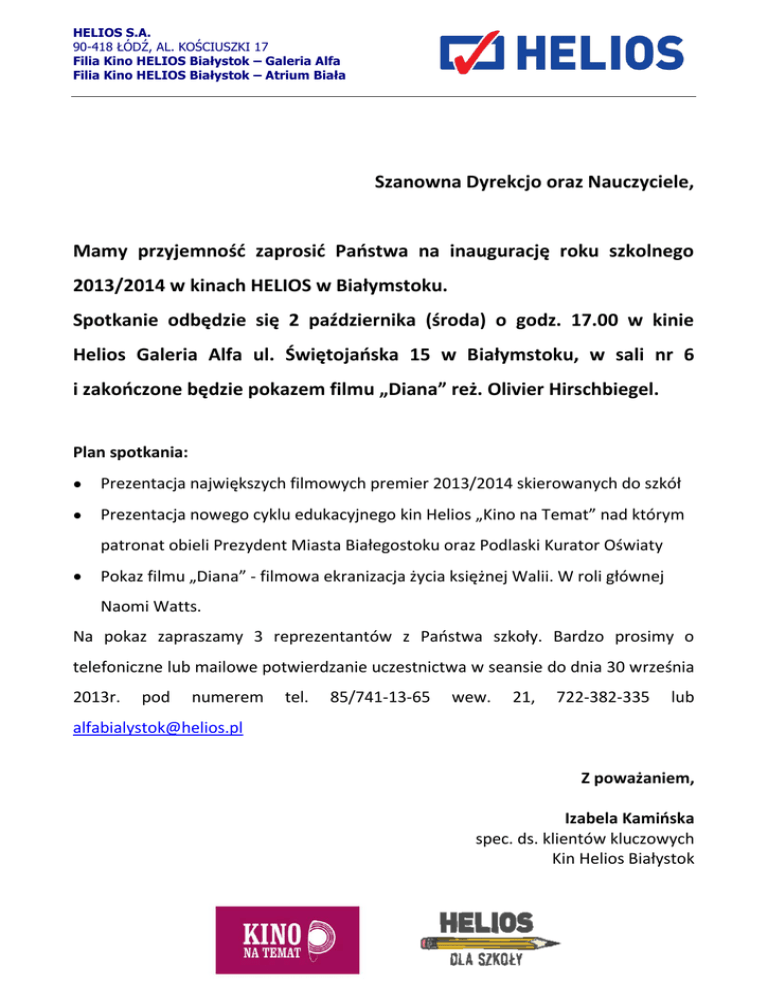 HELIOS S.A. 90-418 ŁÓDŹ, AL. KOŚCIUSZKI 17 Filia Kino HELIOS Białystok – Galeria Alfa Filia Kino HELIOS Białystok – Atrium Biała Szanowna Dyrekcjo oraz Nauczyciele, Mamy przyjemność zaprosić Państwa na inaugurację roku szkolnego 2013/2014 w kinach HELIOS w Białymstoku. Spotkanie odbędzie się 2 października (środa) o godz. 17.00 w kinie Helios Galeria Alfa ul. Świętojańska 15 w Białymstoku, w sali nr 6 i zakończone będzie pokazem filmu „Diana” reż. Olivier Hirschbiegel. Plan spotkania: Prezentacja największych filmowych premier 2013/2014 skierowanych do szkół Prezentacja nowego cyklu edukacyjnego kin Helios „Kino na Temat” nad którym patronat obieli Prezydent Miasta Białegostoku oraz Podlaski Kurator Oświaty Pokaz filmu „Diana” - filmowa ekranizacja życia księżnej Walii. W roli głównej Naomi Watts. Na pokaz zapraszamy 3 reprezentantów z Państwa szkoły. Bardzo prosimy o telefoniczne lub mailowe potwierdzanie uczestnictwa w seansie do dnia 30 września 2013r. pod numerem tel. 85/741-13-65 wew. 21, 722-382-335 lub [email protected] Z poważaniem, Izabela Kamińska spec. ds. klientów kluczowych Kin Helios Białystok