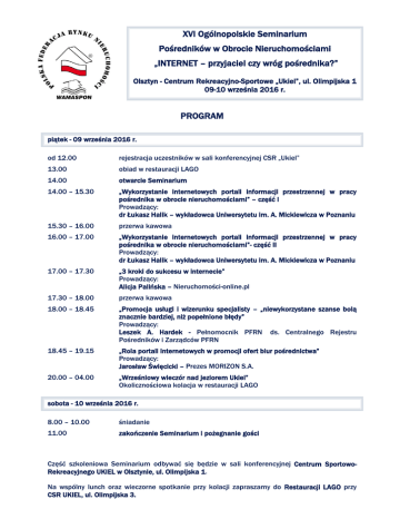 XVI Ogólnopolskie Seminarium Pośredników w Obrocie Nieruchomościami „INTERNET – przyjaciel czy wróg pośrednika?” Olsztyn - Centrum Rekreacyjno-Sportowe „Ukiel”, ul. Olimpijska 1 09-10 września 2016 r. PROGRAM piątek - 09 września 2016 r. od 12.00 rejestracja uczestników w sali konferencyjnej CSR „Ukiel” 13.00 obiad w restauracji LAGO 14.00 otwarcie Seminarium 14.00 – 15.30 „Wykorzystanie internetowych portali informacji przestrzennej w pracy pośrednika w obrocie nieruchomościami” – część I Prowadzący: dr Łukasz Halik – wykładowca Uniwersytetu im. A. Mickiewicza w Poznaniu 15.30 – 16.00 przerwa kawowa 16.00 – 17.00 „Wykorzystanie internetowych portali informacji przestrzennej w pracy pośrednika w obrocie nieruchomościami”- część II Prowadzący: dr Łukasz Halik – wykładowca Uniwersytetu im. A. Mickiewicza w Poznaniu 17.00 – 17.30 „3 kroki do sukcesu w internecie” Prowadzący: Alicja Palińska – Nieruchomości-online.pl 17.30 – 18.00 przerwa kawowa 18.00 – 18.45 „Promocja usługi i wizerunku specjalisty – „niewykorzystane szanse bolą znacznie bardziej, niż popełnione błędy” Prowadzący: Leszek A. Hardek - Pełnomocnik PFRN ds. Centralnego Rejestru Pośredników i Zarządców PFRN 18.45 – 19.15 „Rola portali internetowych w promocji ofert biur pośrednictwa” Prowadzący: Jarosław Święcicki – Prezes MORIZON S.A. 20.00 – 04.00 „Wrześniowy wieczór nad jeziorem Ukiel” Okolicznościowa kolacja w restauracji LAGO sobota - 10 września 2016 r. 8.00 – 10.00 śniadanie 11.00 zakończenie Seminarium i pożegnanie gości Część szkoleniowa Seminarium odbywać się będzie w sali konferencyjnej Centrum SportowoRekreacyjnego UKIEL w Olsztynie, ul. Olimpijska 1. Na wspólny lunch oraz wieczorne spotkanie przy kolacji zapraszamy do Restauracji LAGO przy CSR UKIEL, ul. Olimpijska 3.