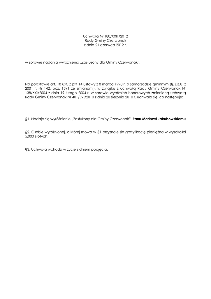 Uchwała Nr 180/XXIII/2012 Rady Gminy Czerwonak z dnia 21 czerwca 2012 r. w sprawie nadania wyróŜnienia „ZasłuŜony dla Gminy Czerwonak”. Na podstawie art. 18 ust. 2 pkt 14 ustawy z 8 marca 1990 r. o samorządzie gminnym (tj. Dz.U. z 2001 r. Nr 142, poz. 1591 ze zmianami), w związku z uchwałą Rady Gminy Czerwonak Nr 138/XXI/2004 z dnia 19 lutego 2004 r. w sprawie wyróŜnień honorowych zmienioną uchwałą Rady Gminy Czerwonak Nr 401/LVI/2010 z dnia 20 sierpnia 2010 r. uchwala się, co następuje: §1. Nadaje się wyróŜnienie „ZasłuŜony dla Gminy Czerwonak” Panu Markowi Jakubowskiemu §2. Osobie wyróŜnionej, o której mowa w §1 przyznaje się gratyfikację pienięŜną w wysokości 5.000 złotych. §3. Uchwała wchodzi w Ŝycie z dniem podjęcia. Uzasadnienie projektu uchwały Rady Gminy Czerwonak z dnia 21 czerwca 2012 r. w sprawie nadania wyróŜnienia „ZasłuŜony dla Gminy Czerwonak”. Z wnioskiem o nadanie wyróŜnienia Panu Markowi Jakubowskiemu wystąpiło 10 radnych. Pan Marek Jakubowski prowadzi Studio Tyflografiki i Grafiki Komputerowej „TYFLOGRAF”. Jest od 30 lat tyflopedagogiem w Ośrodku dla Dzieci Niewidomych w Owińskach i mieszkańcem Gminy Czerwonak. Twórca polskiej czcionki brajlowskiej Poland Braille Fonts stosowanej powszechnie przy projektowaniu opakowań z nadrukiem brajla oraz w opracowaniach tyflokartograficznych i tyflograficznych. Od lat zajmuje się nowoczesnymi technologiami pozwalającymi przybliŜyć osobom niewidomym i słabo widzącym otaczającą ich rzeczywistość. Współautor z Panią Aliną Talukder stosowanych aktualnie w Kraju i Europie technologii wykonywania tyflografik oraz map i planów wypukłych dla niewidomych i słabo widzących. Według opracowanej (w kierowanym przez niego zespole) technologii „papieru puchnącego” powstawały w Polsce, wydane przez Główny Urząd Geodezji i Kartografii i Polski Związek Niewidomych : Atlas Polski, Plan Warszawy, Atlas Europy, mapy Armenii, Ukrainy czy Gruzji. Powołany przez Głównego Geodetę Kraju na członka zespołu konsultacyjnego ds. map dla niewidomych współpracował jako tyflografik oraz członek zespołu konsultacyjnego przy tworzeniu Geograficznego Atlasu Polski, Planu Warszawy oraz Geograficznego Atlasu Europy dla Niewidomych i Słabo widzących w opracowanej przez siebie technologii. We wszystkich tych projektach jego Studio Tyflografiki zajmowało się takŜe drukowaniem ( zarówno płaskim jak i tłoczeniem reliefowym) w/w opracowań tyflokartograficznych Opracował kompleksowe załoŜenia nowej technologii (sitodruku wypukłego) wykonywania map i planów dla inwalidów wzroku, pozwalającej w równej mierze osobom niewidomym jak i słabo widzącym odbierać rzeczywistość tyflograficzną i tyflokartograficzną. Jest współautorem załoŜeń merytorycznych oraz autorem opracowań tyflograficznych wydanego w tej właśnie technologii opracowania Planu Komunikacyjnego Miasta Poznania – pierwszego tego typu kompleksowego wydawnictwa w Kraju. Autor koncepcji kompleksowego przystosowywania przestrzeni dla niewidomych. Według tej autorskiej koncepcji wykonał przystosowania Ogrodu Botanicznego Polskiej Akademii Nauk w Powsinie dla potrzeb ludzi z dysfunkcjami wzroku. Twórca i wykonawca koncepcji przystosowania przestrzeni Ogrodu Sensualnego Arboretum w Bolestraszycach dla potrzeb niewidomych i słabo widzących oraz Leśnego Ogrodu Edukacyjnego w Puszczy Noteckiej dla potrzeb osób z dysfunkcjami wzroku. Na potrzeby stojących planów reliefowych i tyflomap ściennych opracował autorską technologię płukania polimerowego. Opracował technologię pozwalającą wykonywać oznakowania przestrzeni budynków dla niewidomych i słabowidzących. Zajmuje się historią tyflokartografii. W Owińskach znajduje się od niedawna jedyne w Polsce Muzeum Tyflograficzne. Posiada kolekcję ponad 300 eksponatów i obiektów związanych z kulturą i edukacją niewidomych, m.in. najstarsze masowo wydawane mapy tyflologiczne M. Kunza z Illzach z roku 1886, pierwszy Atlas Świata dla niewidomych z roku 1932 oraz dziesiątki przedstawień tyflokartograficznych wydawanych na całym świecie. Na uwagę zasługuje takŜe kolekcja map ściennych Polski, Europy oraz Świata. Porównywalne zbiory moŜna znaleźć m.in. w Wiedniu, Petersburgu czy Madrycie. Zwiedzający mogą równieŜ obejrzeć przedmioty, które słuŜą niewidomym w Ŝyciu codziennym np. urządzenie do rozpoznawania kolorów oraz maszyny do pisania. RównieŜ dzięki m.in. jego pracy w tym roku we wrześniu zostanie otwarty w Owińskach pierwszy w Europie Park Orientacji Przestrzennej. Wielokrotnie nagradzany nagrodami Ministra Edukacji Narodowej. Laureat Medalu Komisji Edukacji Narodowej. Laureat I nagrody Ministra Infrastruktury w 2006 roku za wybitne osiągnięcia w dziedzinie kartografii. Odznaczony srebrną odznaką Polskiego Związku Niewidomych. Kawaler Orderu Uśmiechu. Działalność i dokonania Pana Marka Jakubowskiego przyczyniają się do szerokiej promocji Ośrodka dla Dzieci Niewidomych w Owińskach, miejscowości Owińska oraz Gminy Czerwonak nie tylko w regionie i całej Polsce, ale takŜe poza granicami naszego kraju.