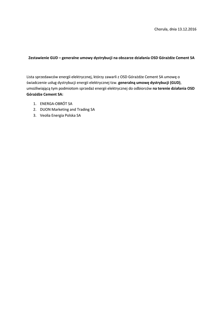 Chorula, dnia 13.12.2016 Zestawienie GUD – generalne umowy dystrybucji na obszarze działania OSD Górażdże Cement SA Lista sprzedawców energii elektrycznej, którzy zawarli z OSD Górażdże Cement SA umowę o świadczenie usług dystrybucji energii elektrycznej tzw. generalną umowę dystrybucji (GUD), umożliwiającą tym podmiotom sprzedaż energii elektrycznej do odbiorców na terenie działania OSD Górażdże Cement SA: 1. ENERGA-OBRÓT SA 2. DUON Marketing and Trading SA 3. Veolia Energia Polska SA